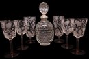 Crystal and sterling decanter 9.5"H and 1950's hand blown etched glasses with red bottoms 2-6.25"H and 4-6"H- SHIPPABLE
