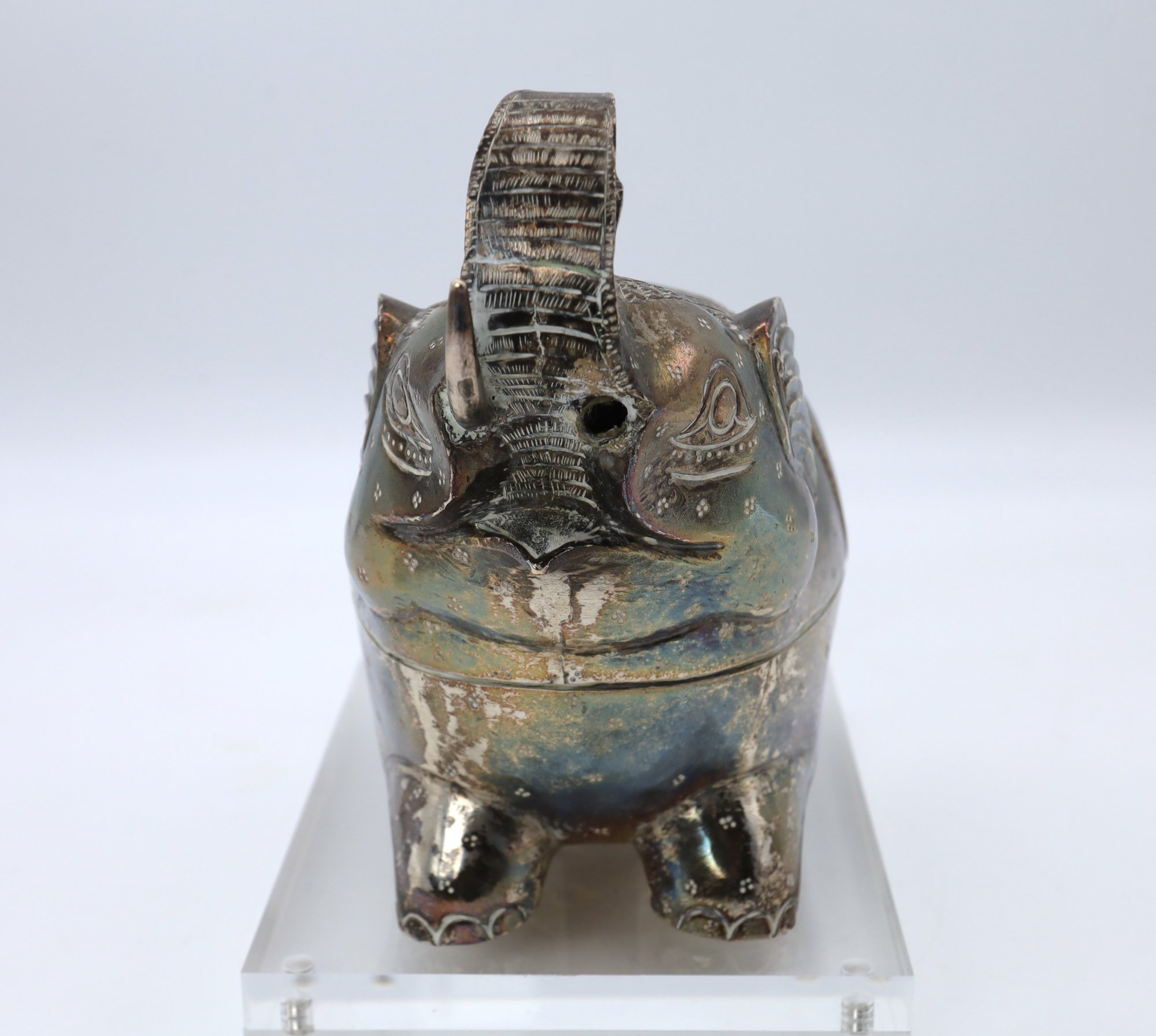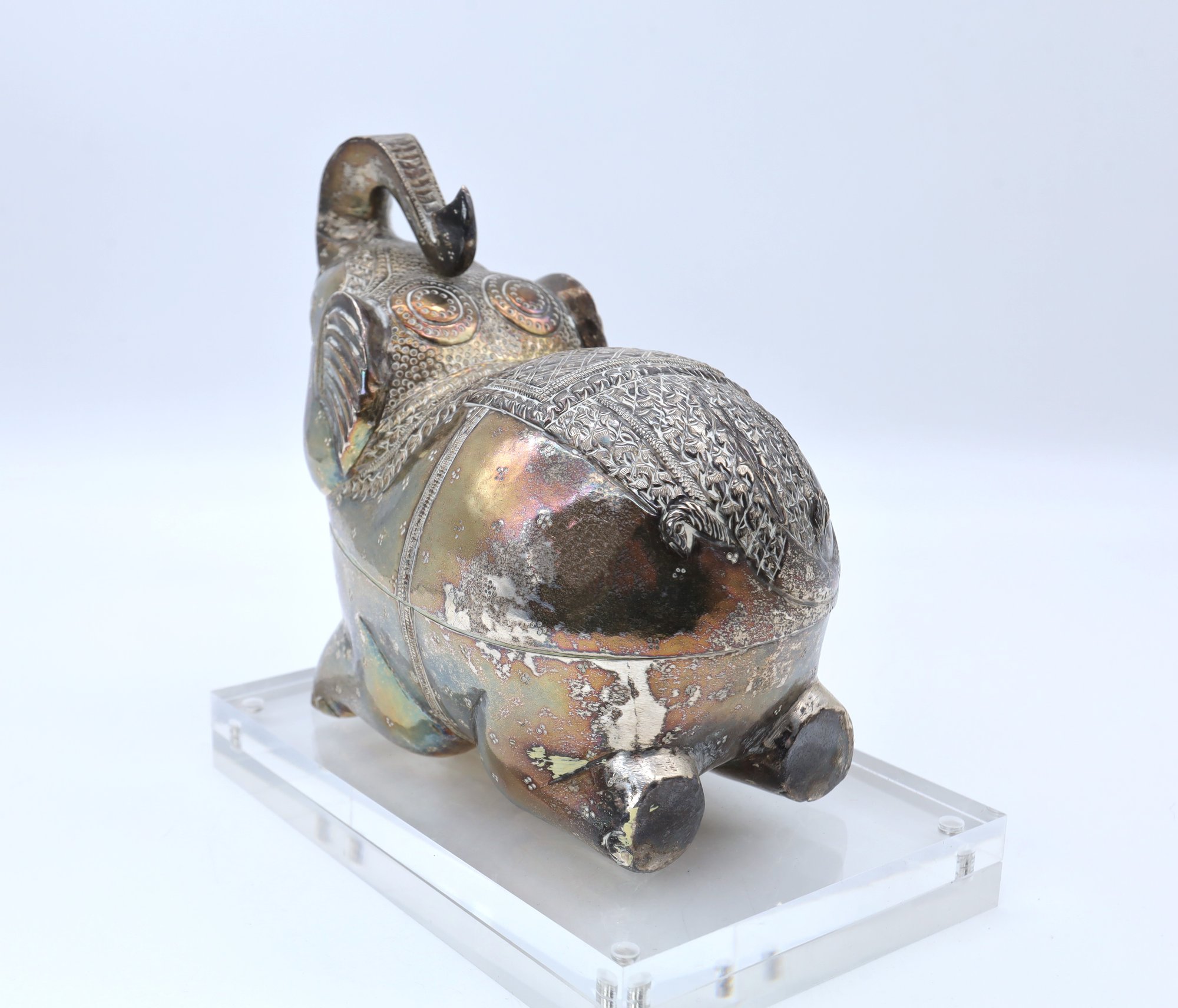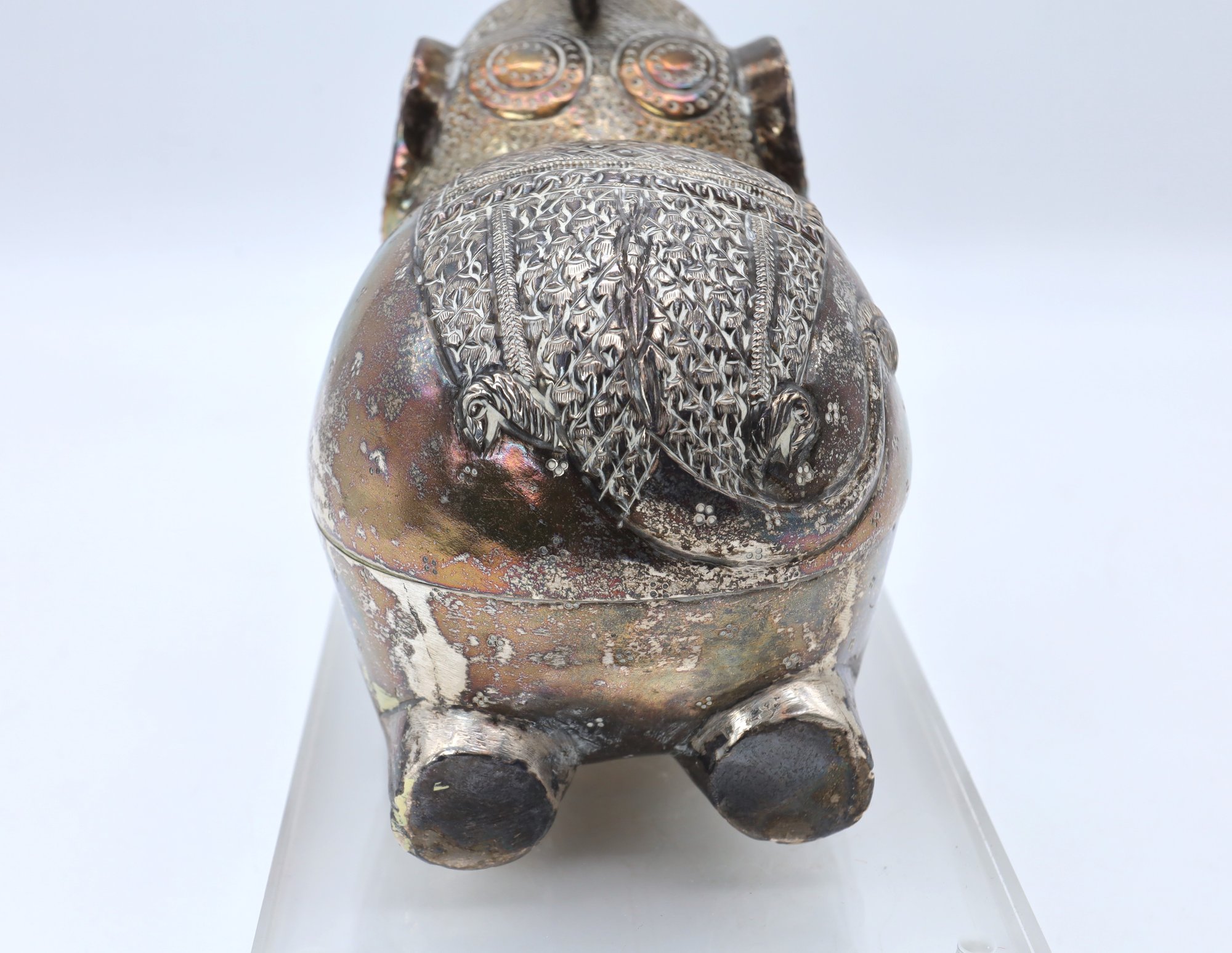 Cambodian elephant-shaped betel nut box made of 900 silver, weighing 7 troy ounces and missing one tusk. Cannot be opened. From a private collection in Manhattan.