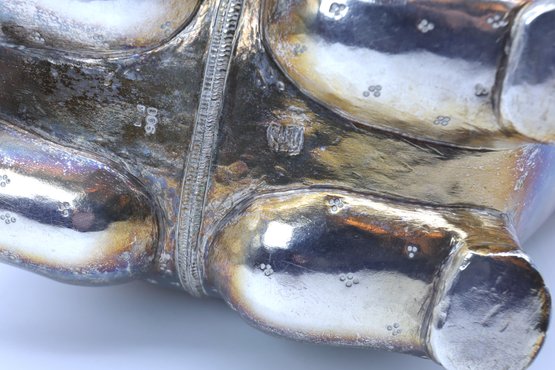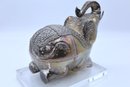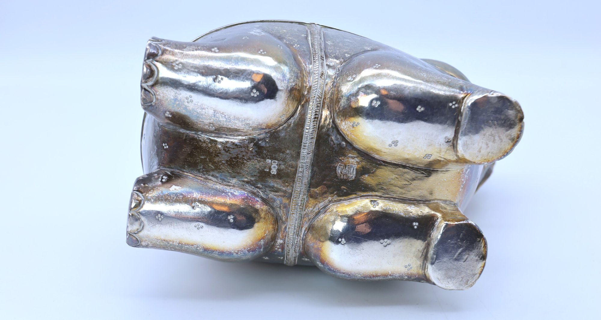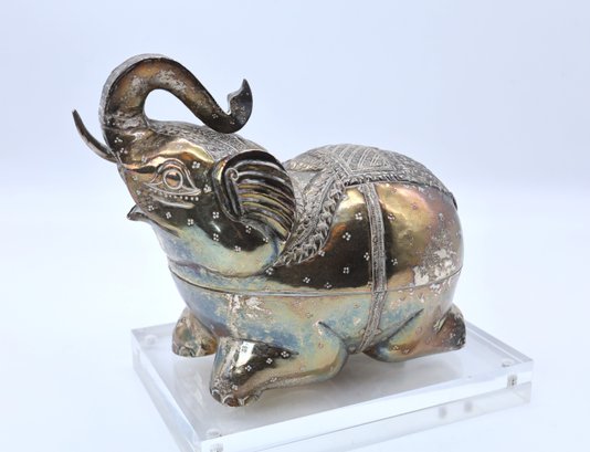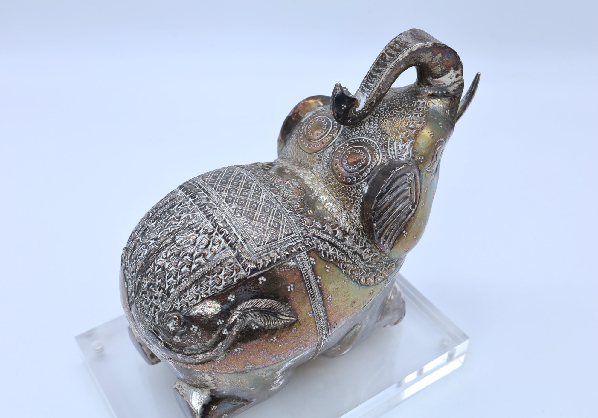 Cambodian elephant-shaped betel nut box made of 900 silver, weighing 7 troy ounces and missing one tusk. Cannot be opened. From a private collection in Manhattan.