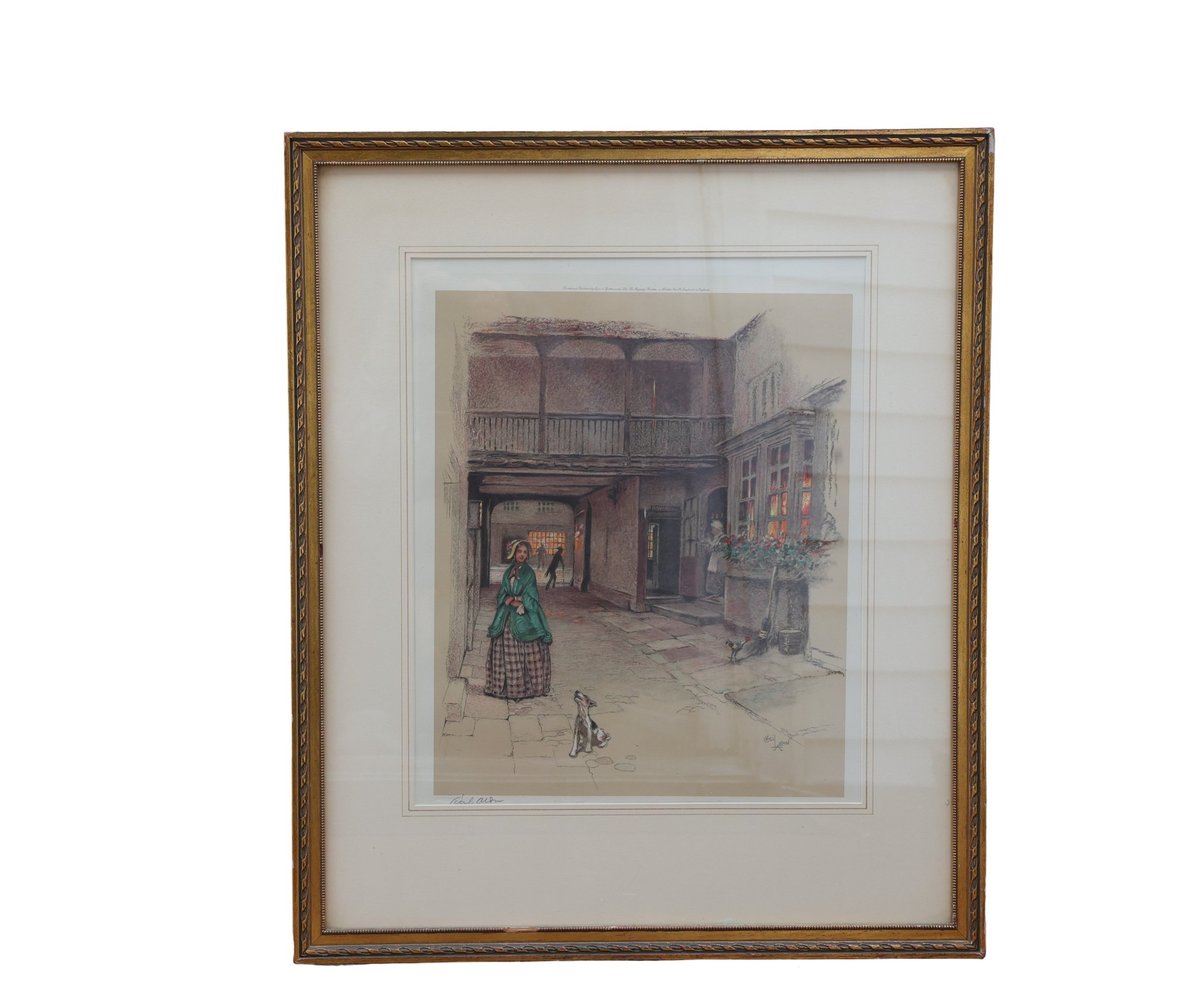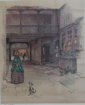 The artwork shows an inn courtyard scene featuring a woman, a dog, and background figures, typical of a Dickens setting.