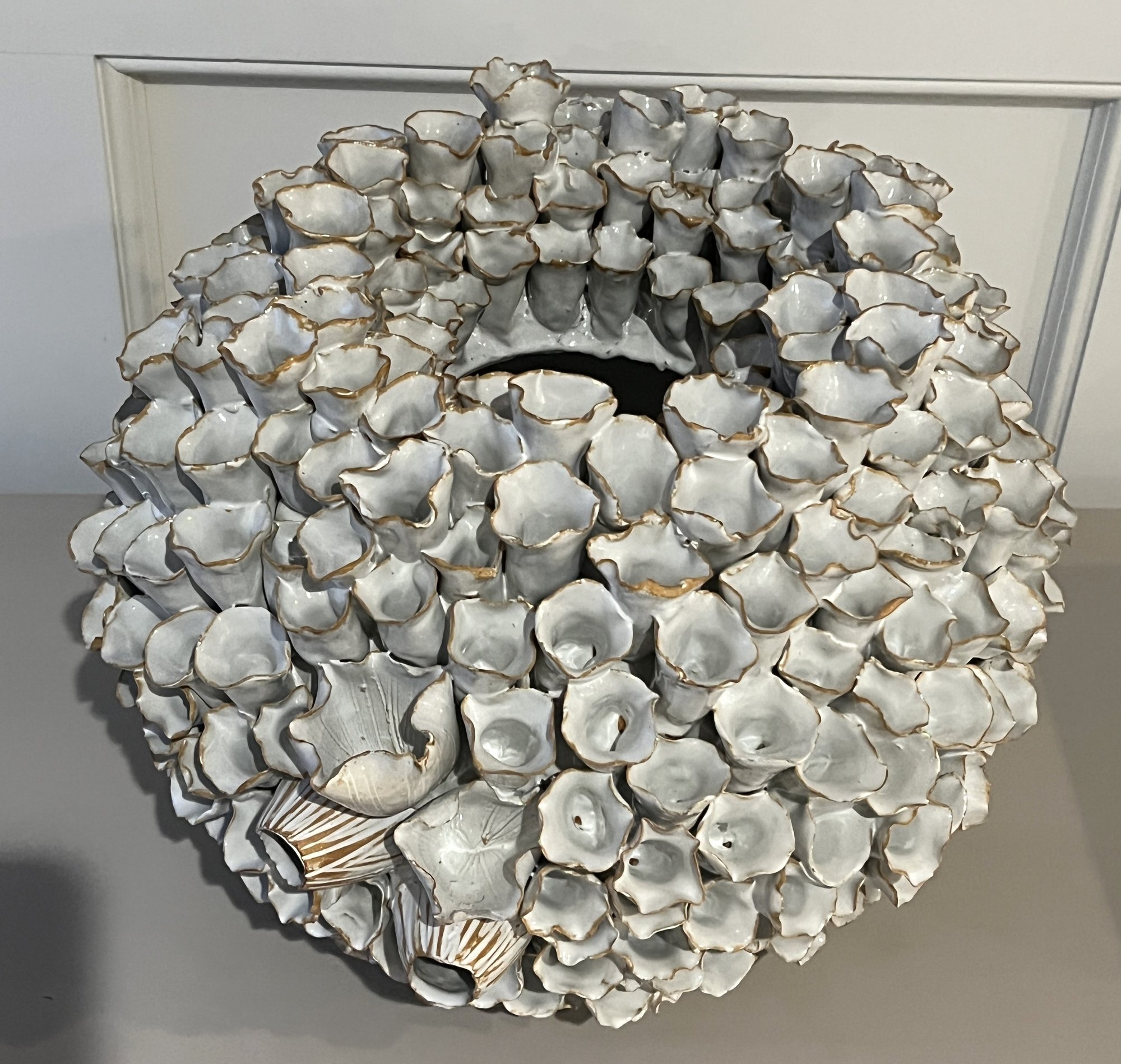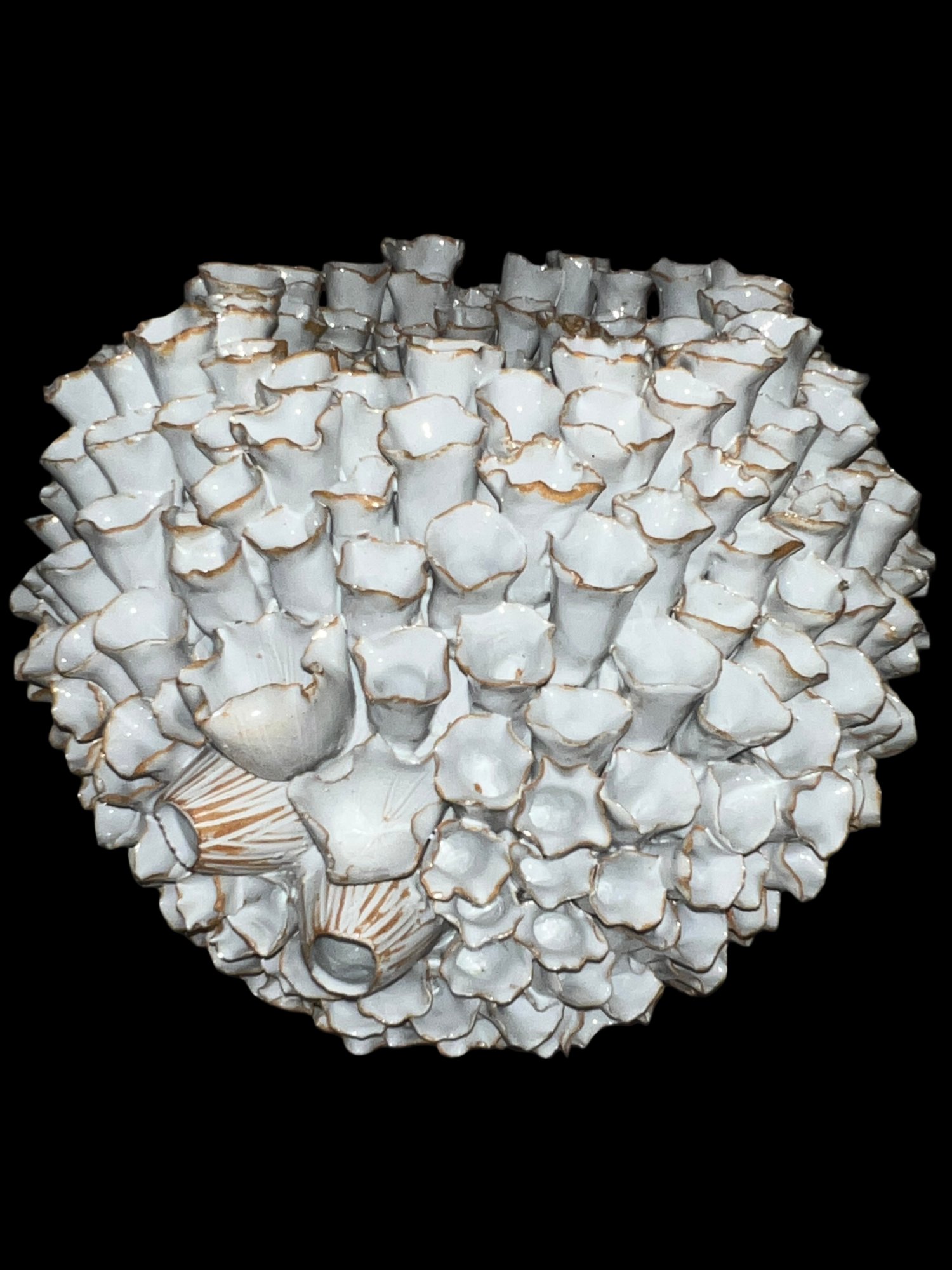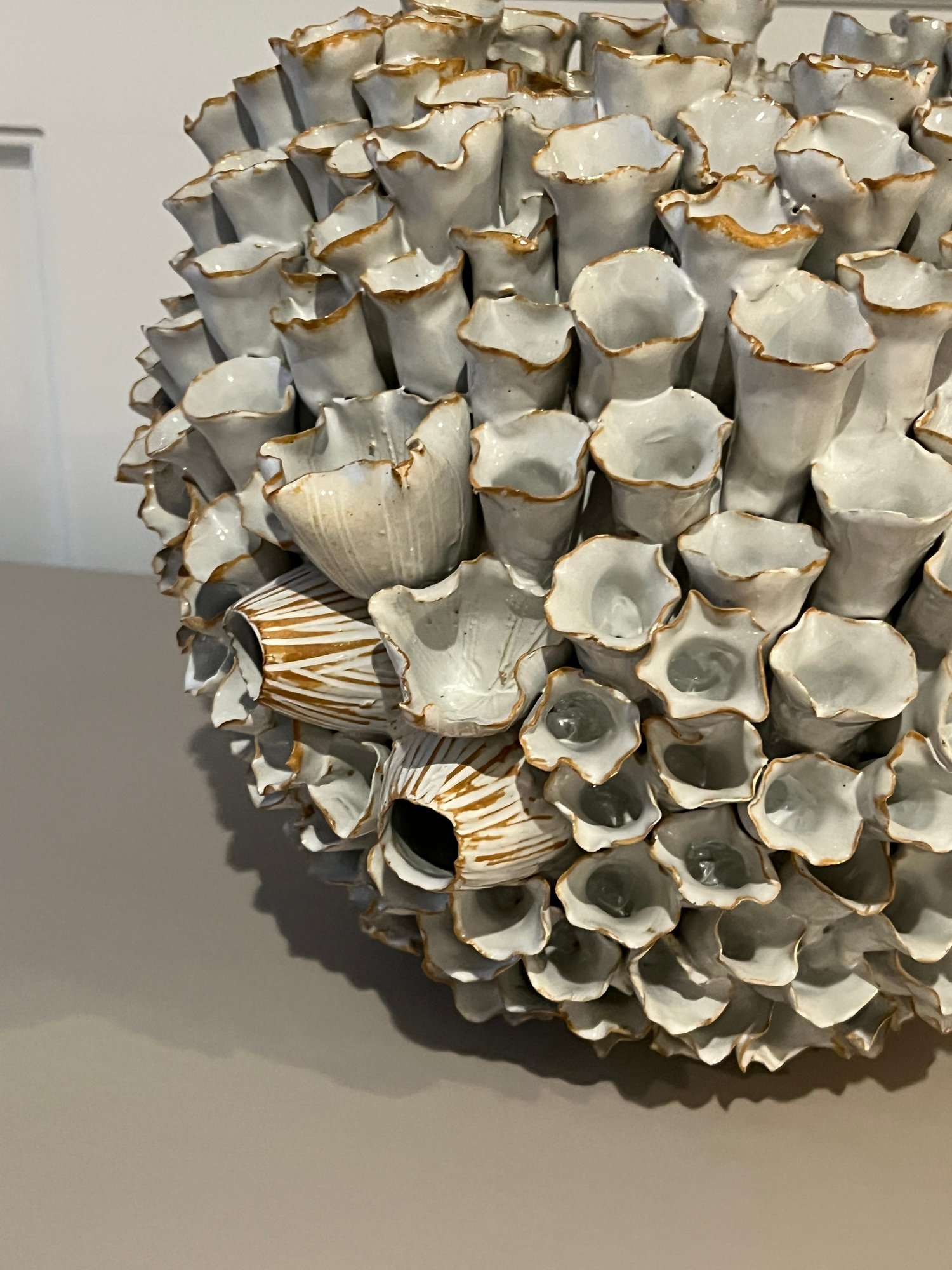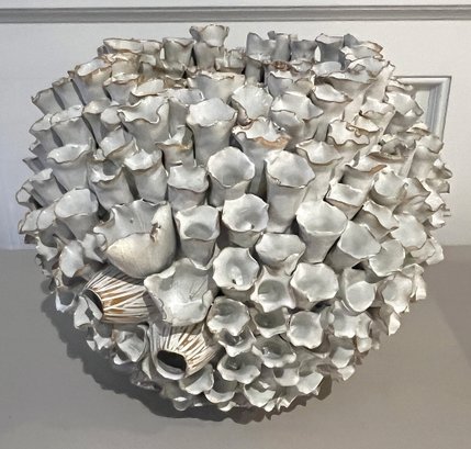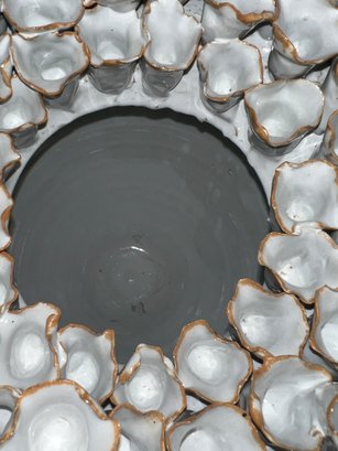 Ceramic round barnacle vase white finish by Tozai. Nice condition