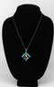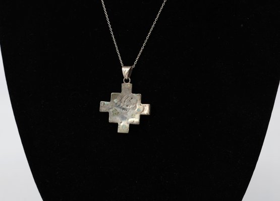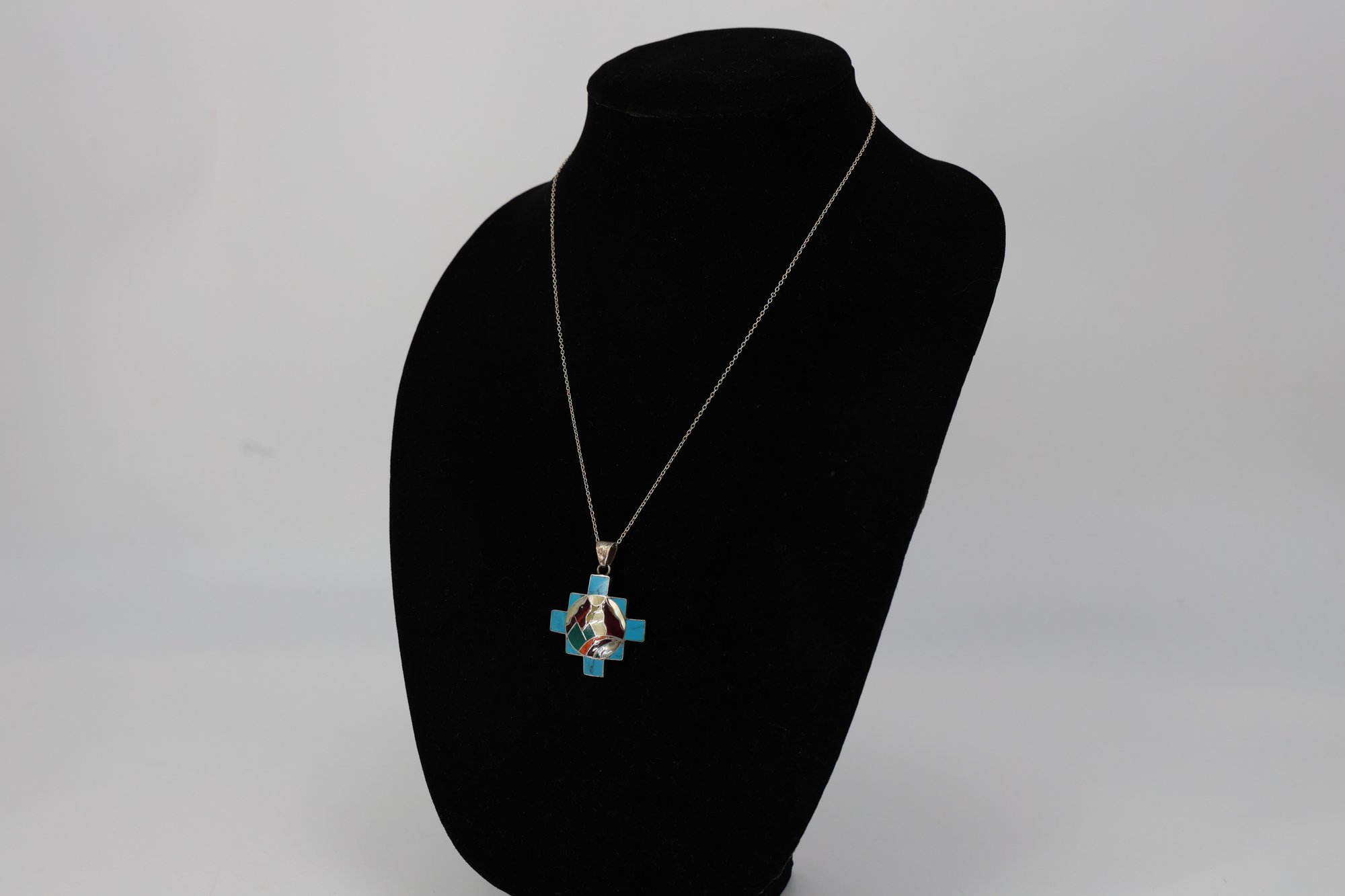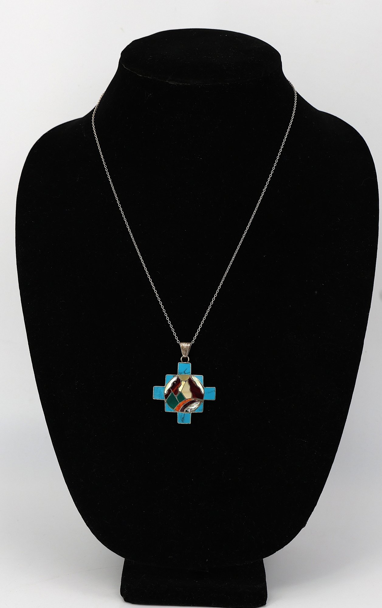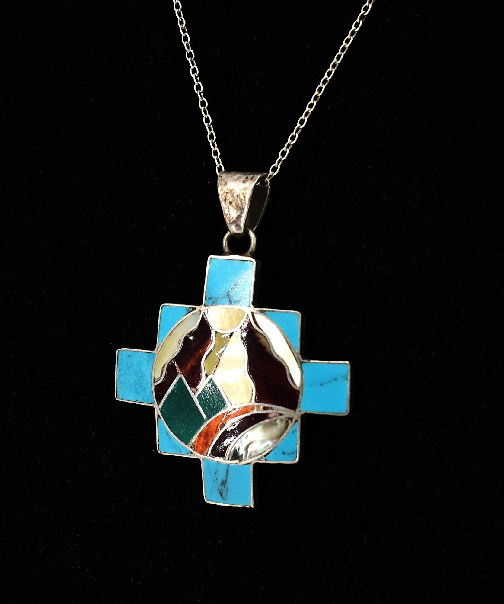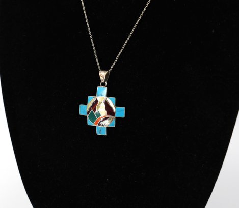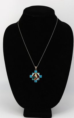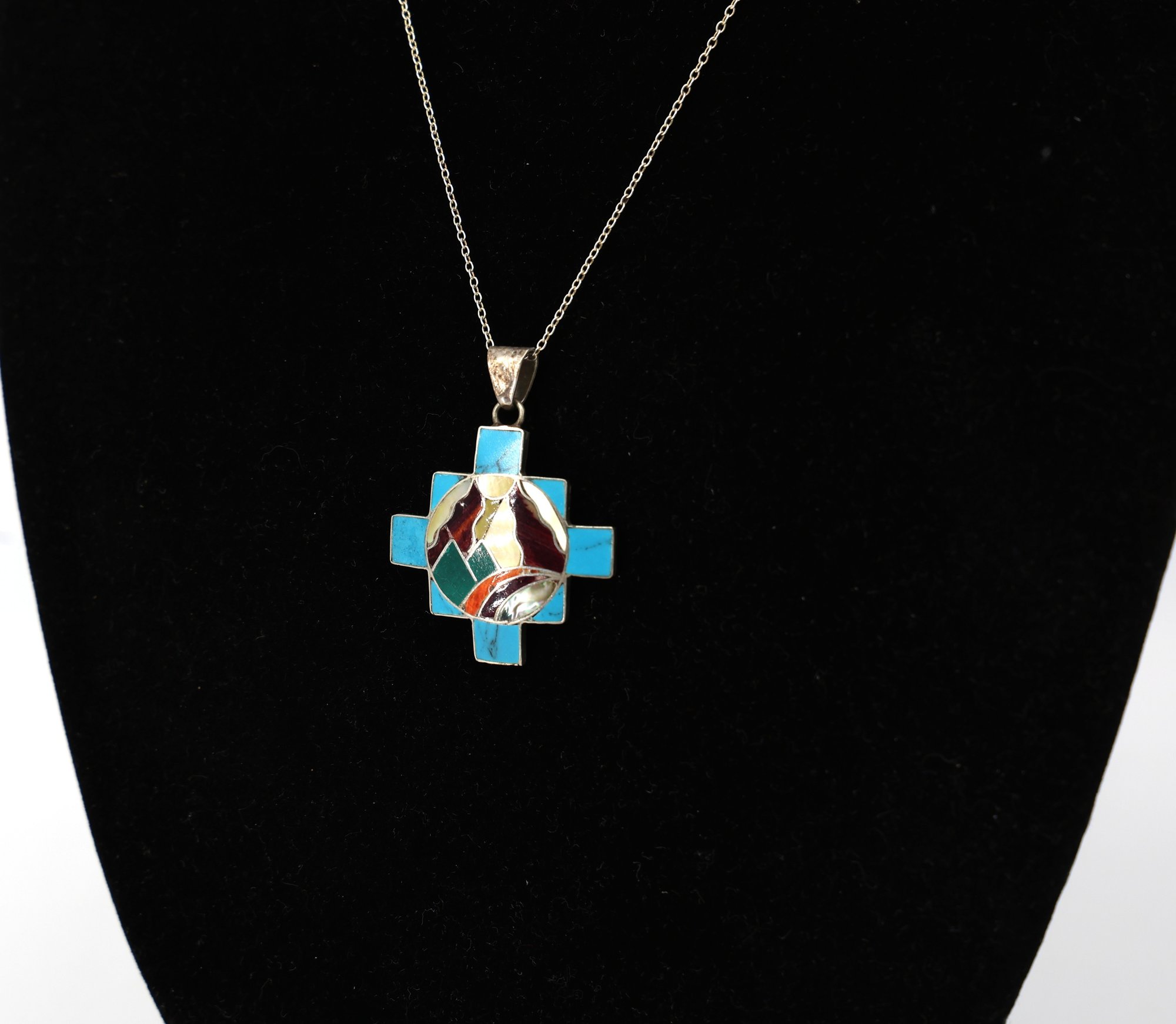 Handmade 950 silver Peruvian Chakana (Inca Cross) pendant with turquoise and other gemstone inlay. 20"L