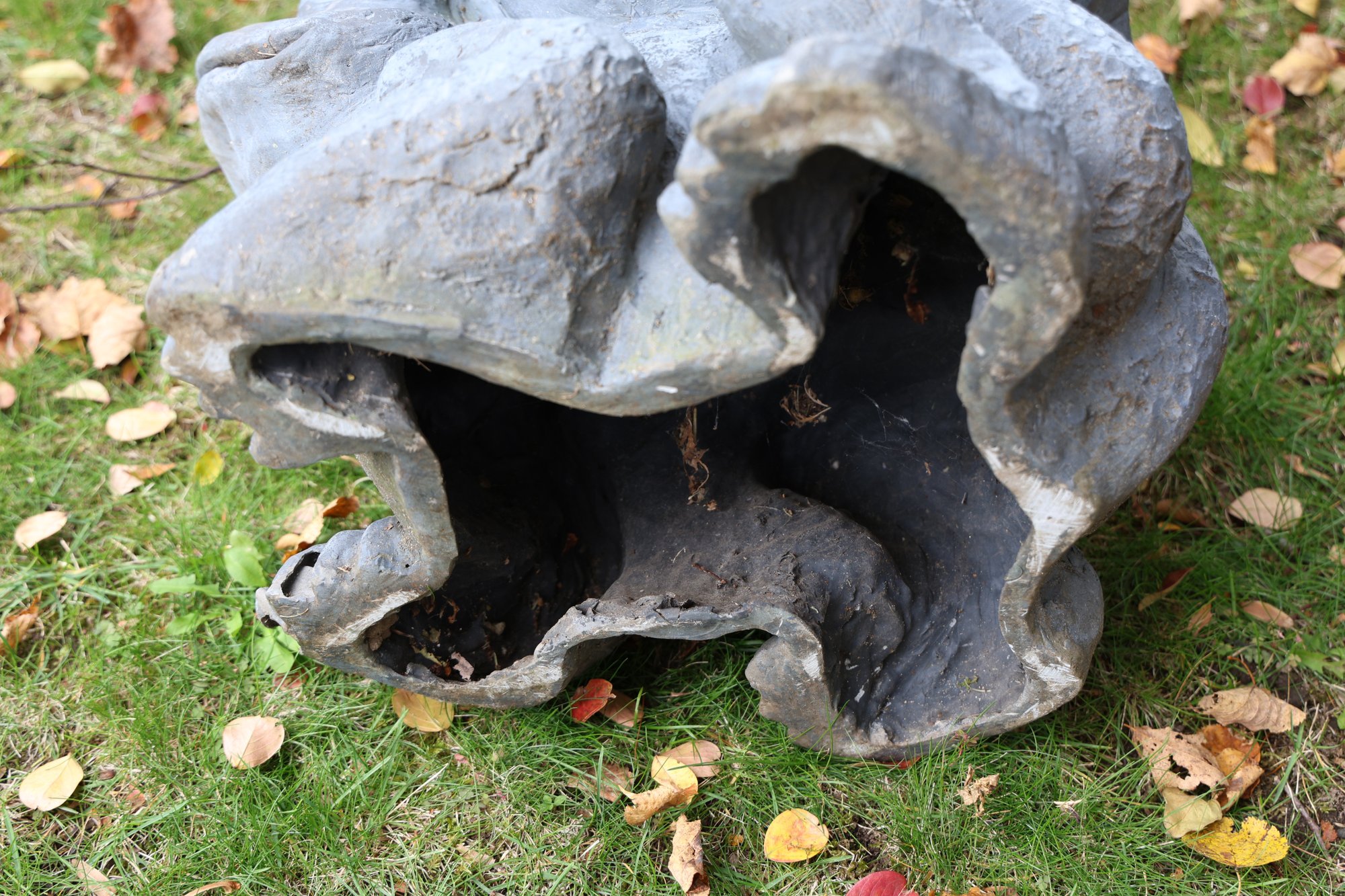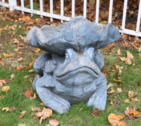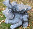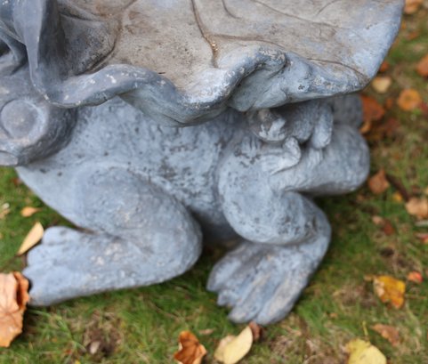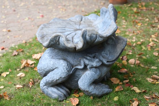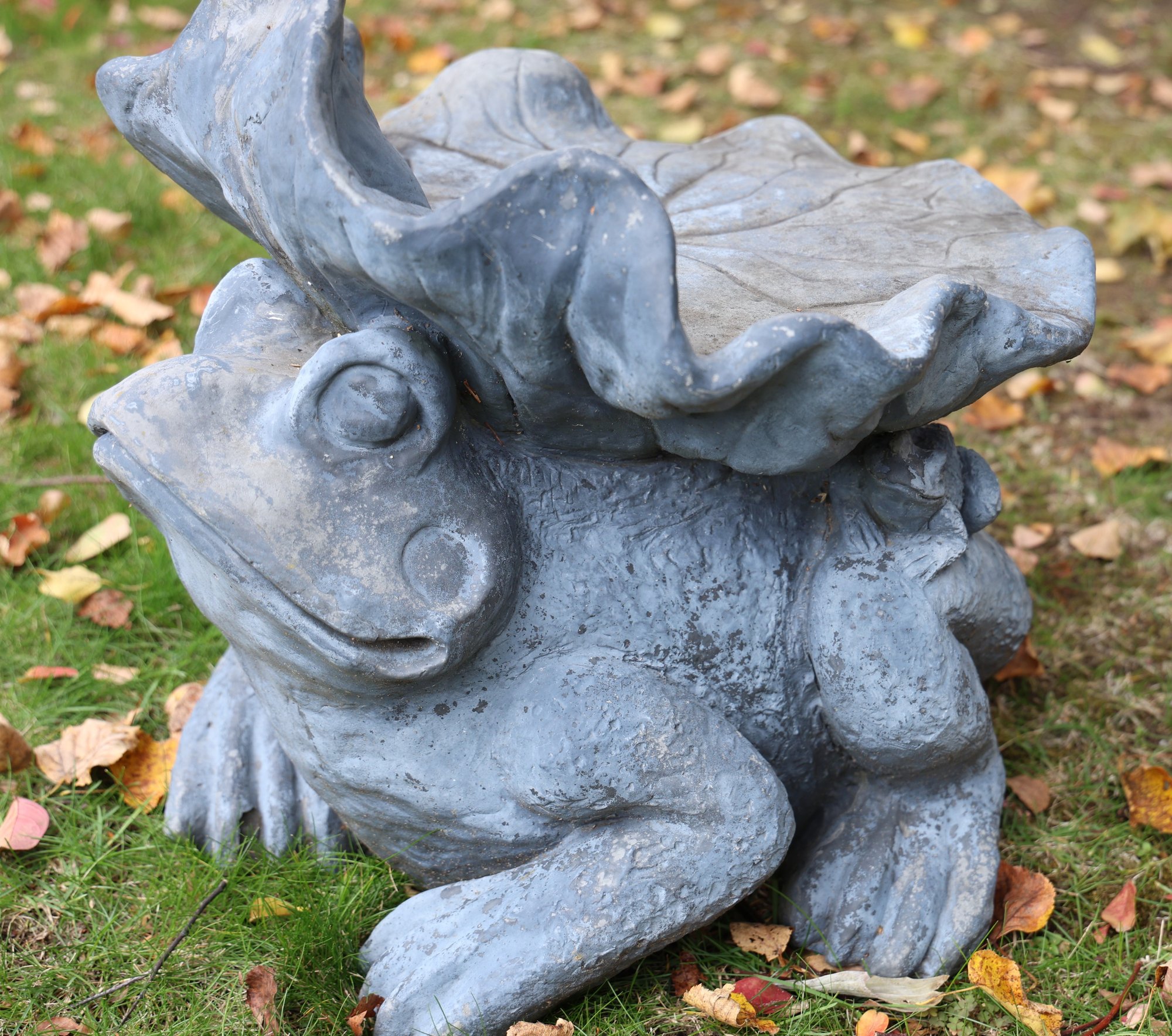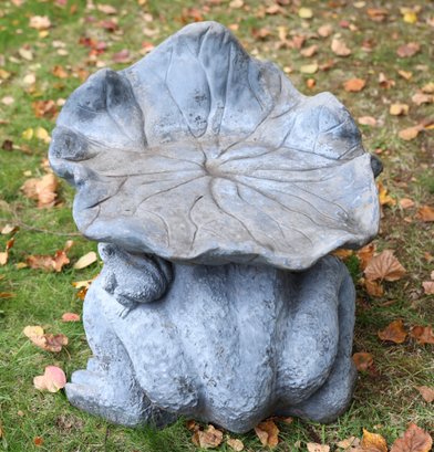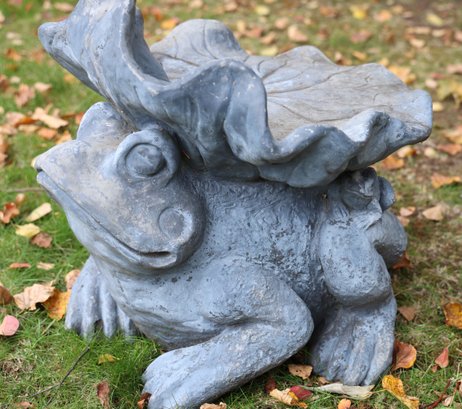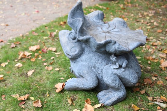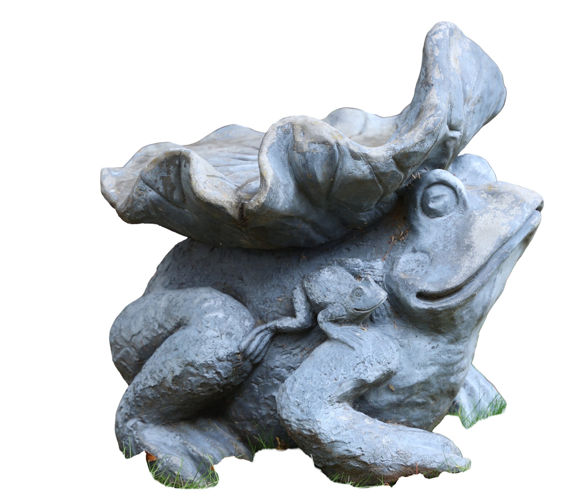 This charming frog with a Lilypad and two baby frogs is a terrific planter for indoors or outdoors. This piece has substantial weight and size. Well executed and meticulously hand cast and hand finished patina in an extremely durable cast stone. Use as a side table, planter or decor in the garden.