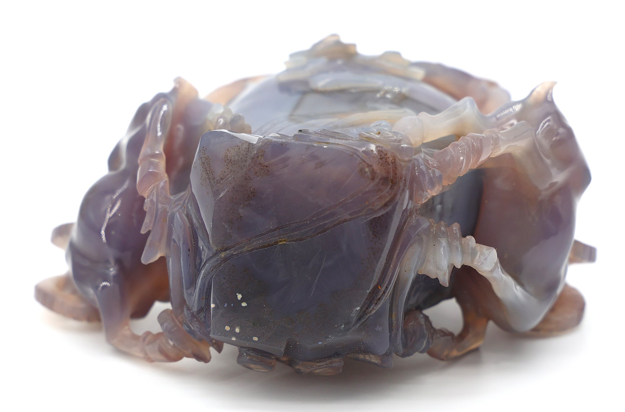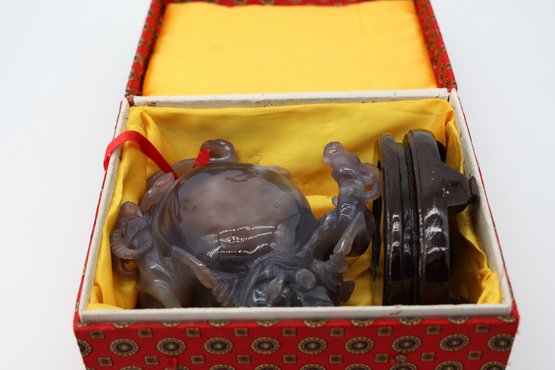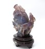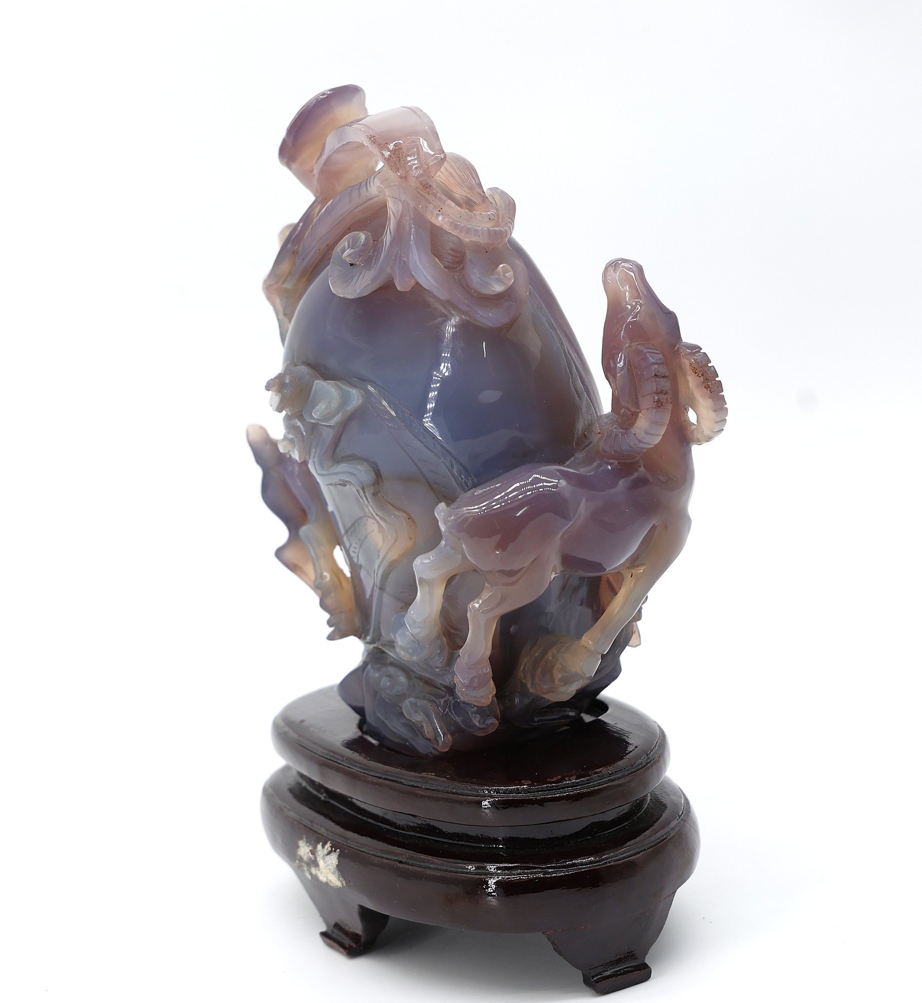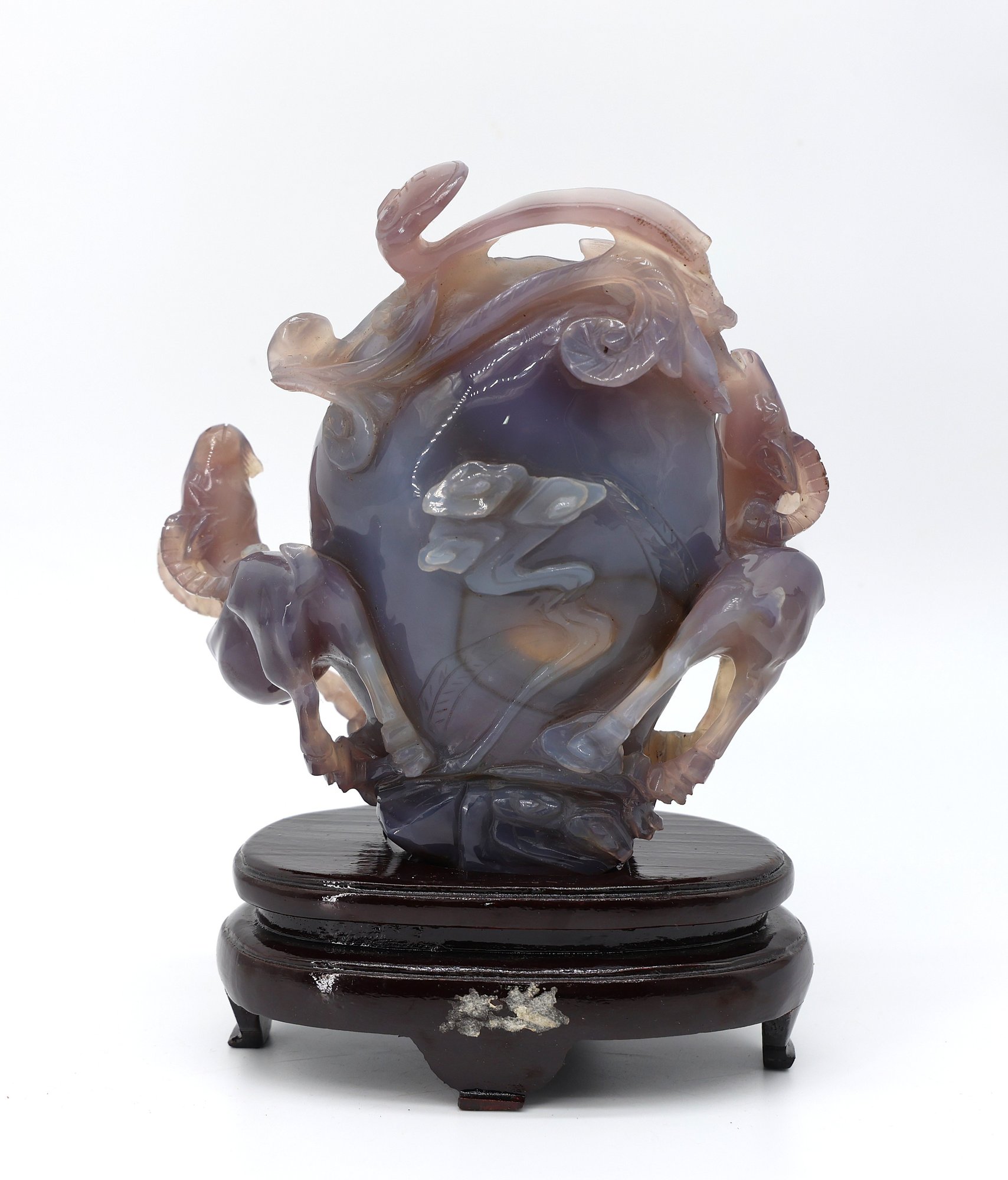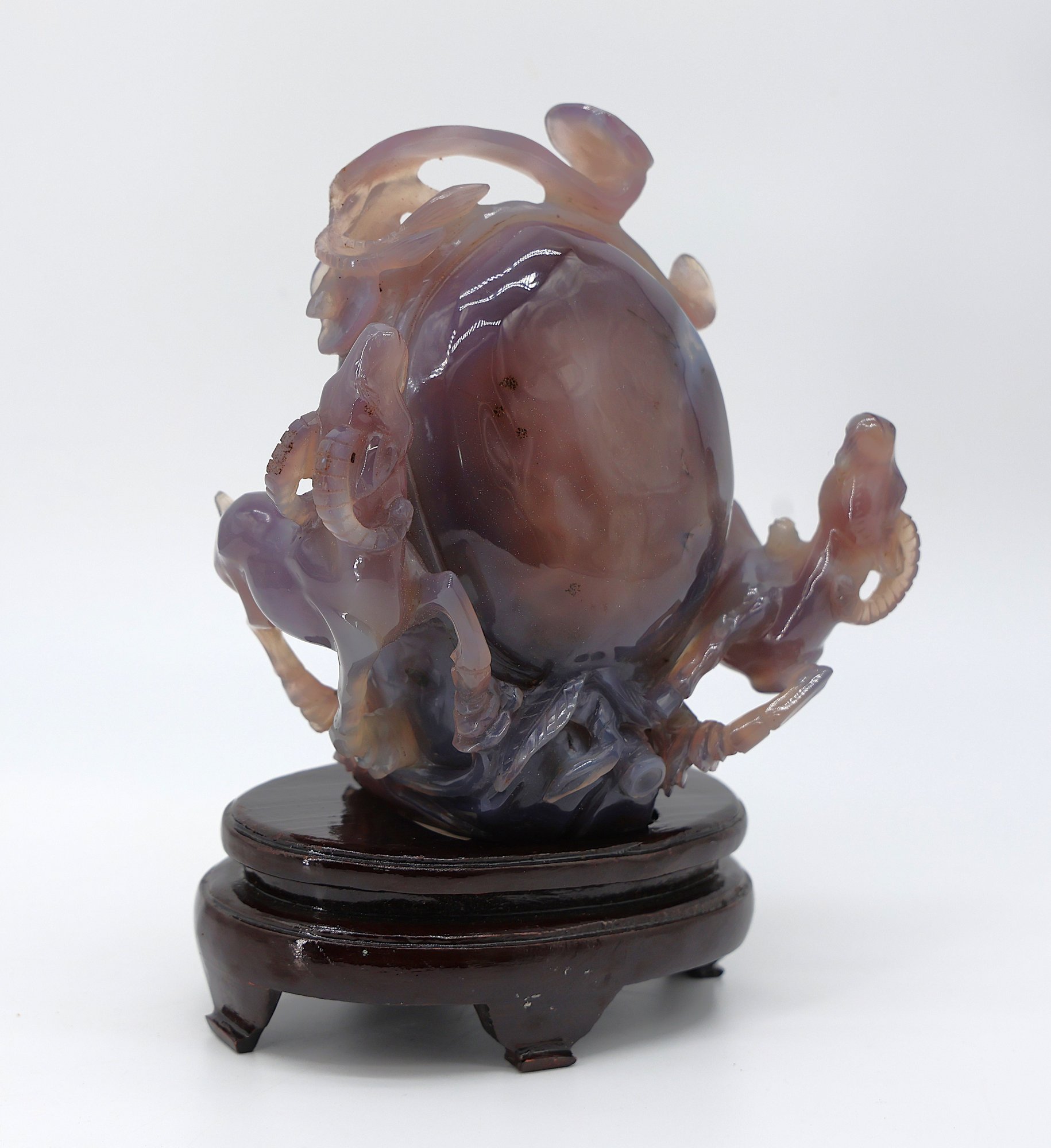 Multicolored chalcedony agate, also referred to as purple jade. Sculpture features aTea egg surrounded by rams. This is referring to a Chinese Fable. 7"W x 7"H