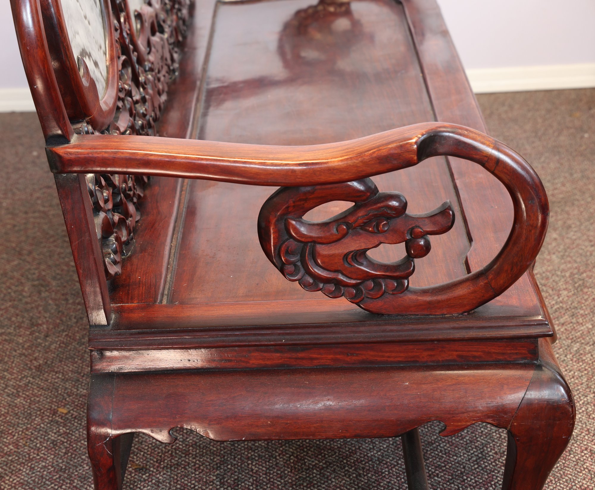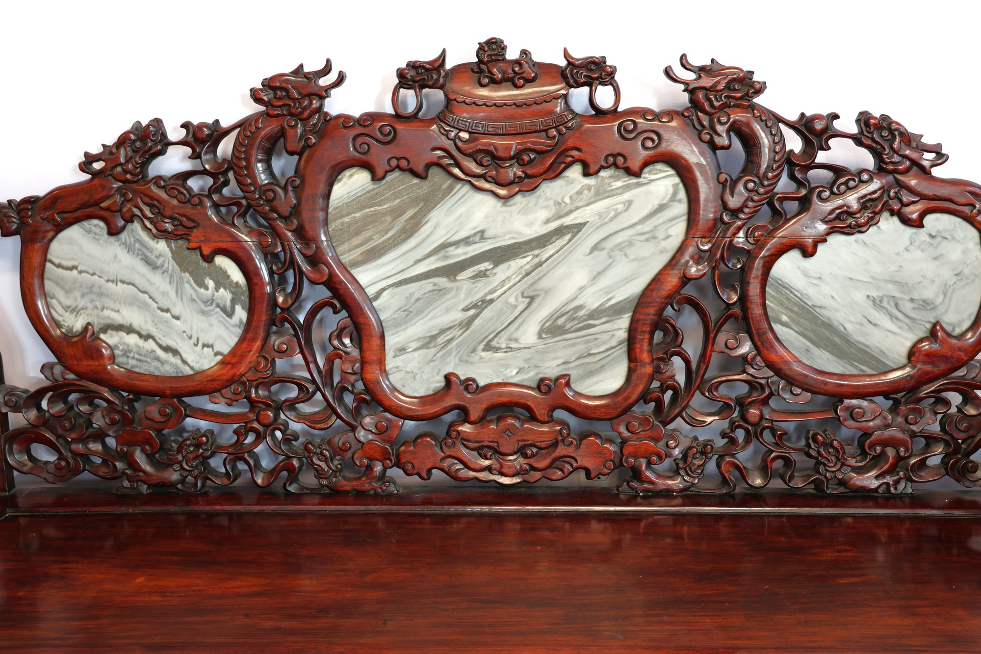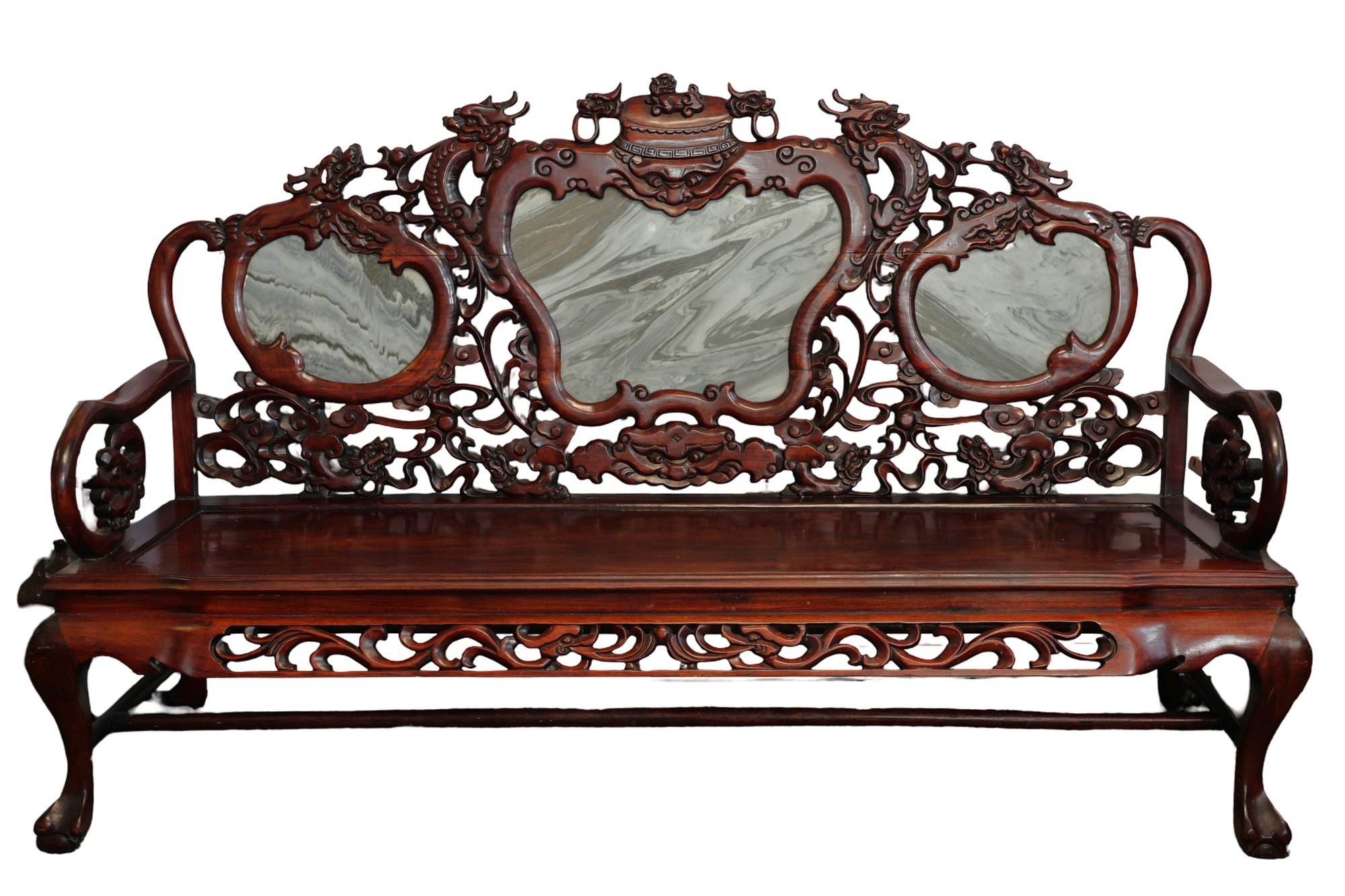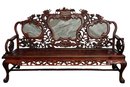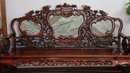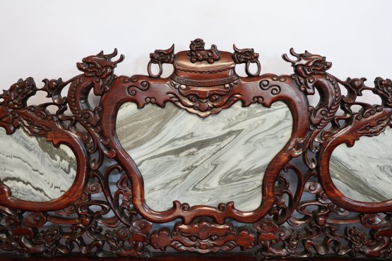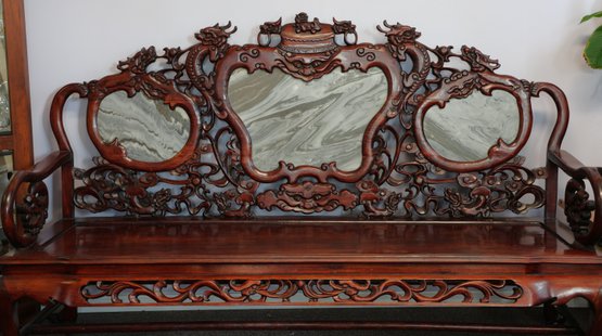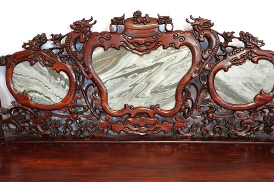 This 20th-century Chinese carved redwood bench or settee features marble inserts. It showcases detailed high-relief carvings of traditional Chinese folk art motifs such as dragons and scrolling floral patterns. The backrest has three cartouches that hold naturally veined marble panels, often called "dream-stones." Made from solid redwood , it is known for its weight and durability. The design is enhanced with ornate armrests and a carved apron at the seat's front.