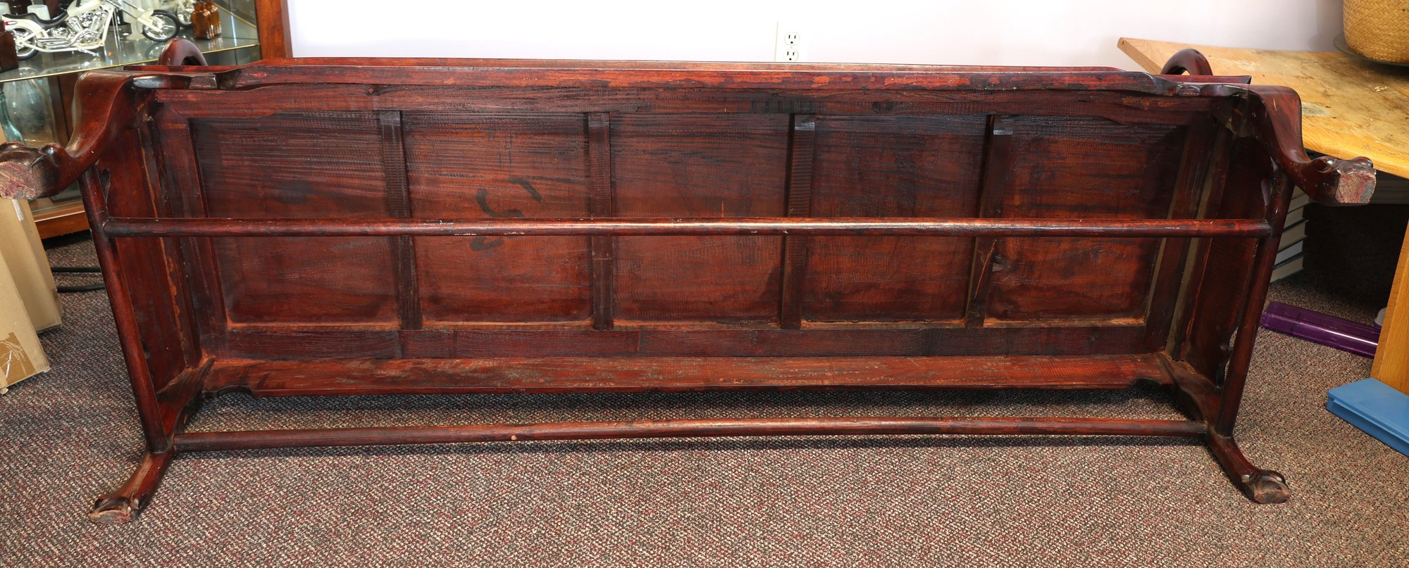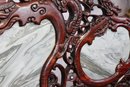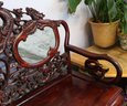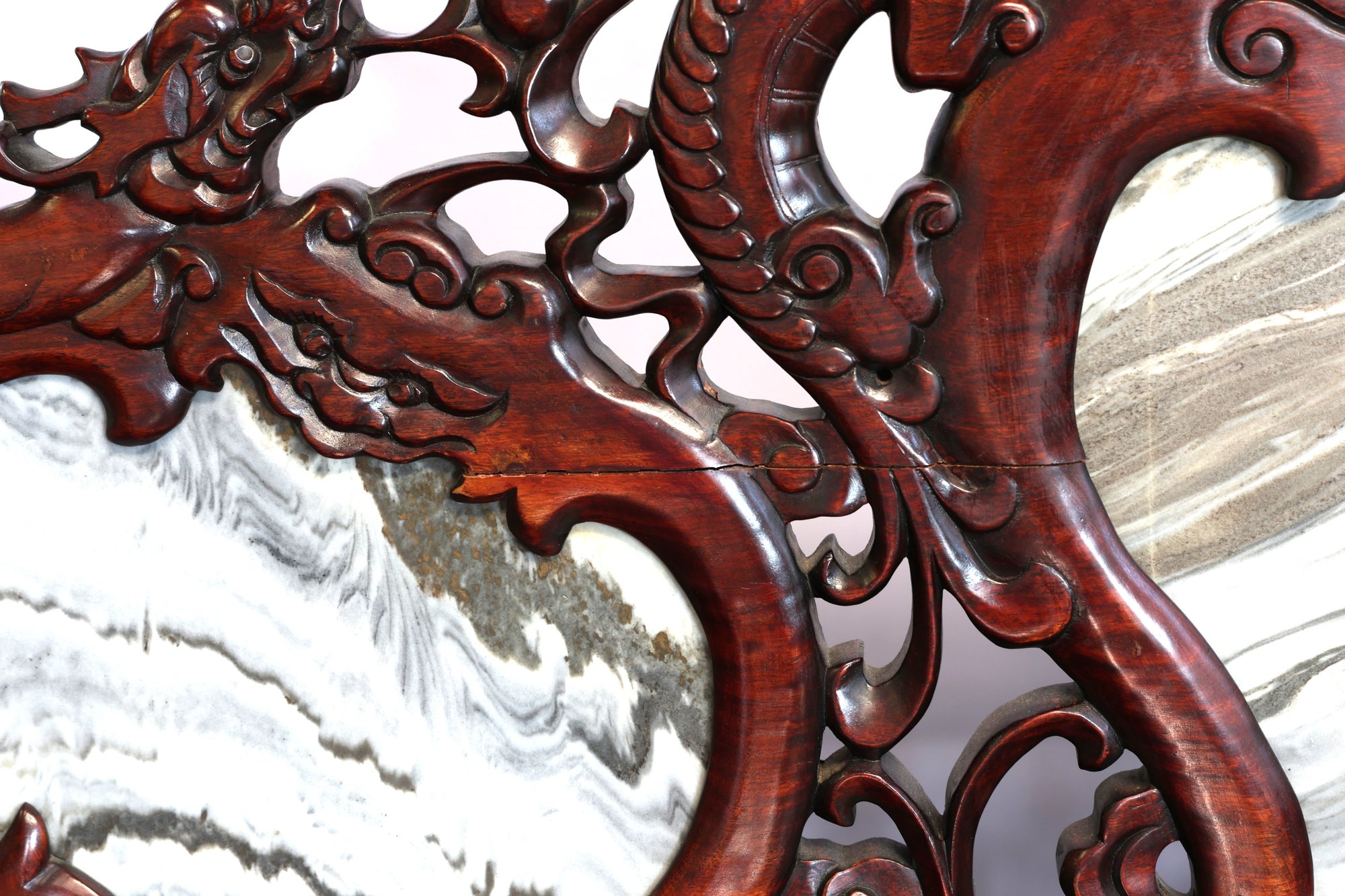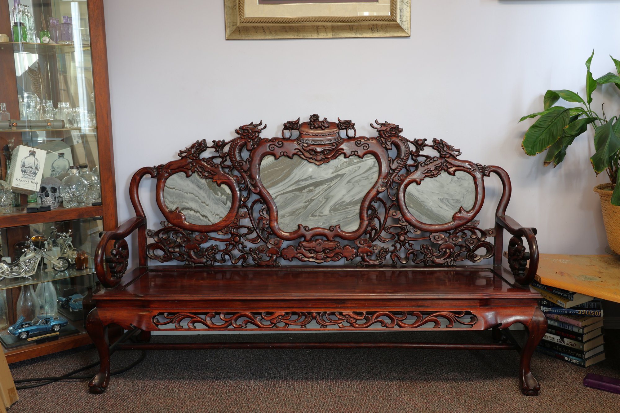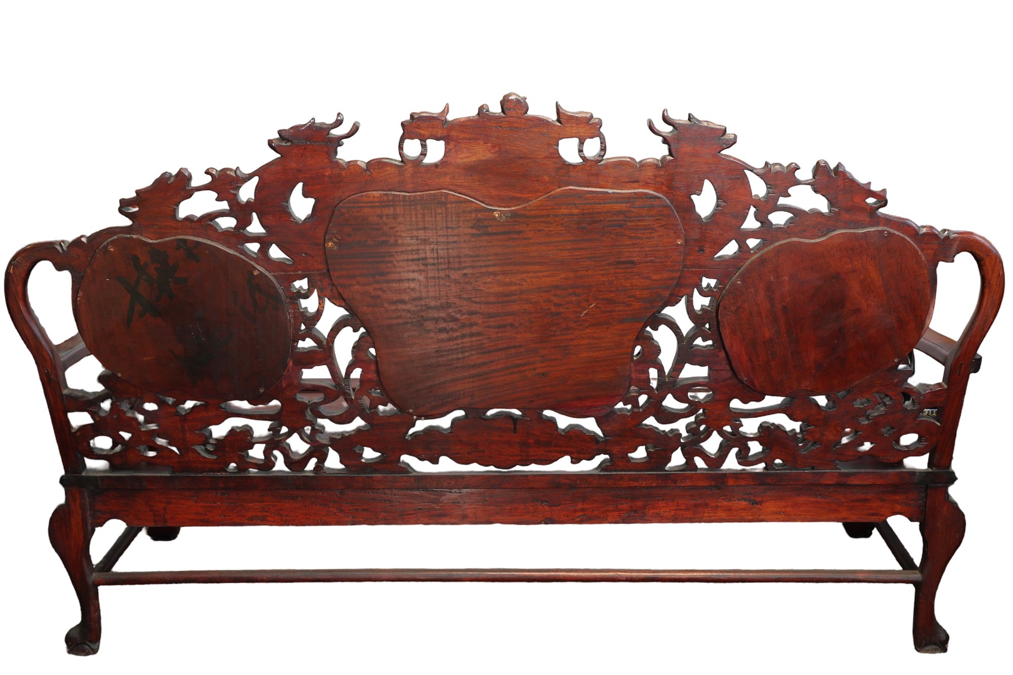 This 20th-century Chinese carved redwood bench or settee features marble inserts. It showcases detailed high-relief carvings of traditional Chinese folk art motifs such as dragons and scrolling floral patterns. The backrest has three cartouches that hold naturally veined marble panels, often called "dream-stones." Made from solid redwood , it is known for its weight and durability. The design is enhanced with ornate armrests and a carved apron at the seat's front.