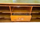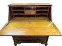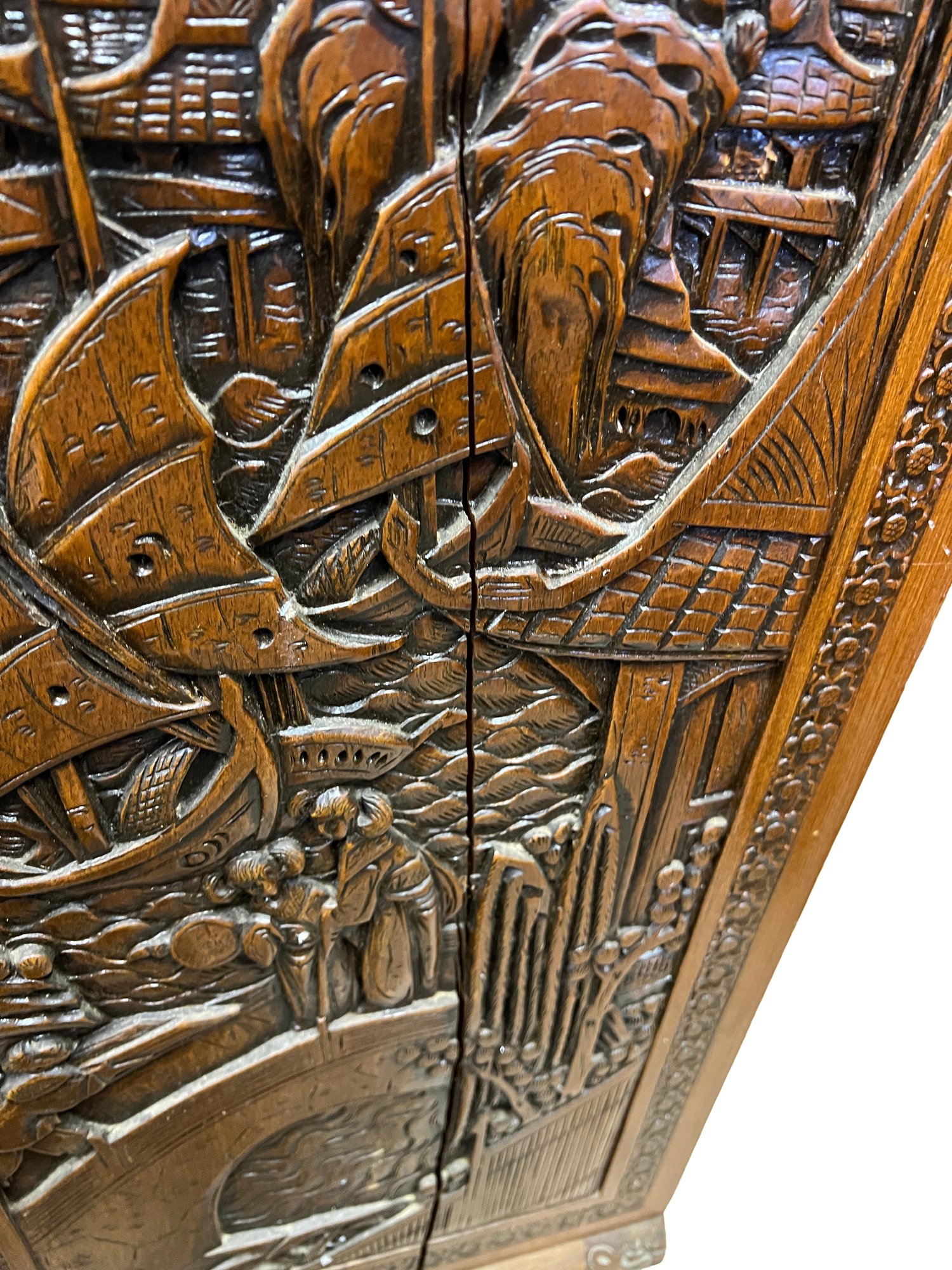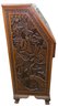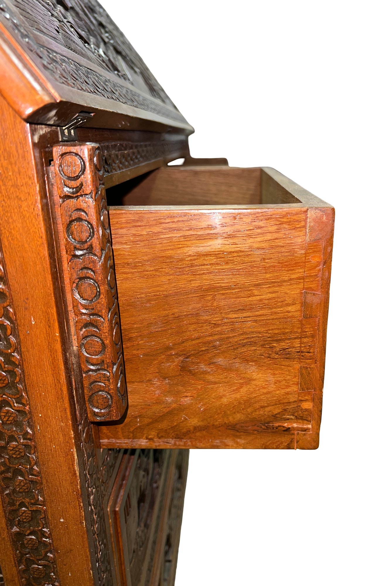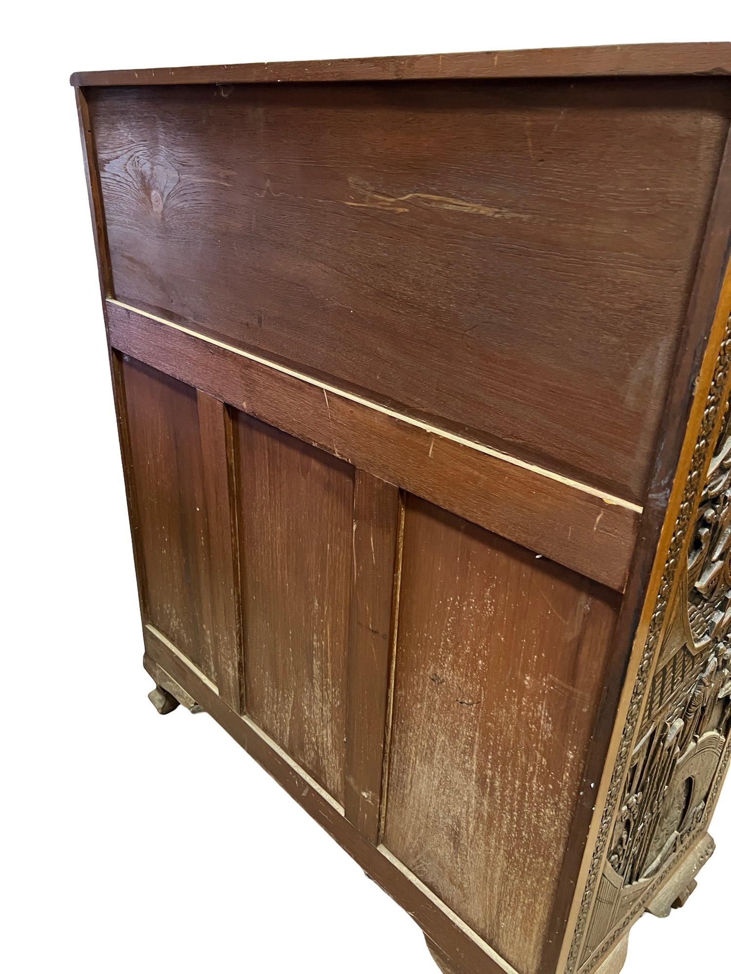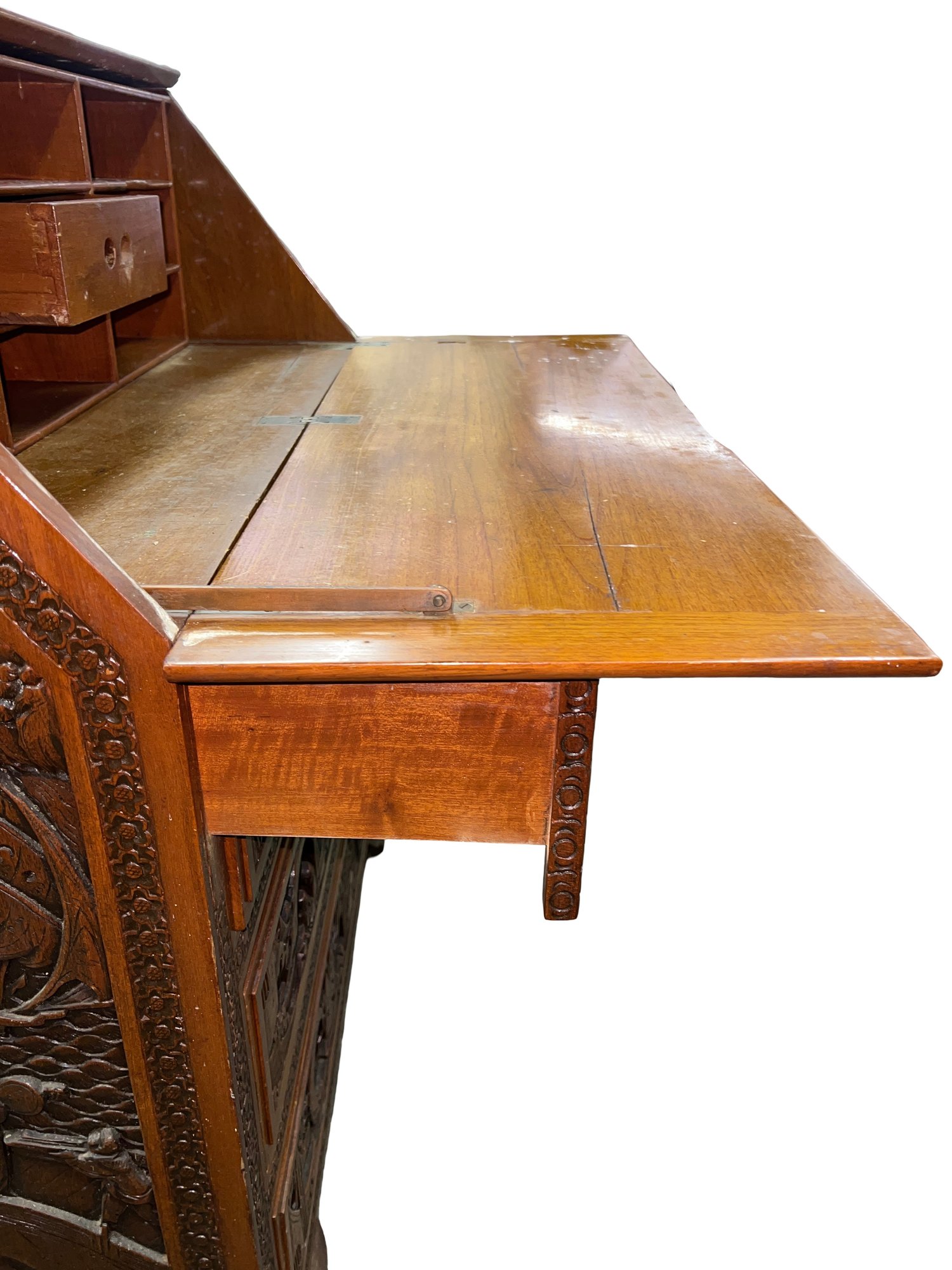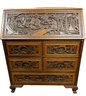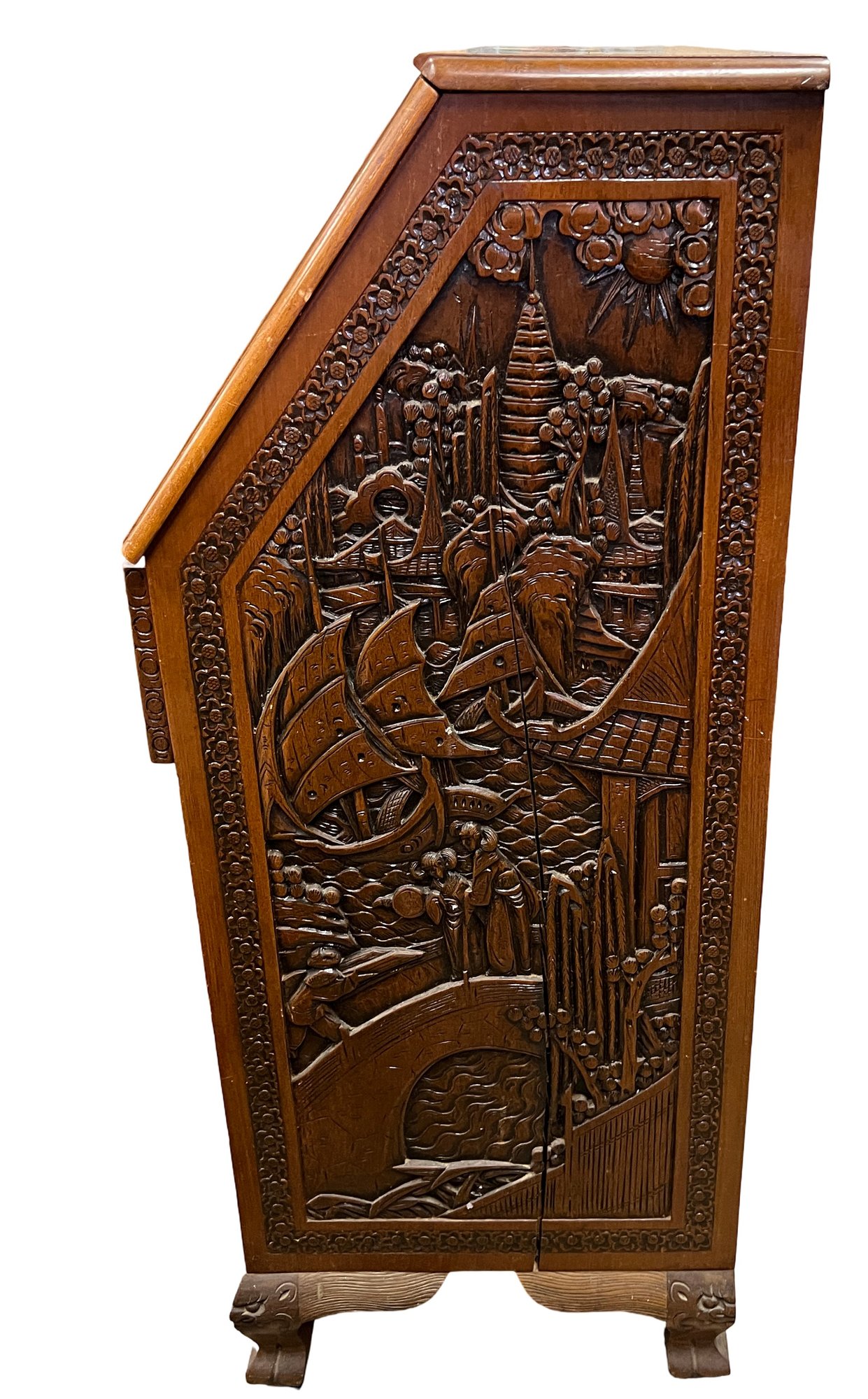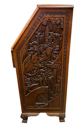 Crafted from wood, the front panel is a drop-front desk surface that opens to reveal a fitted interior designed for writing. It showcases intricate relief carvings depicting village scenes, figures, and landscapes. The desk also features multiple drawers for added storage. 45"H x 17"W x 36"W