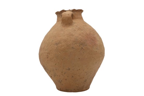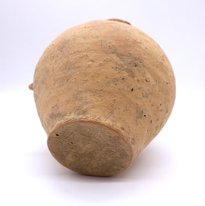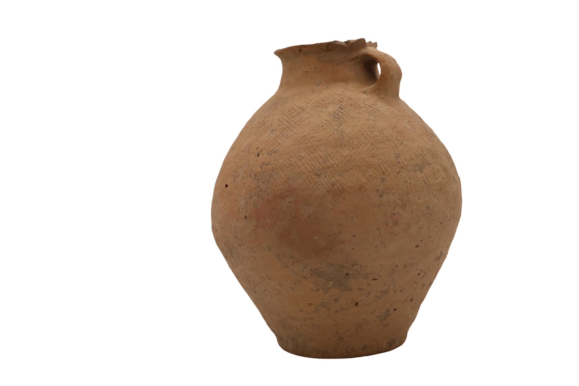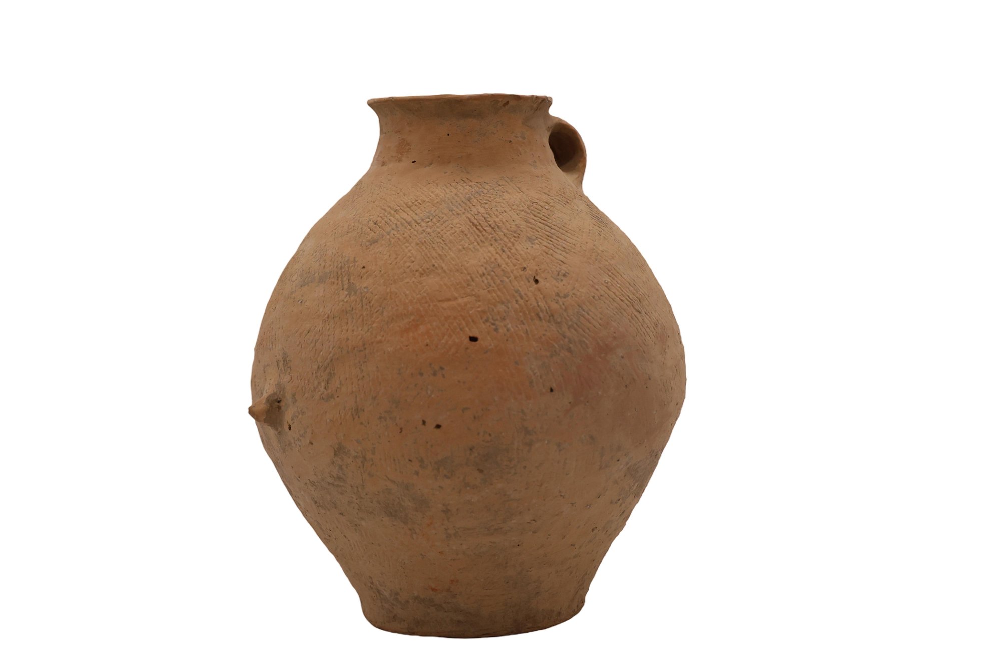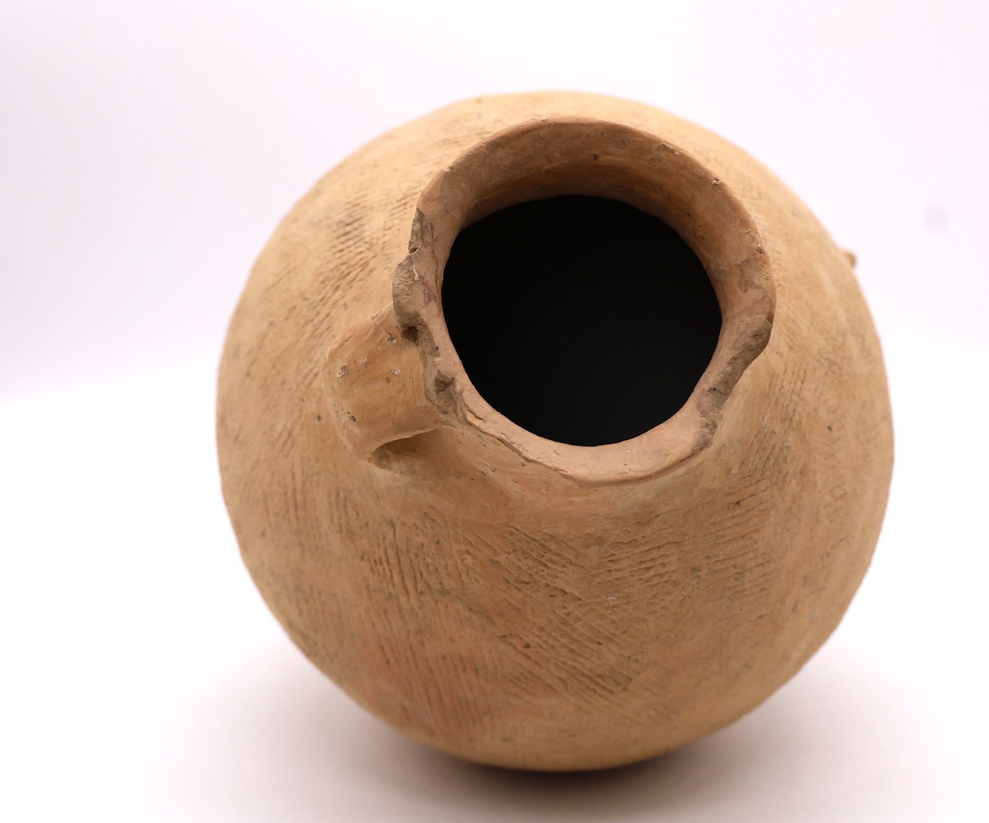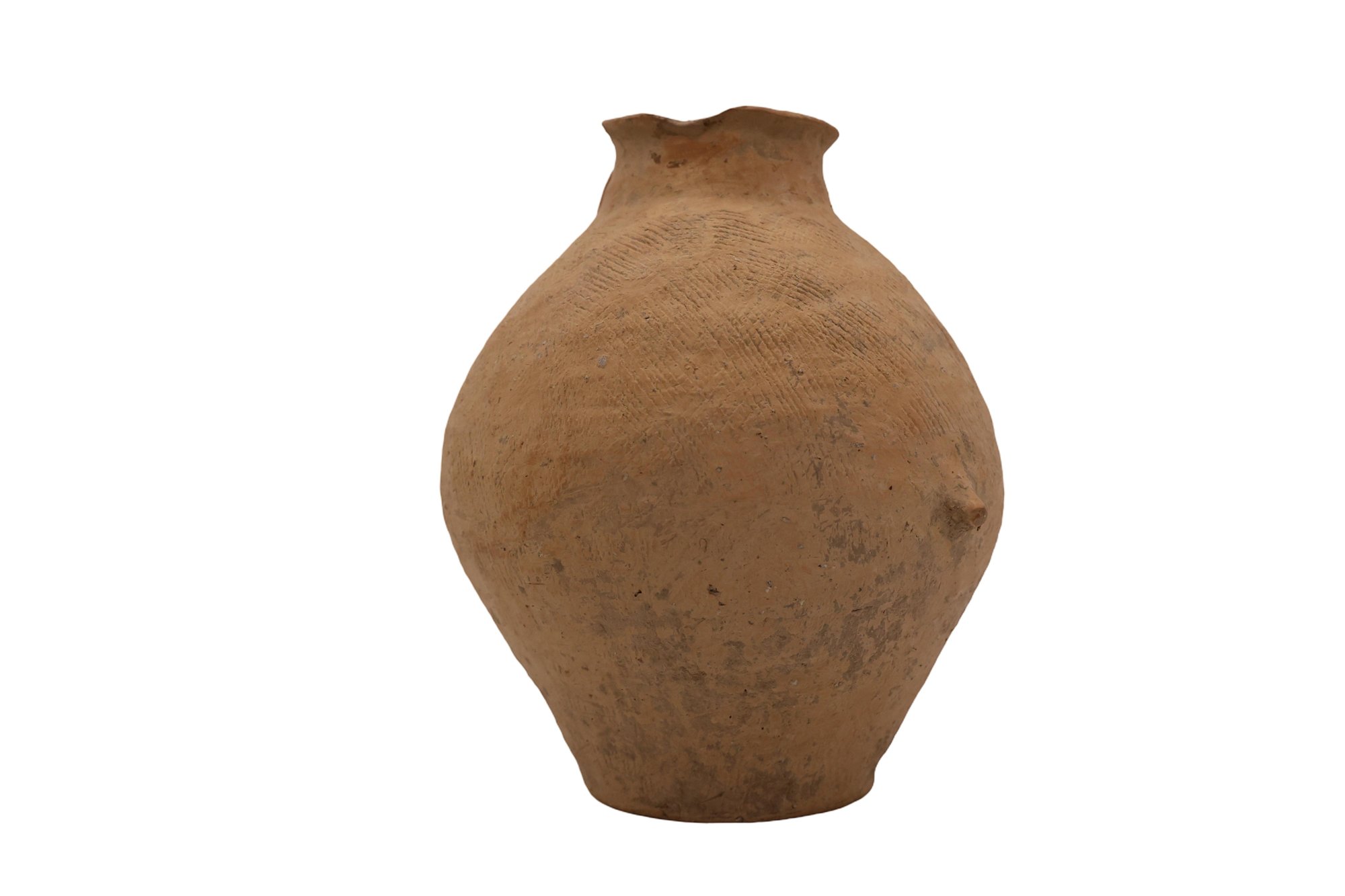 This pot decorated with incised lines and one lug handle. This was used in the kitchen for storage during the oldest period of excavated Chinese architectural history. This pot is undecorated with some rim chips but overall nice.
