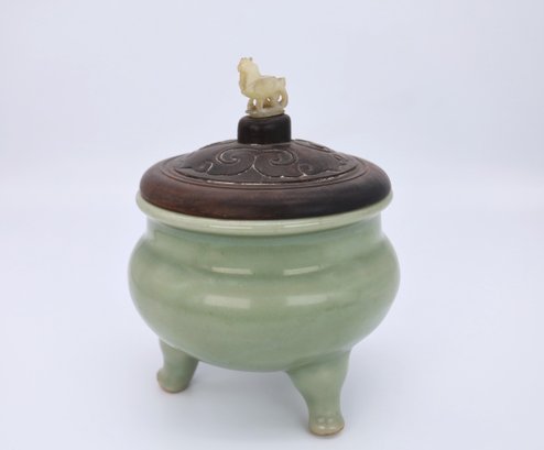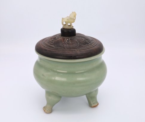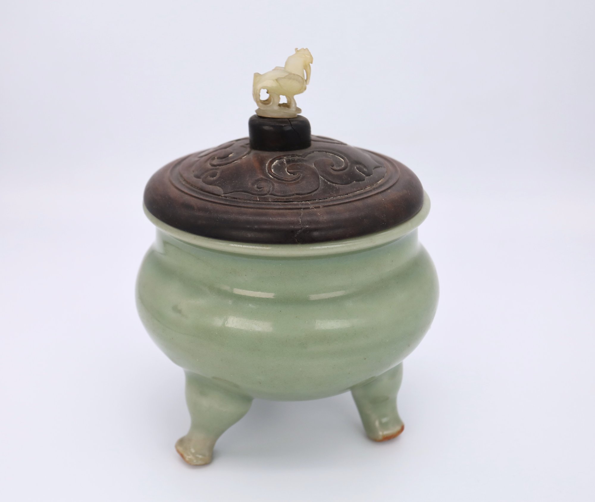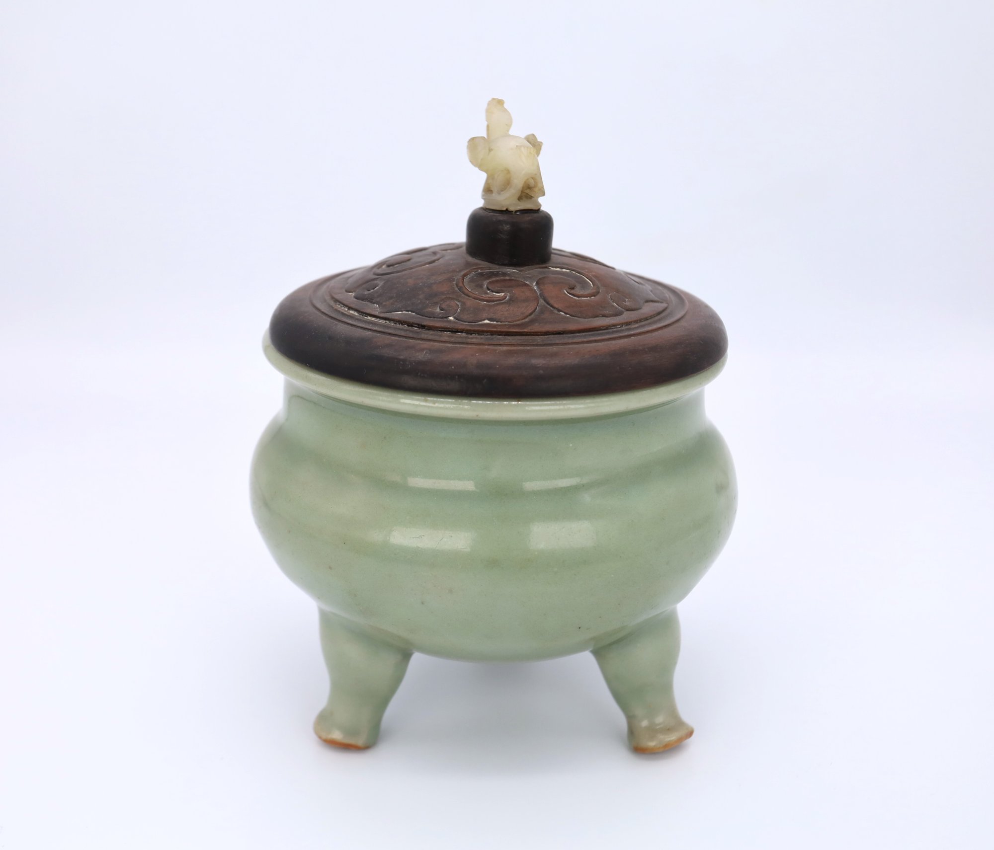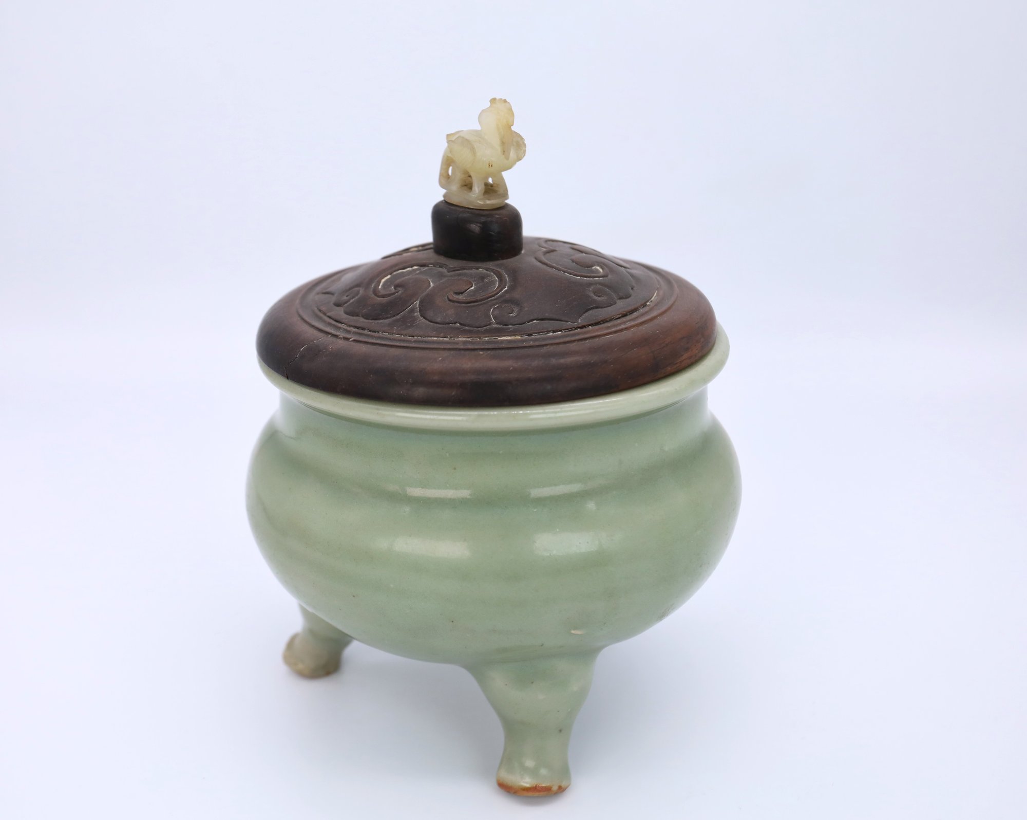 Chinese Old Longquan Celadon Tripod Censer porcelain with wooden top and white jade bird on top.