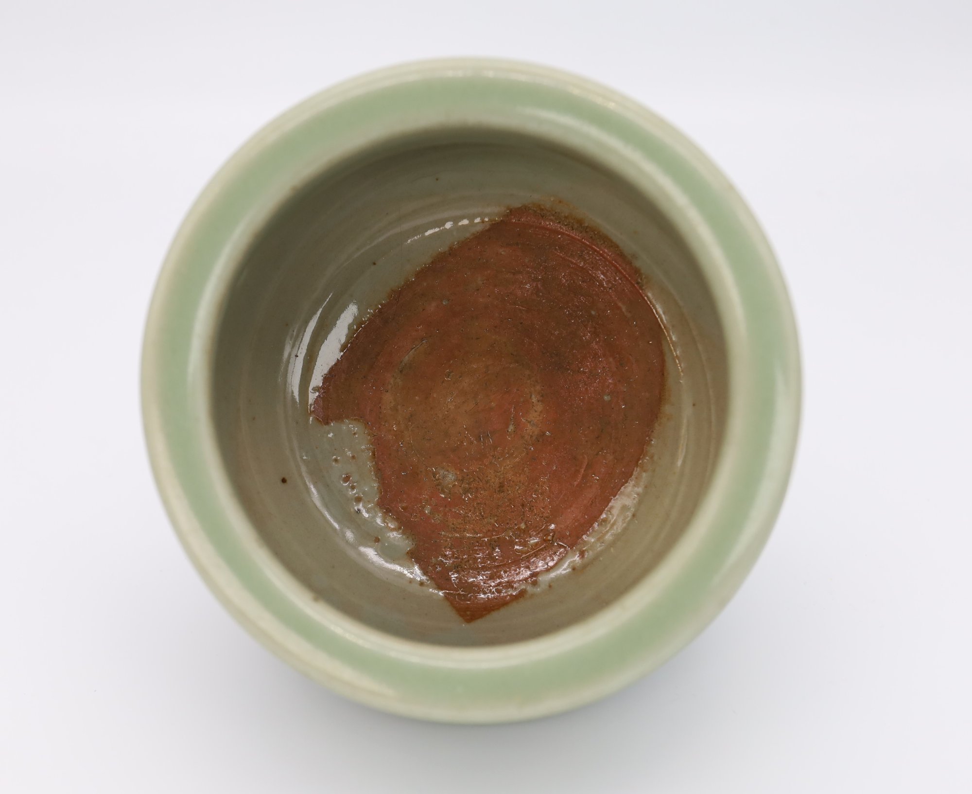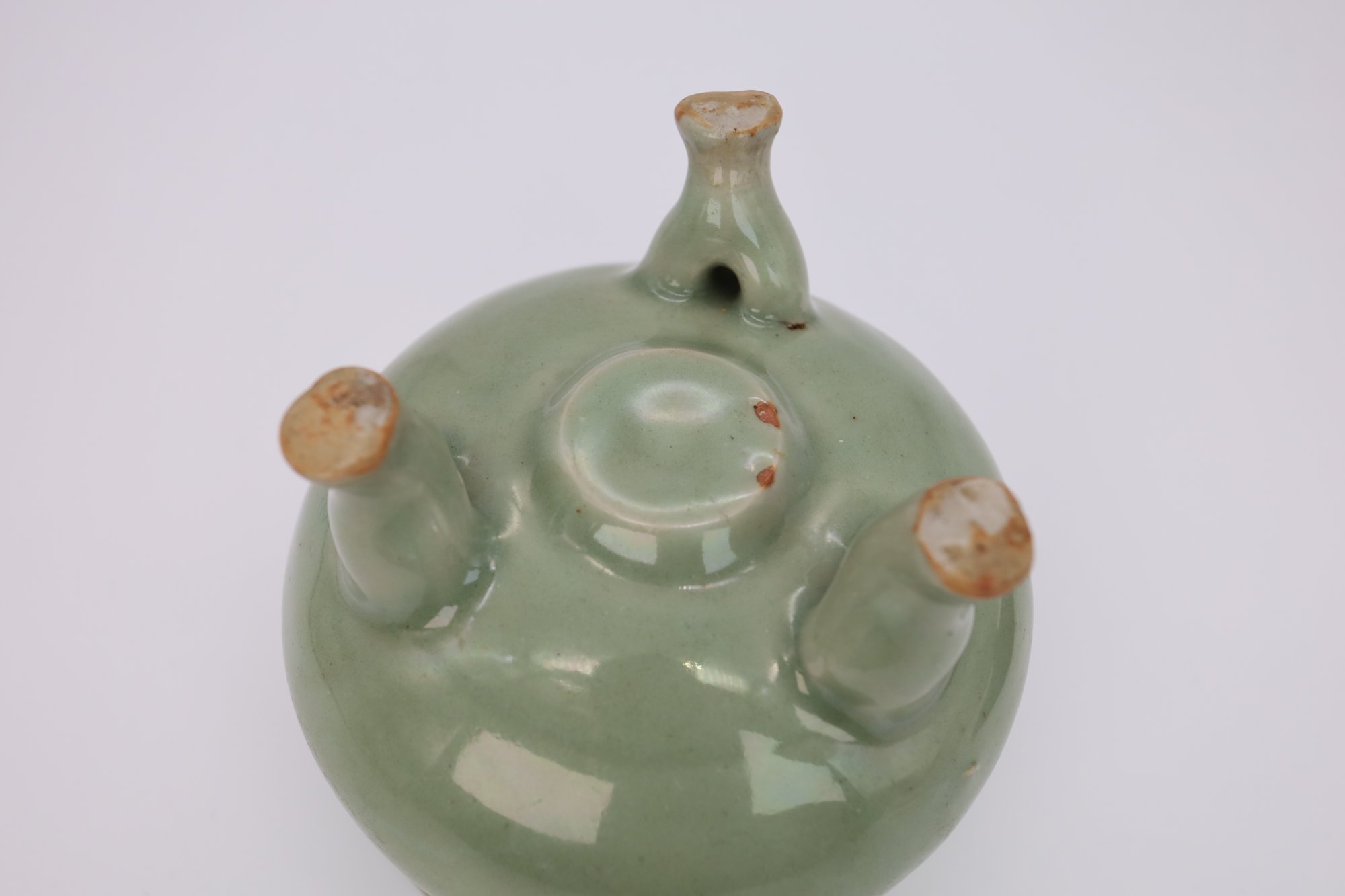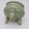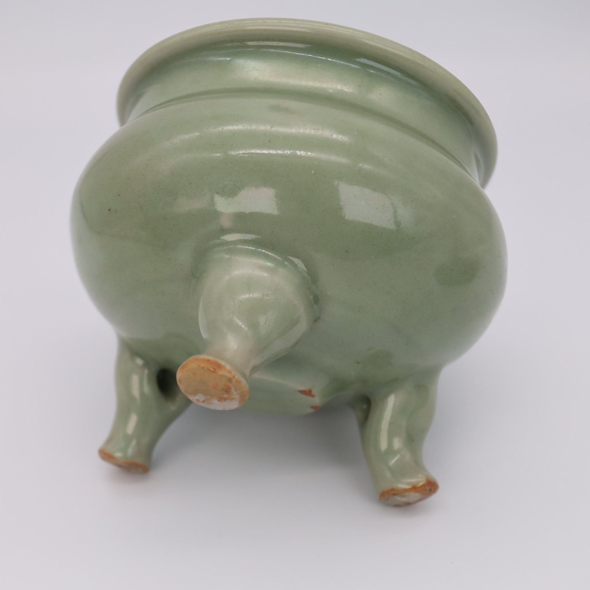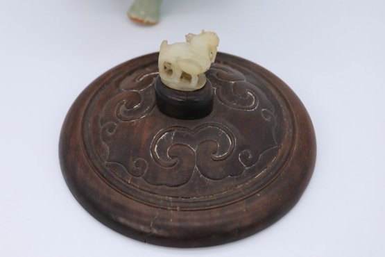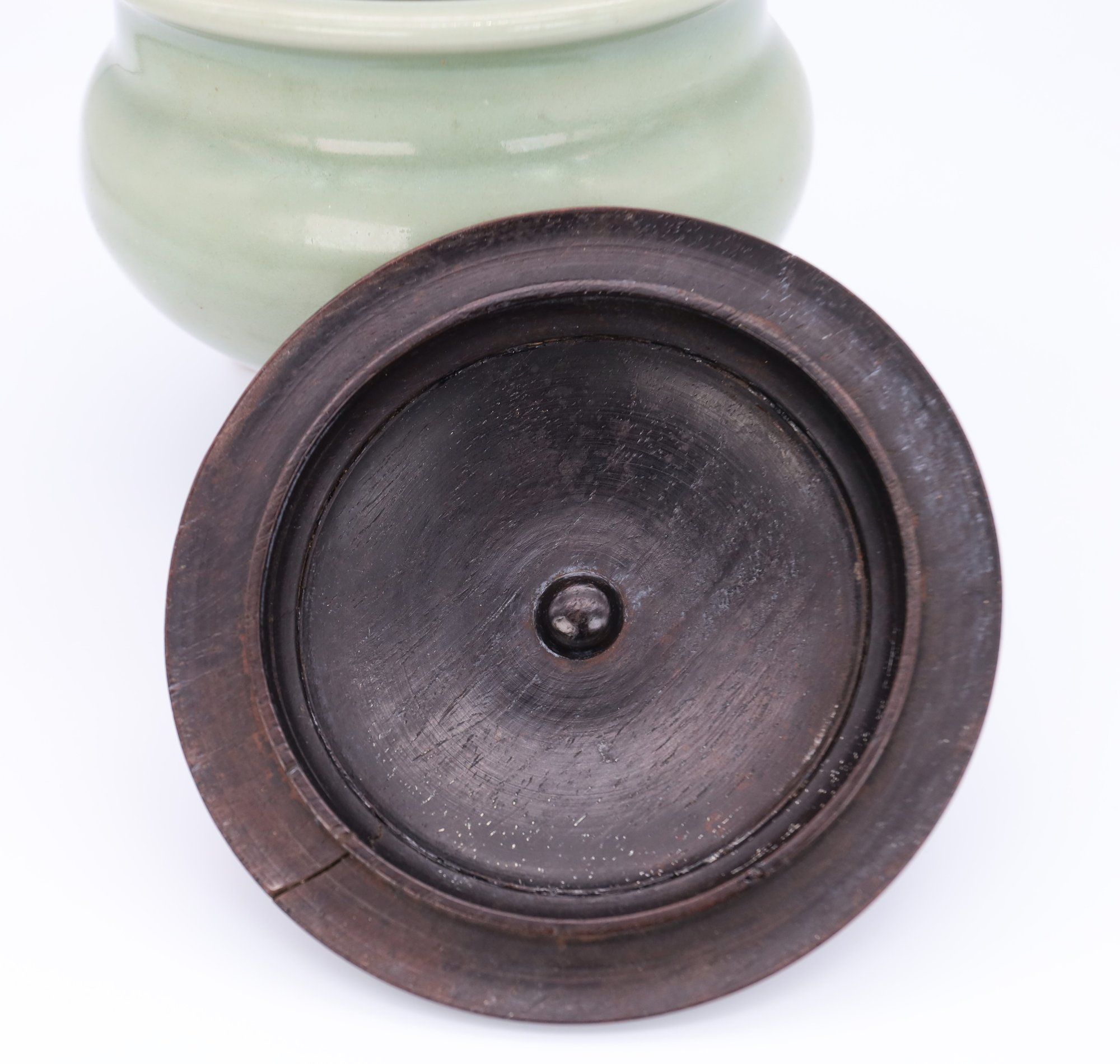 Chinese Old Longquan Celadon Tripod Censer porcelain with wooden top and white jade bird on top.