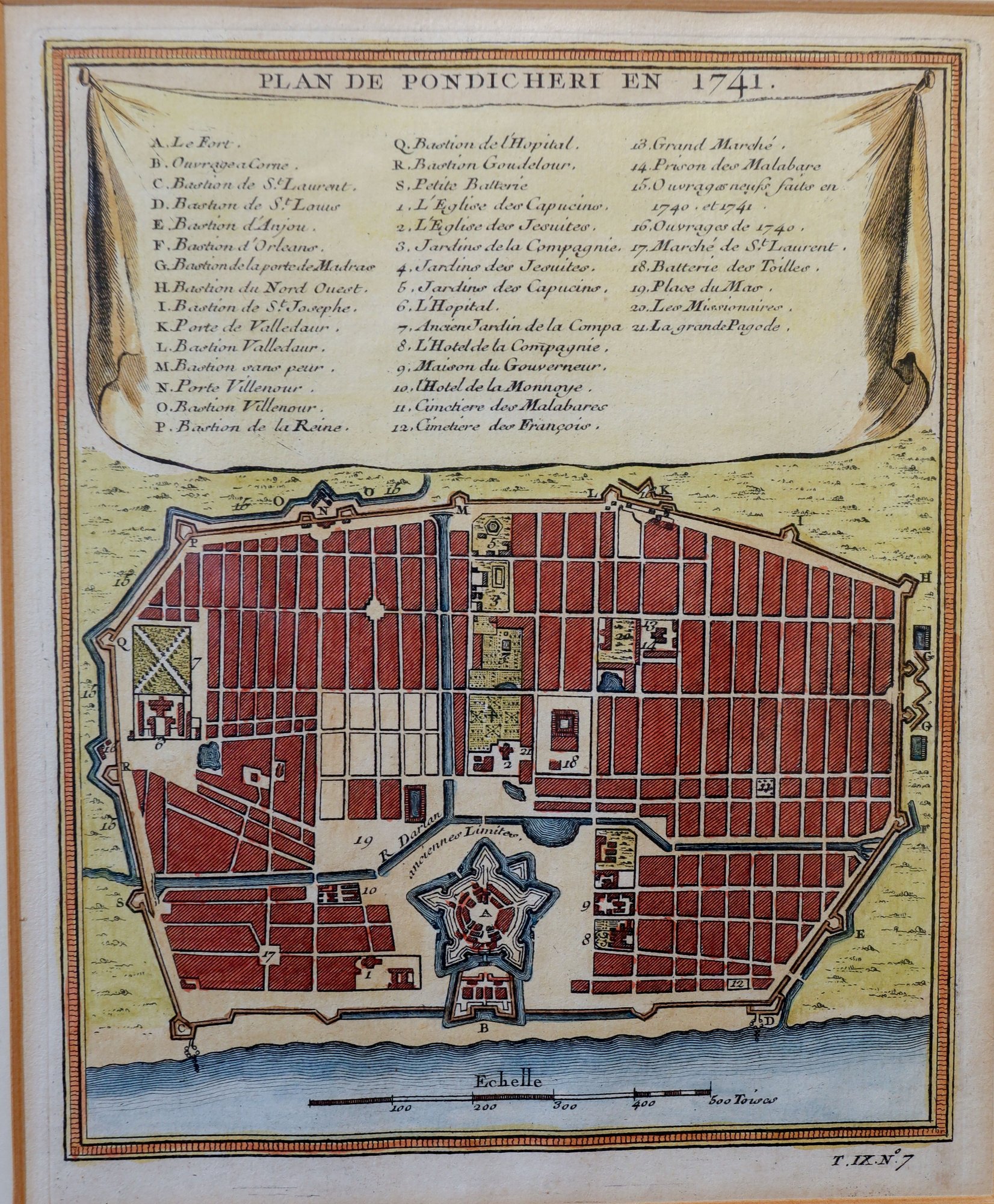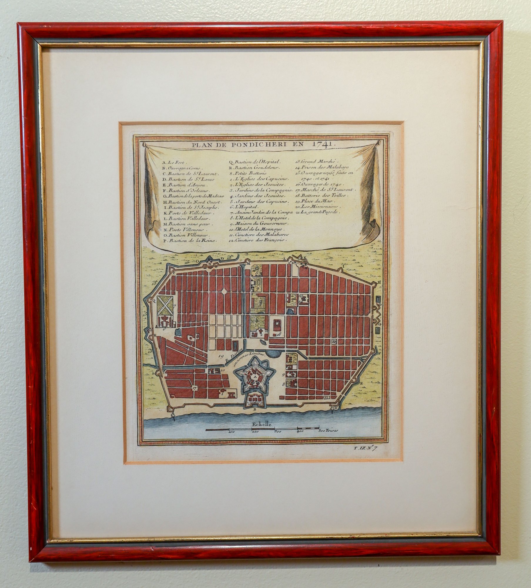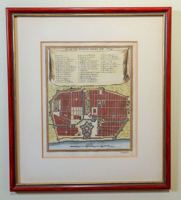 A beautiful hand-colored map of Pondicherry, India, dating back to the 1750s, is available. Pondicherry served as a trading post for over 1600 years, passing from Dutch to French hands in 1699. The town witnessed a period of conflict between the French and the British in the late 1700s, eventually returning to French rule in 1814. The French imprint remains visible in the town's architecture, signage, and Tamil dialect.