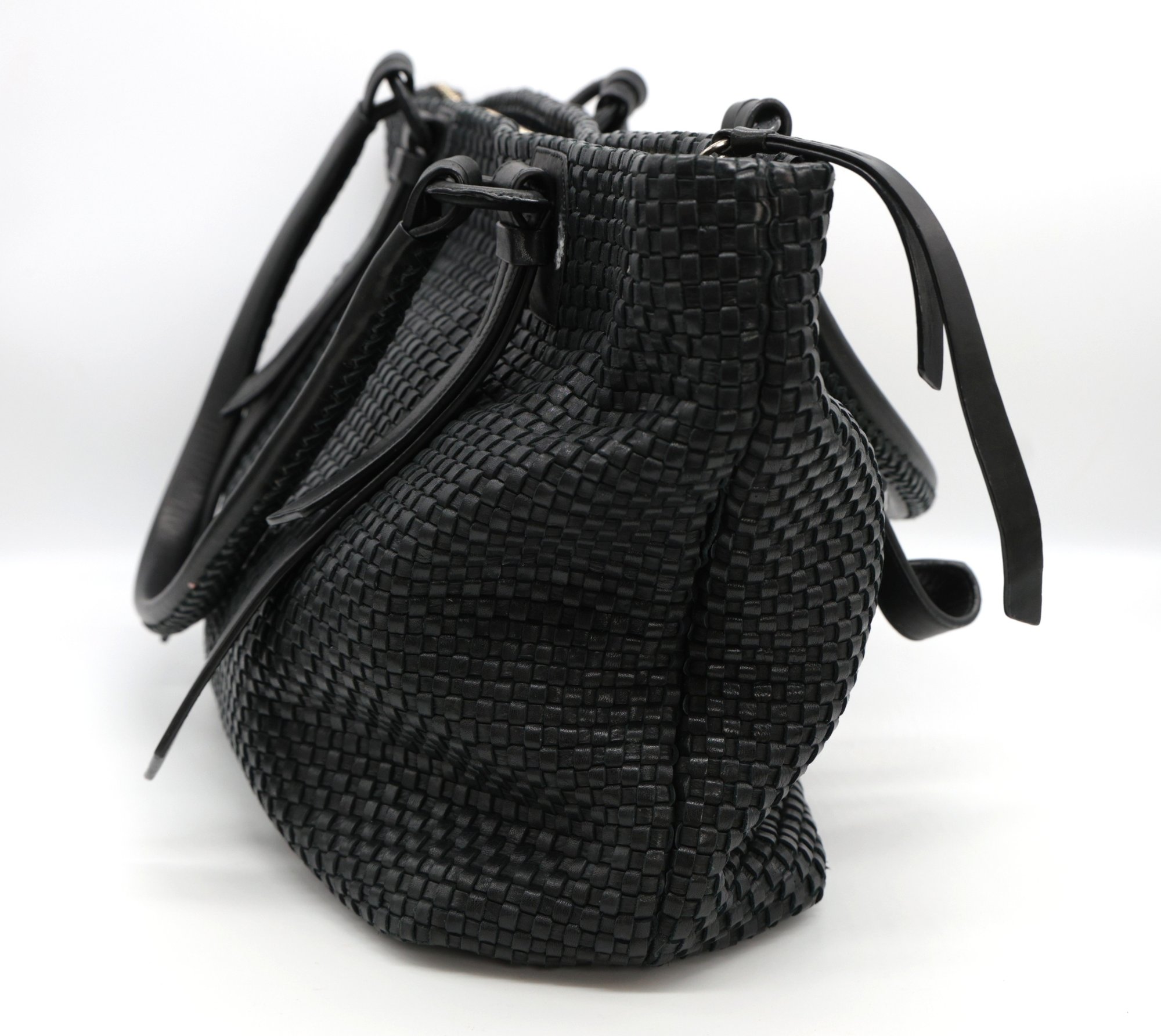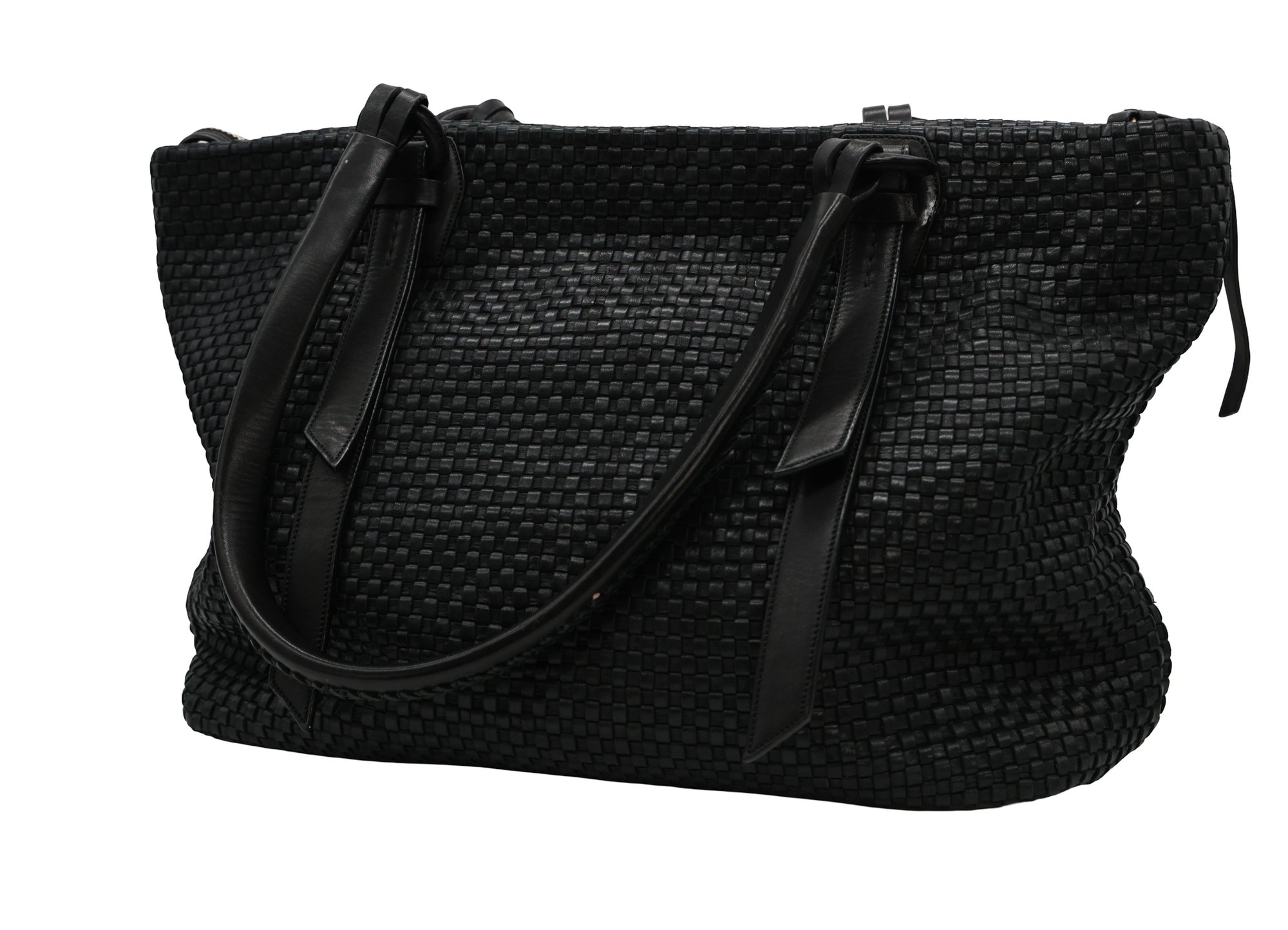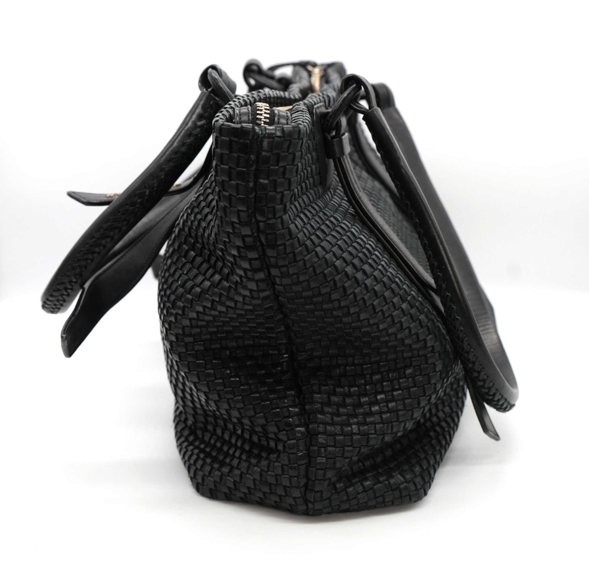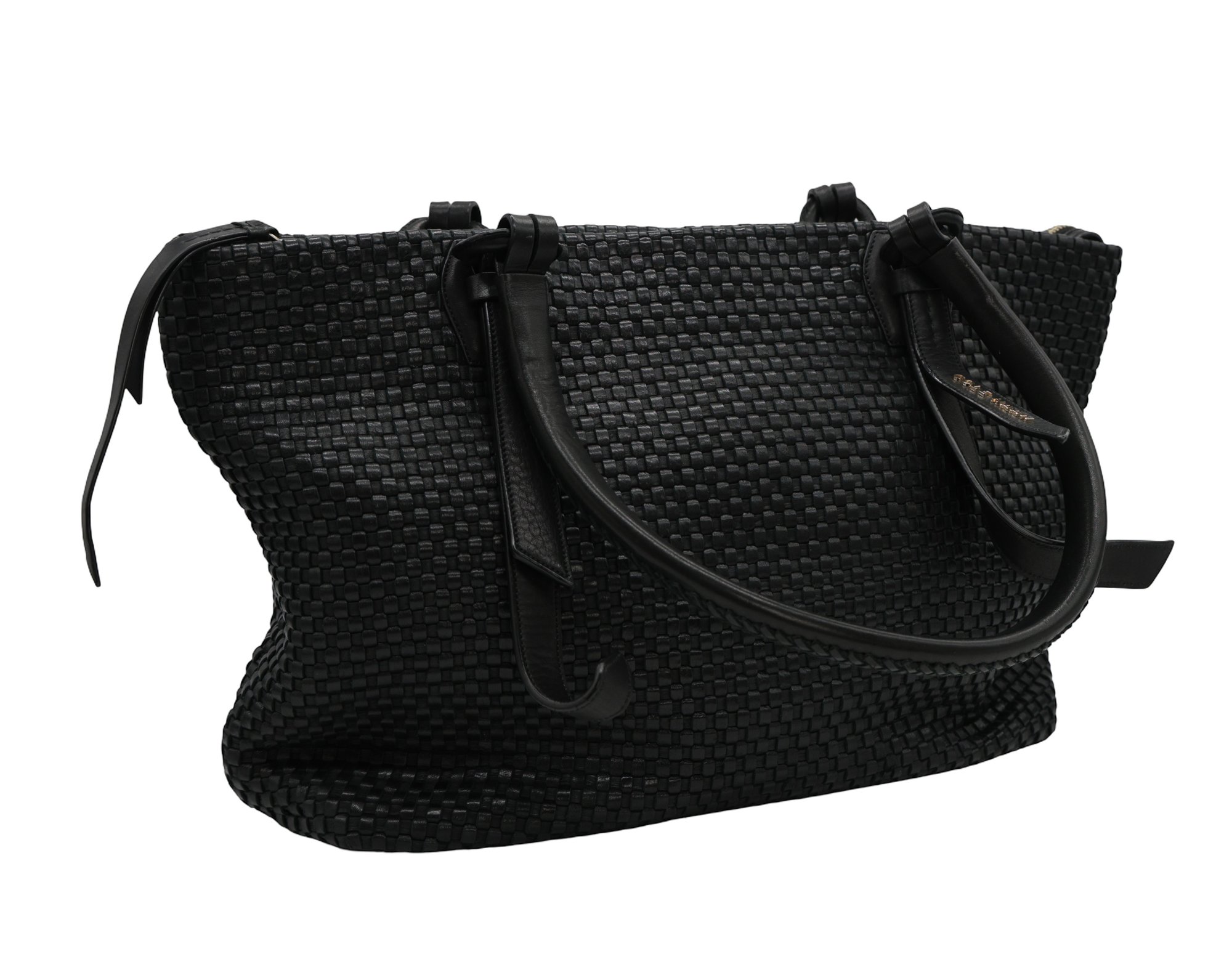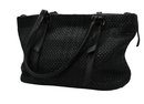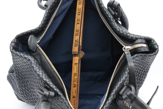 Cole Haan Bethany Weave Tote in black with a zipper and two pockets inside. Zipper closure with two handles.