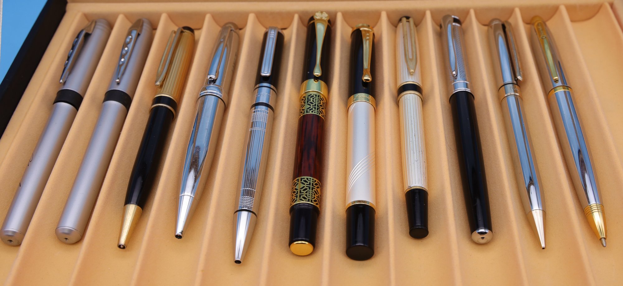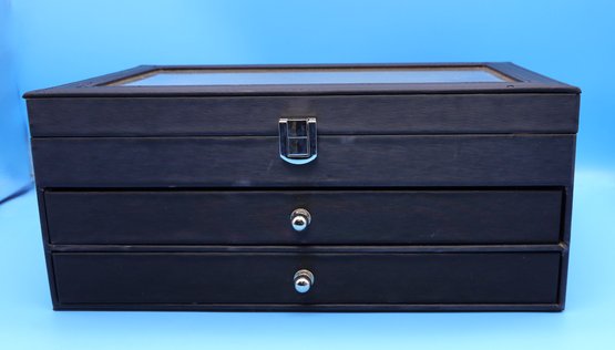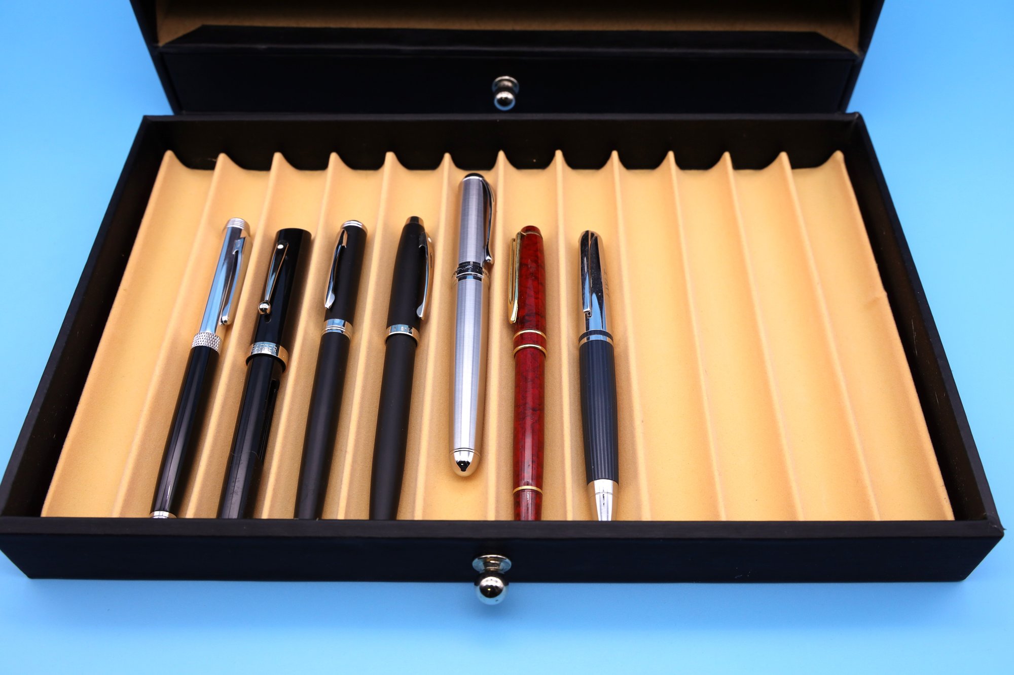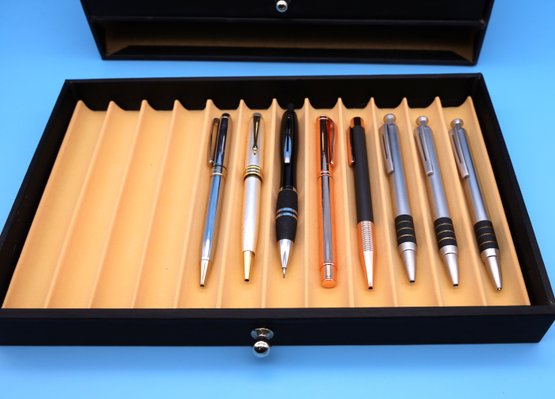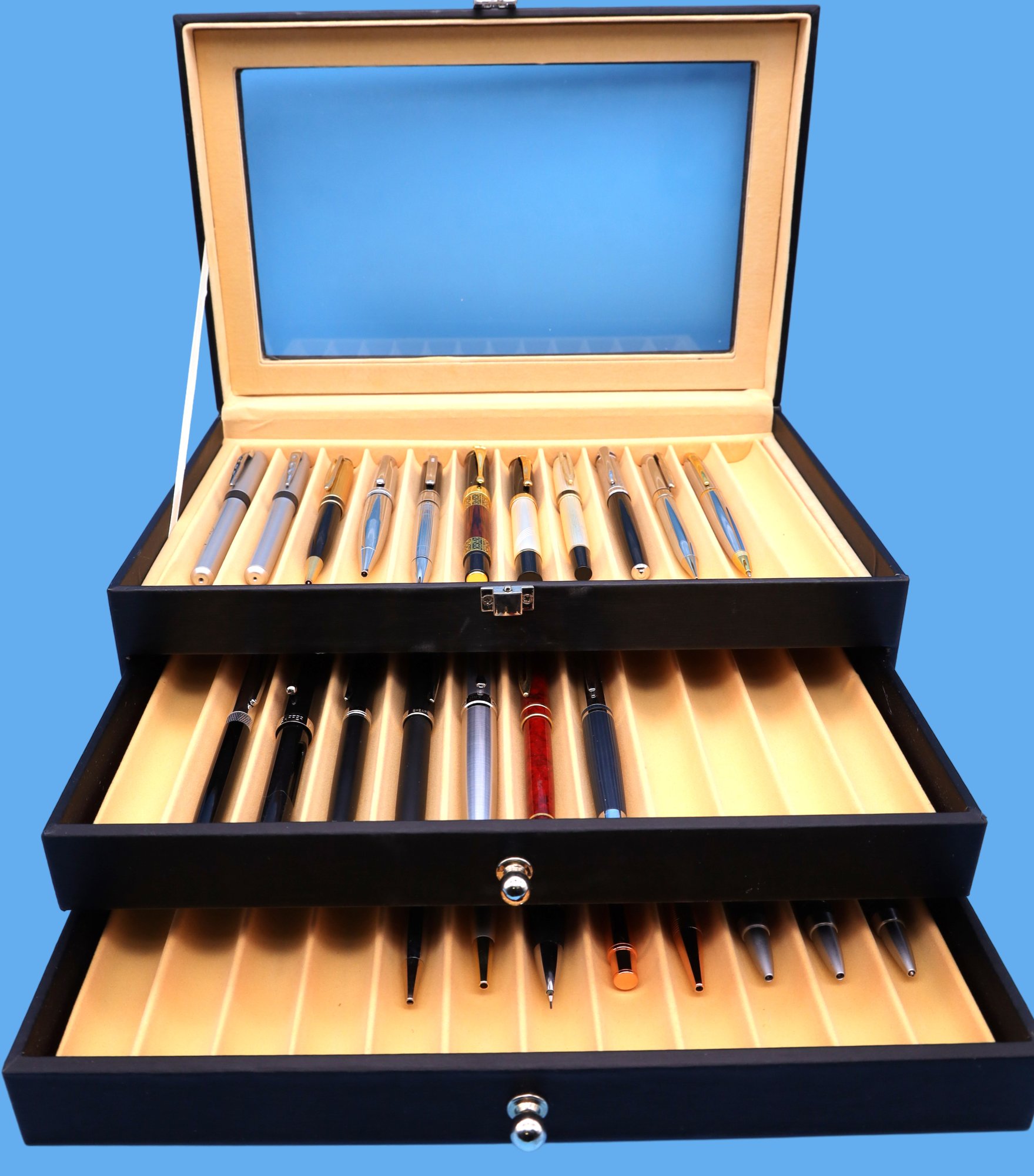 Writing instrument display box - leatherette with drawers and a collection of 26 pens