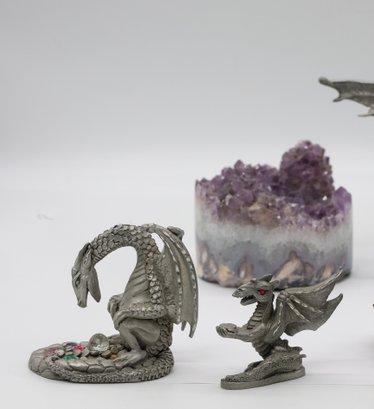 The collection includes multiple dragon figurines in various poses, some with spread wings and others seated.