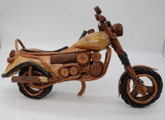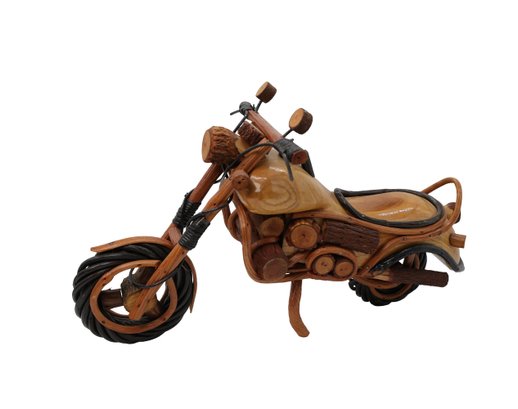 The collection includes a large handcrafted wooden model (12" x 6") and two smaller metal sculptures(8"L). The large wooden piece is a vintage-style, hand-carved Harley-Davidson chopper, often regarded as folk art. Made from different woods, it is stained and sealed, with detailed components such as the engine parts and mufflers. The two smaller sculptures are crafted from metal parts such as iron, steel bits, screws, nuts, and bearings, designed in a retro style.