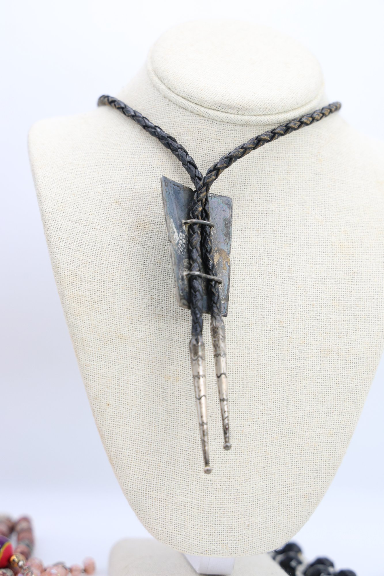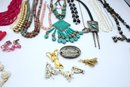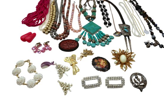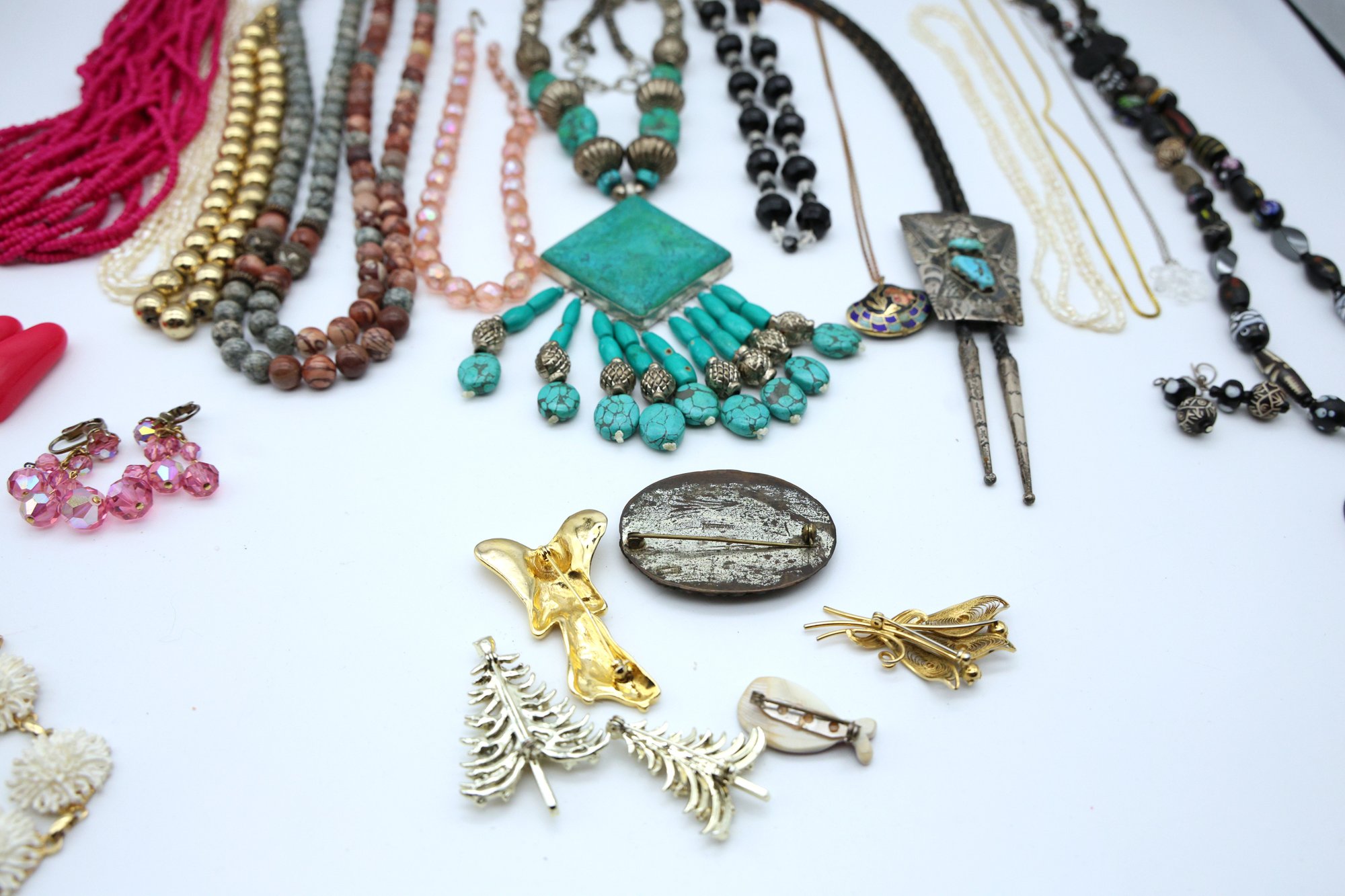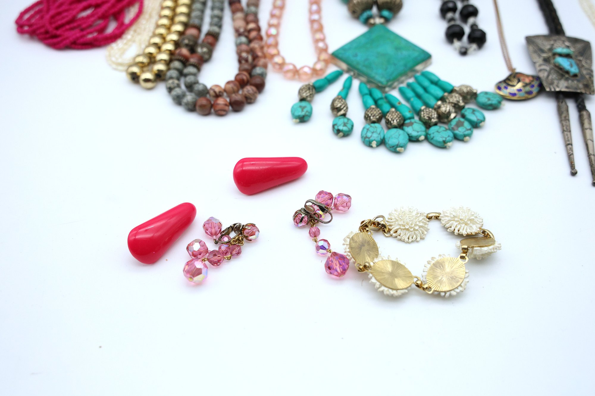 Includes: Native American Style bolo tie, crystal pink beaded necklace, fresh water pearls , signed hand-painted pin, Christmas pins, double strand beaded stones and so much more.
