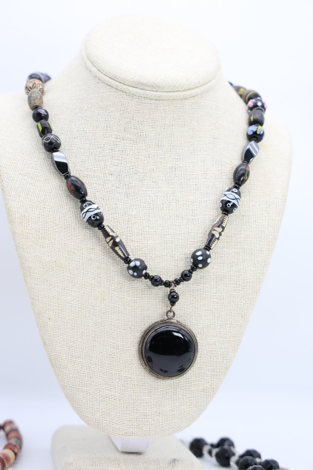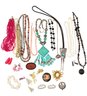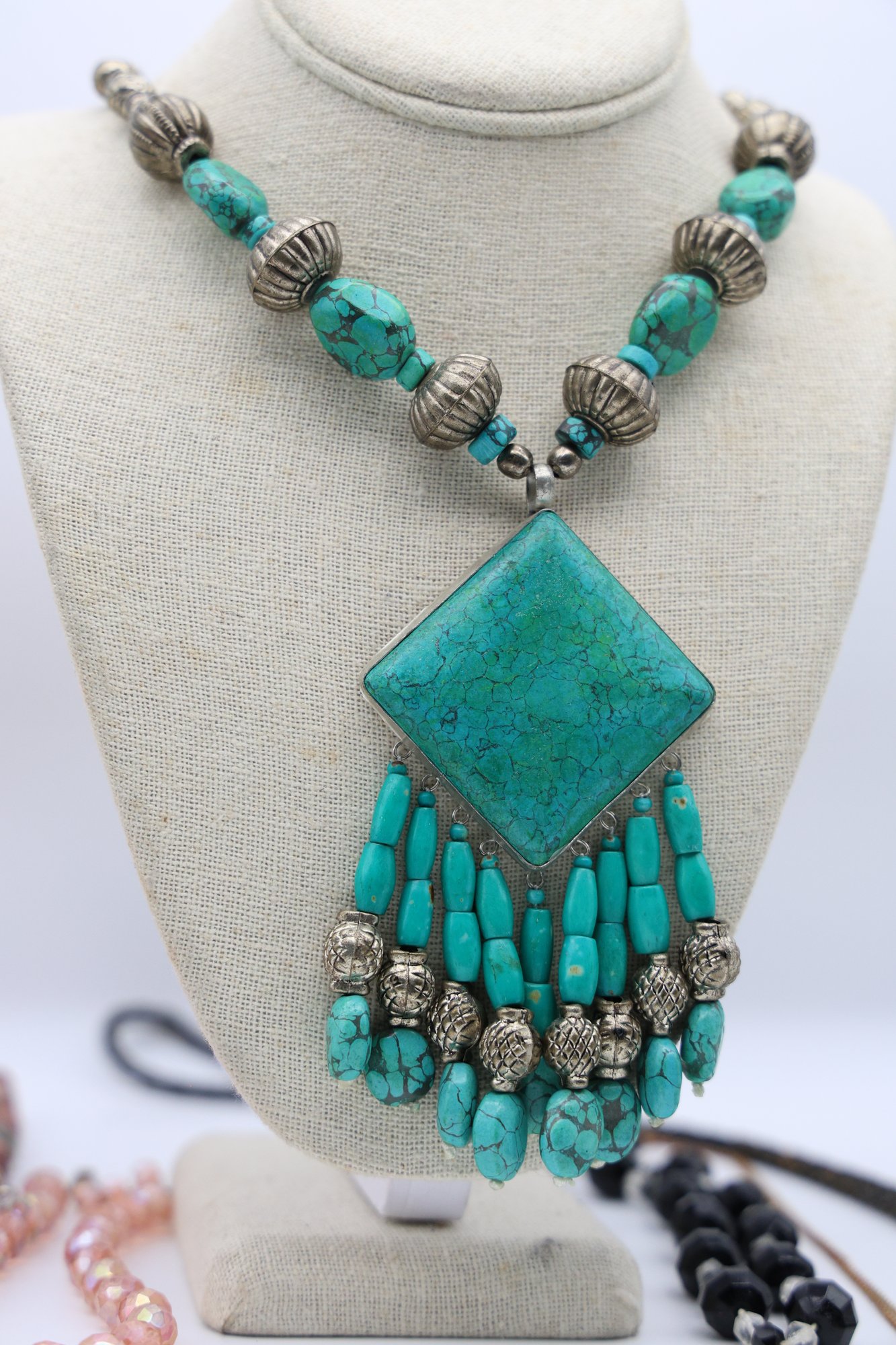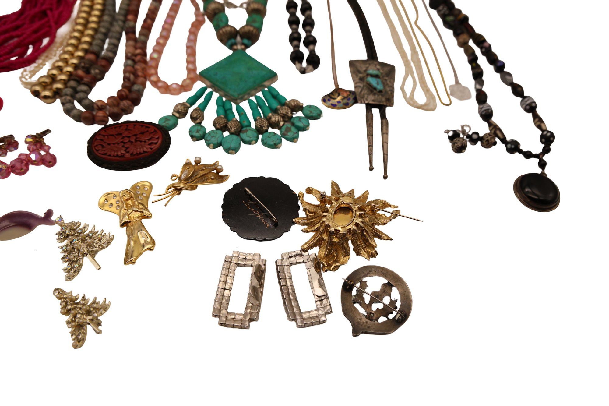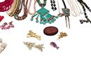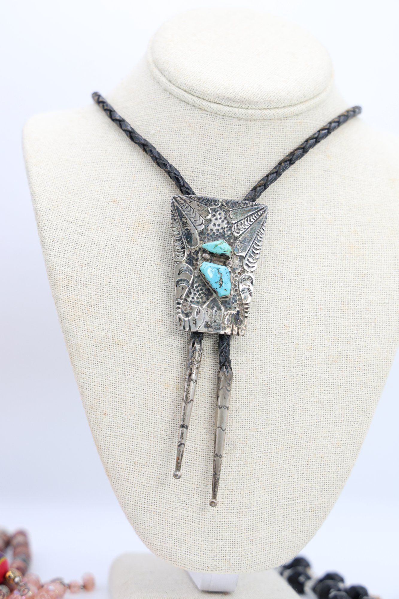 Includes: Native American Style bolo tie, crystal pink beaded necklace, fresh water pearls , signed hand-painted pin, Christmas pins, double strand beaded stones and so much more.