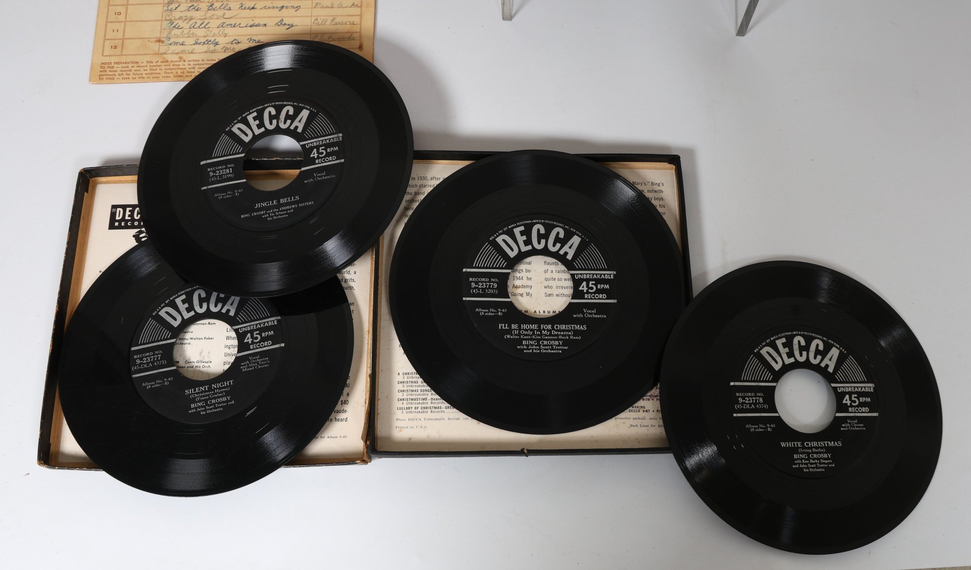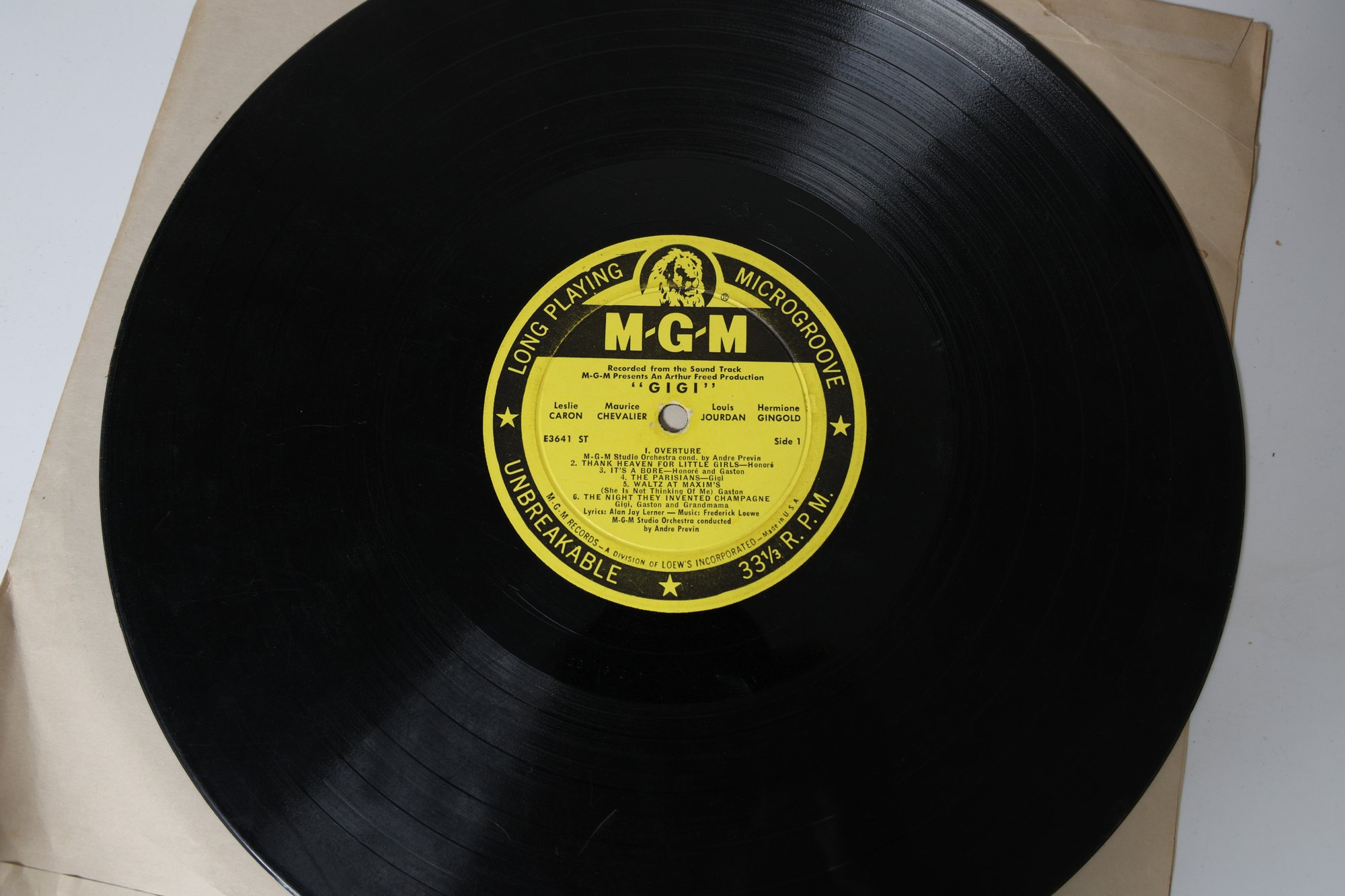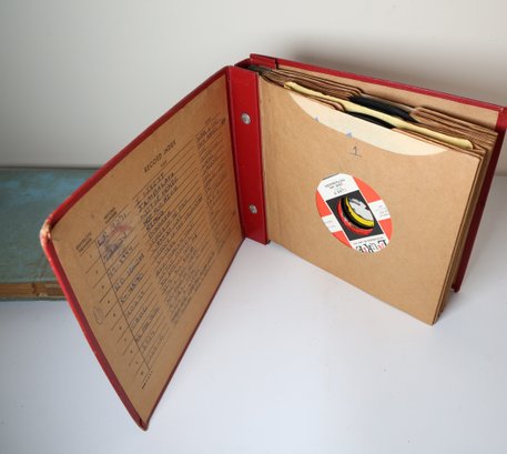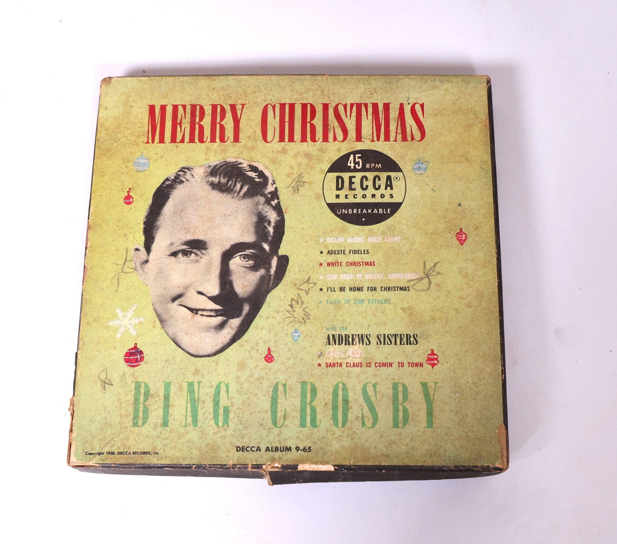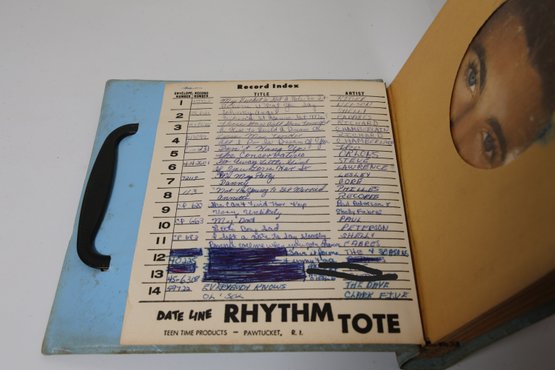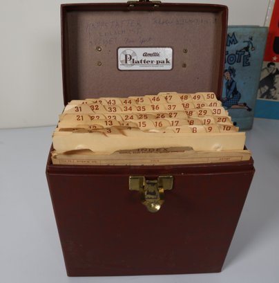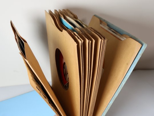 Platter-pak Phonograph Record Case filled with a collection of vintage 1950s to 60s 45 RPM singles on vinyl. The padded Blue Ponytail Tune tote for 7-inch records (45 RPM) holds 14 records. (It has foxing on the cover.) BING CROSBY - Merry Christmas Single Box Set 1950 Decca - 45 RPM - four records. Red 45 RPM record carry case. Beach Boys 45 Record with cover - Good Vibrations. "Shindig! With The Stars" is a compilation album associated with the 1960s American musical variety television show Shindig. The soundtrack of the movie Gigi features songs performed by the movie's stars, Leslie Caron, Maurice Chevalier, Louis Jourdan, and Hermione Gingold. The record is a 33⅓ RPM long-playing (LP).