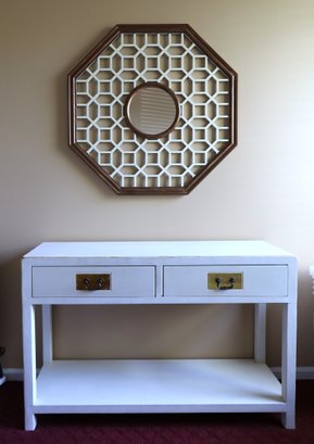 Very nice vintage white with gold trim console. 2 drawers working well. Some wear. 47.25"W x 13.75"D x 30.75"H