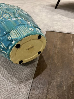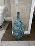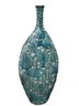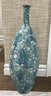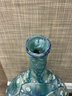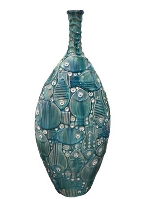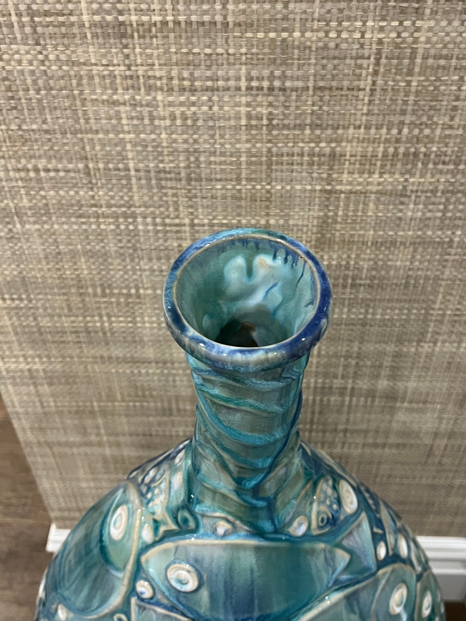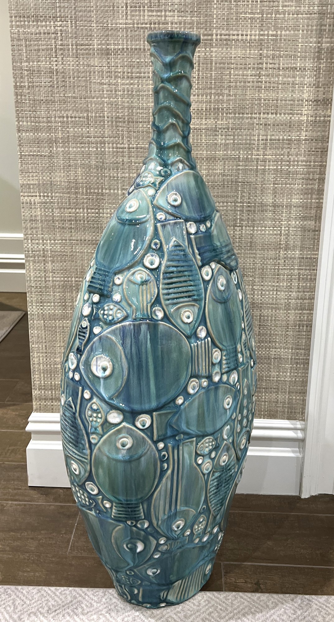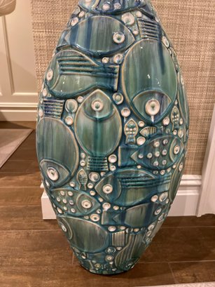 Contemporary fish design ceramic glaze large vase with a narrow-tapered neck. Finished in a green-blue glaze.