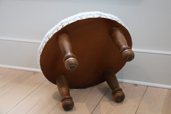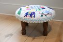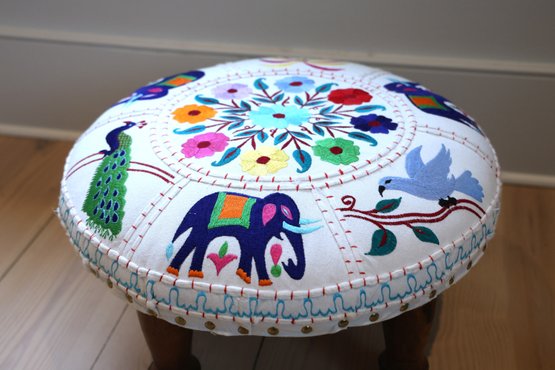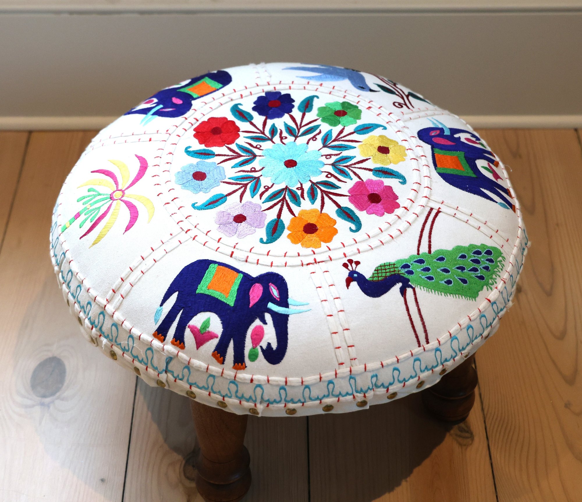 Cotton embroidered foot stool with 4 wooden legs and nail heads surround
