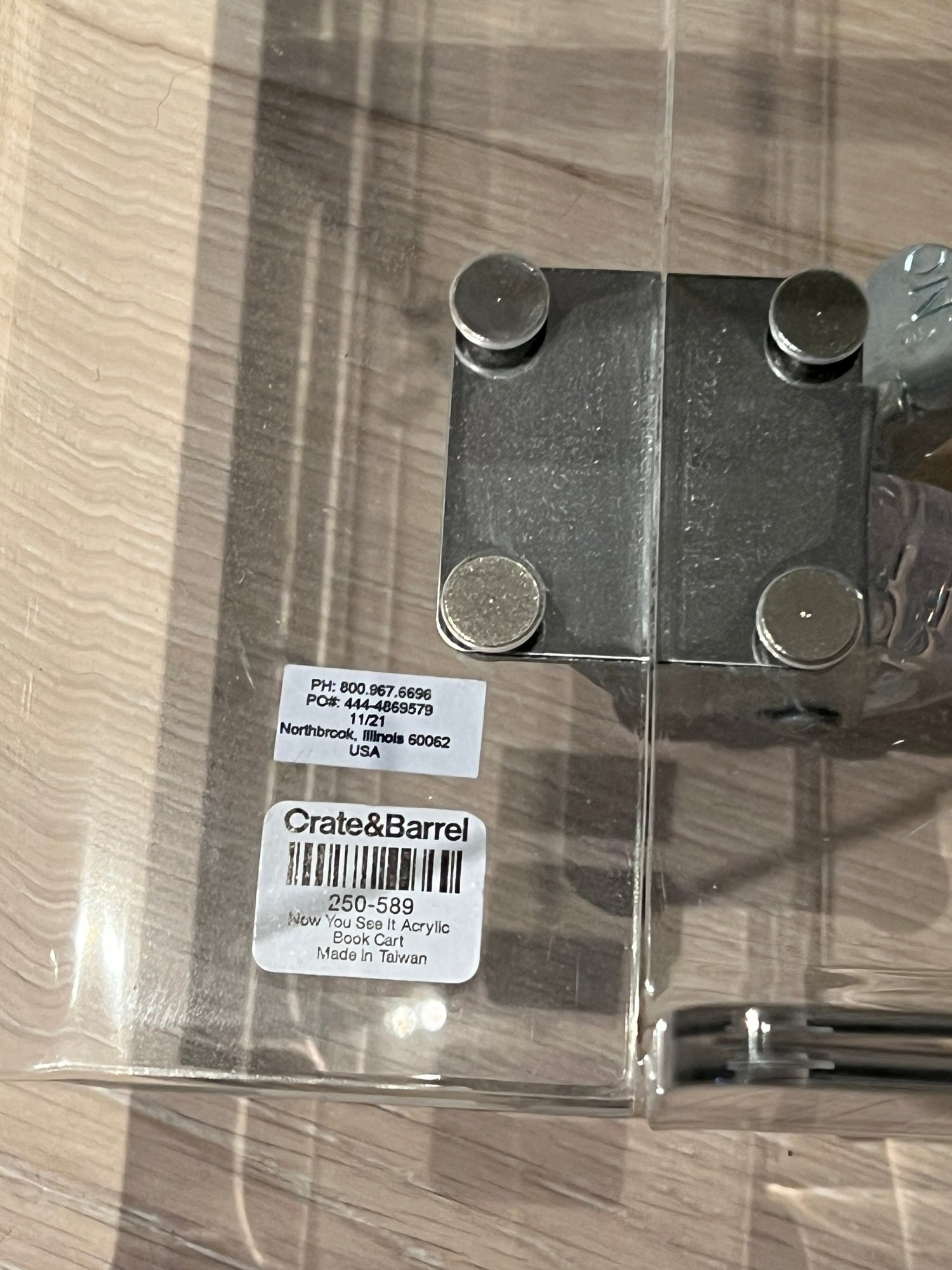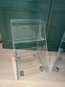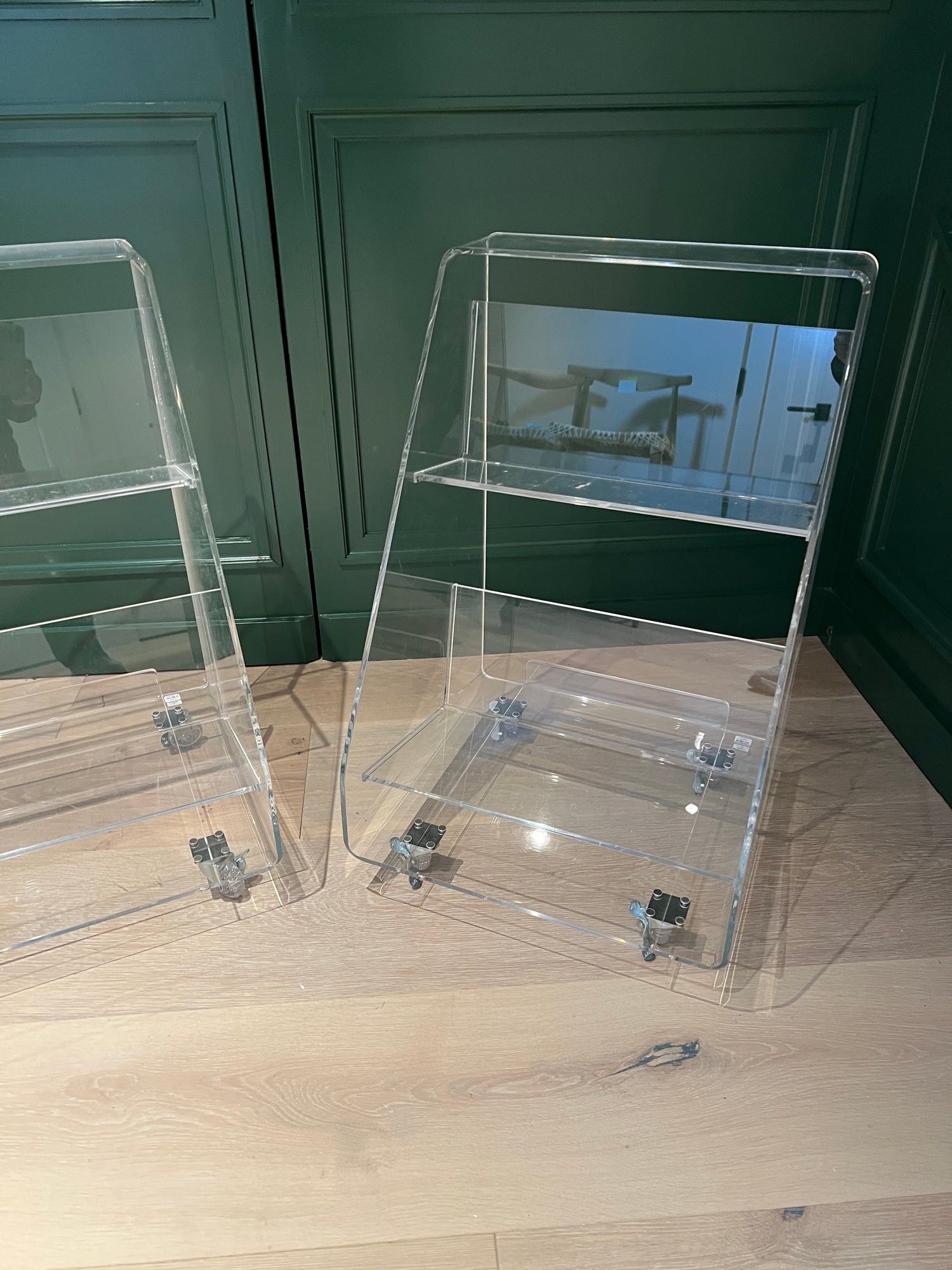 Pair of acrylic, modern, seamless bookcases. The precise acrylic construction makes your books appear to float on both casters. Shelves can hold up to 20 LBS on top and 30 LBS on the bottom.
