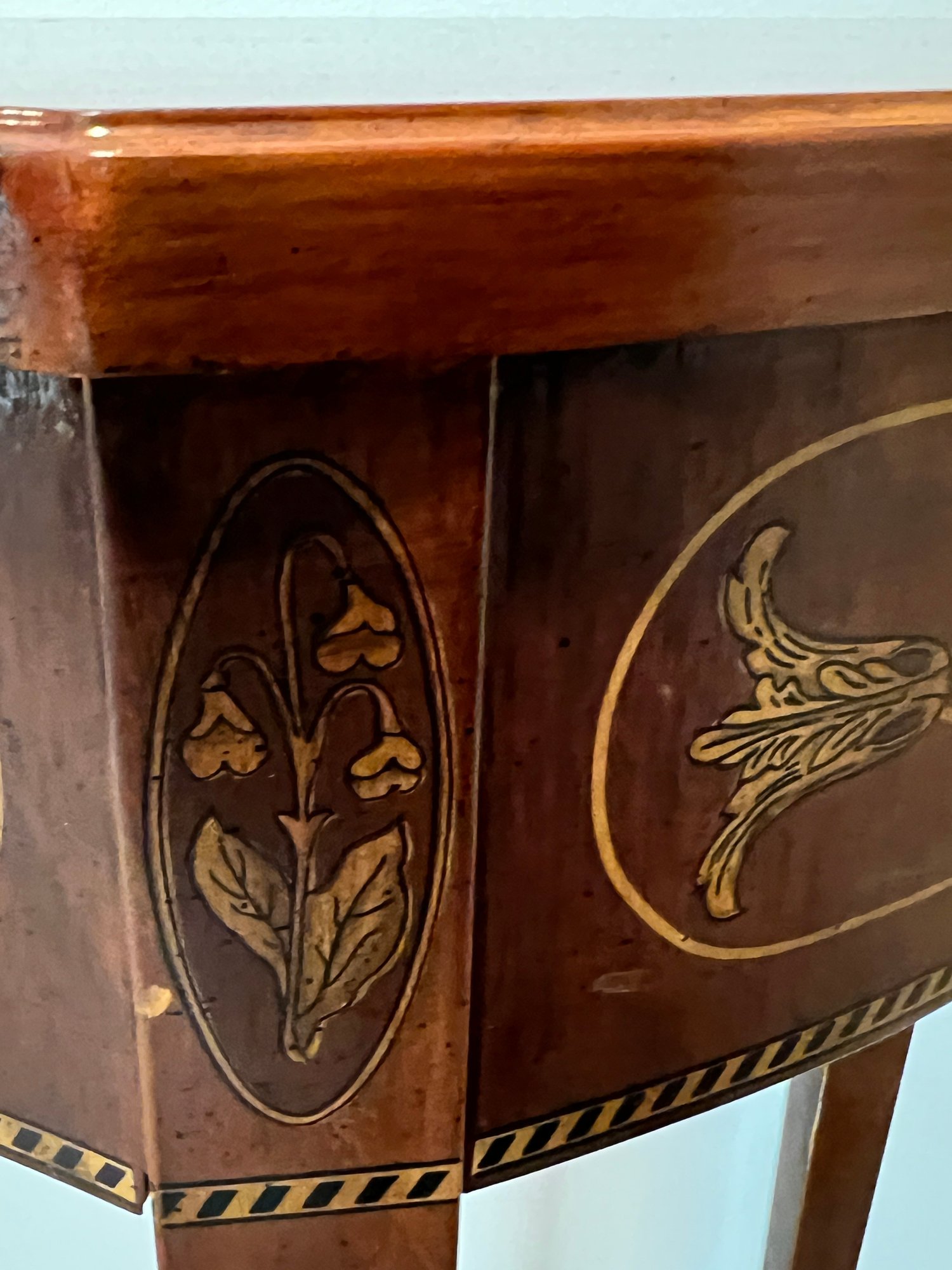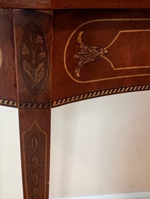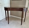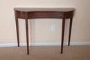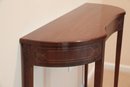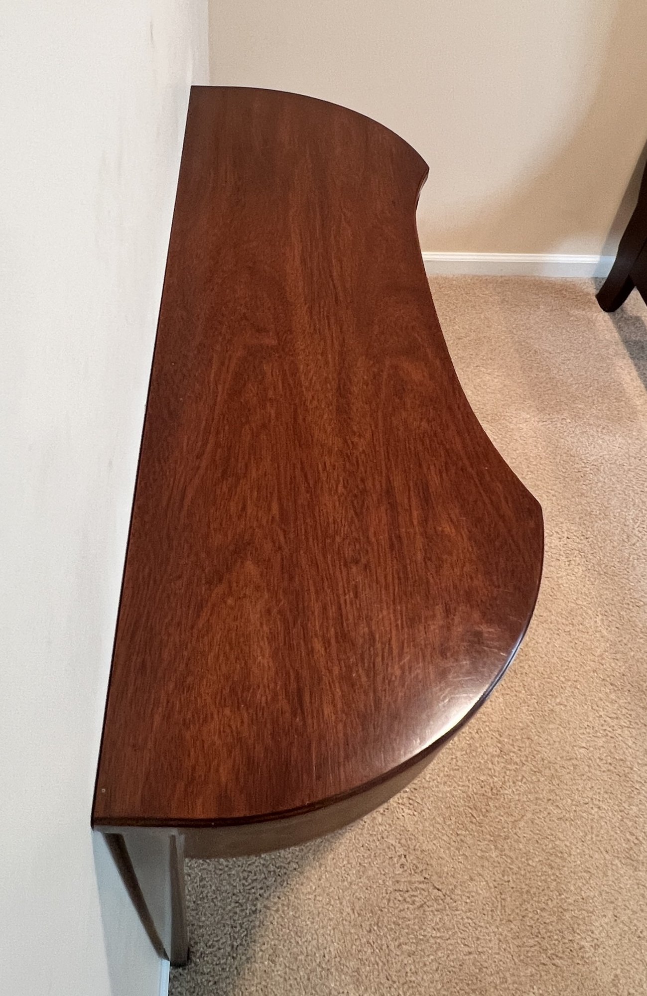 Curved Mahogany Top With four Straight Leg Wall Table. This is a fantastic reproduction of an antique version. Very sturdy legs, piece was in an upstairs hallway and did not get used much, very nice condition.