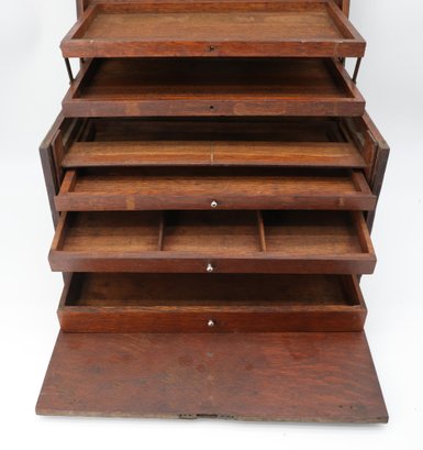 Condition report - three pull-out drawers; the bottom drawer is missing a nail, and the top has two platforms that pull up.