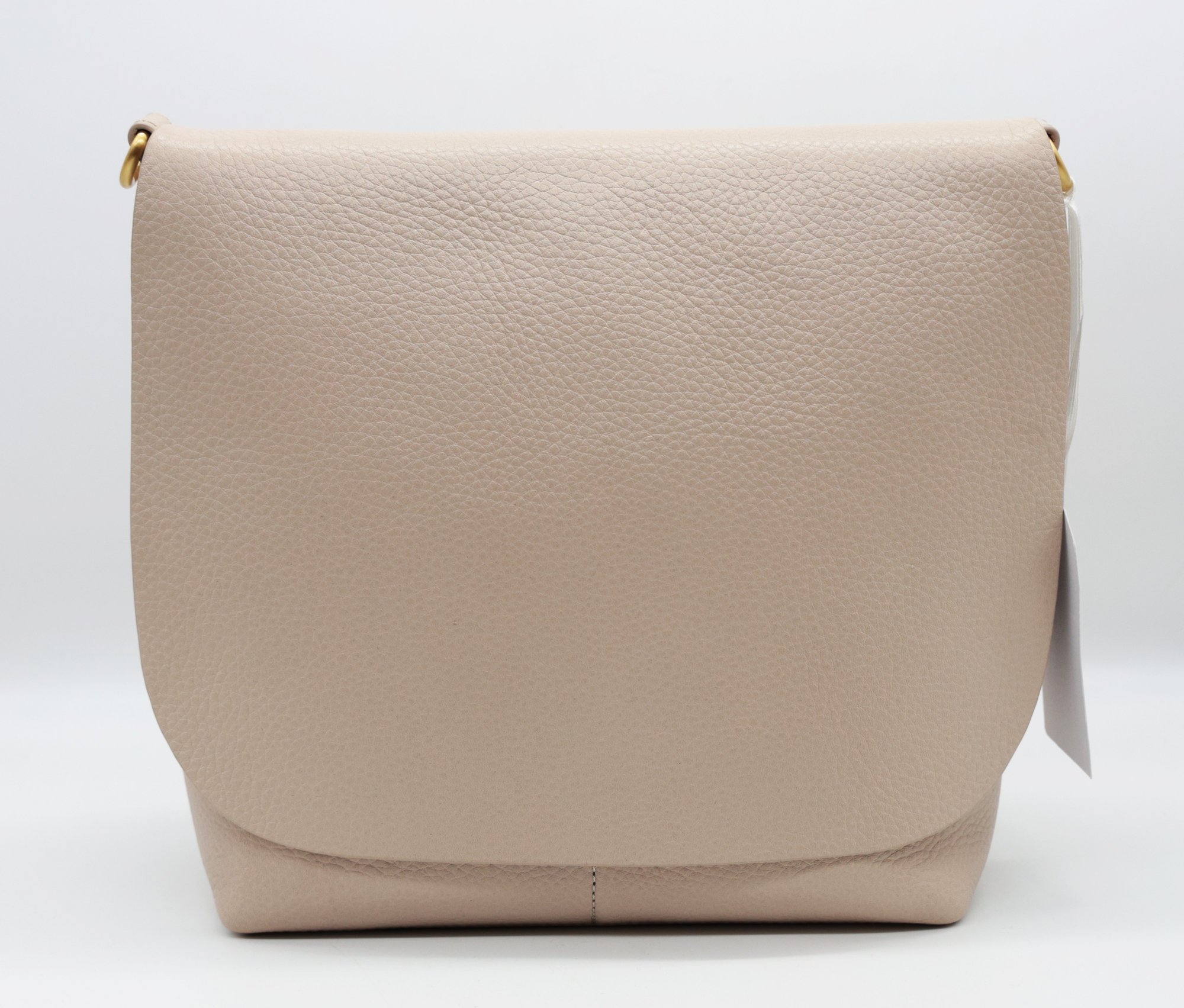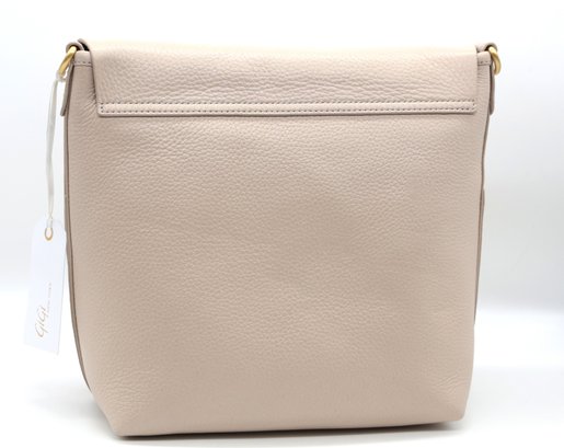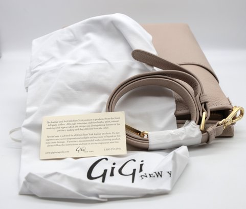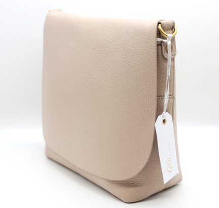 Gigi Designer Beige Leather Unused Handbag with two front pockets, one inside pocket, zipper closure, and strap enclosure. nice condition.
