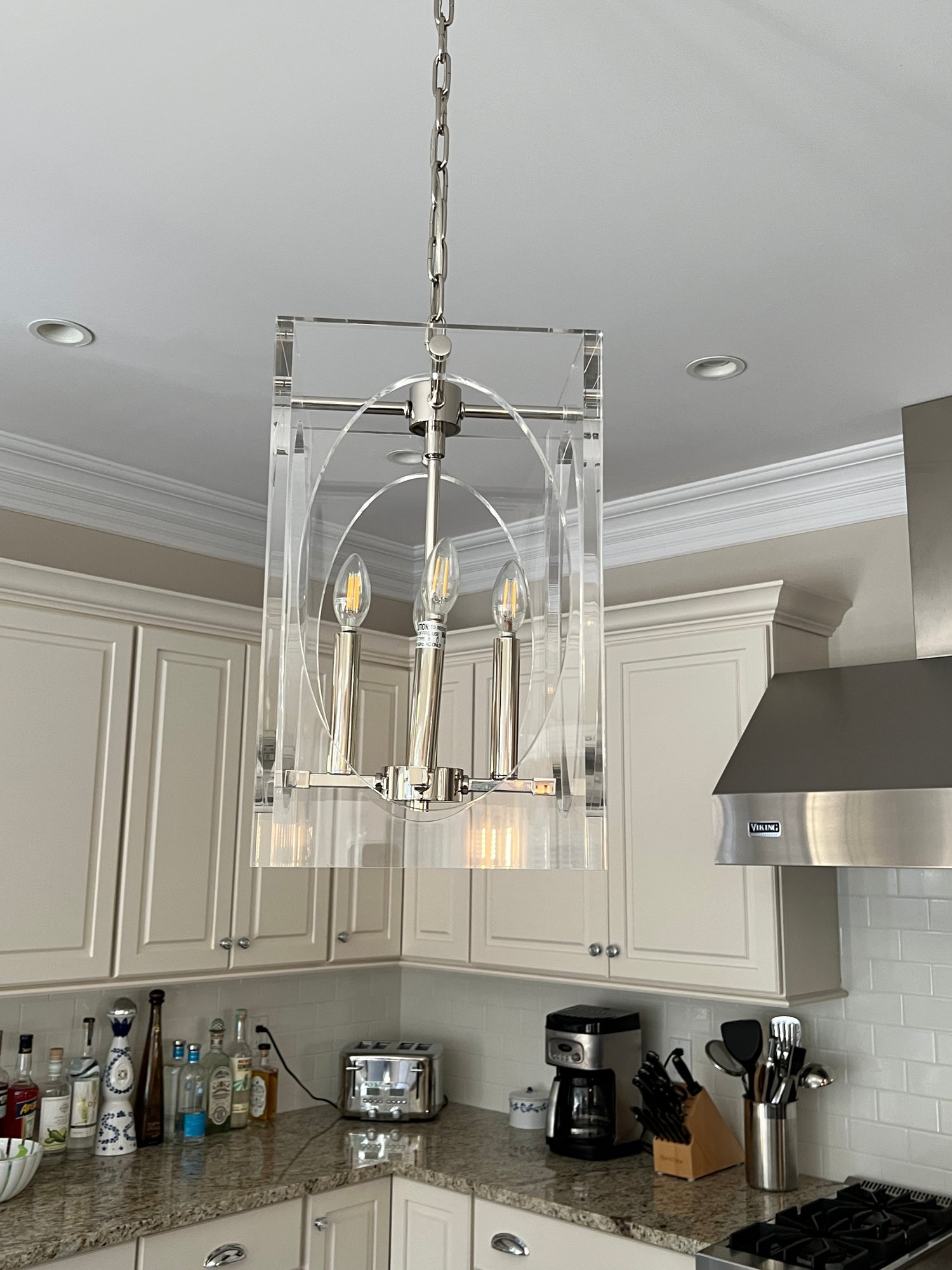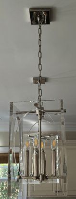 Drake four light acrylic lantern chandelier with polished nickel. Nice condition