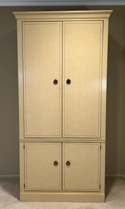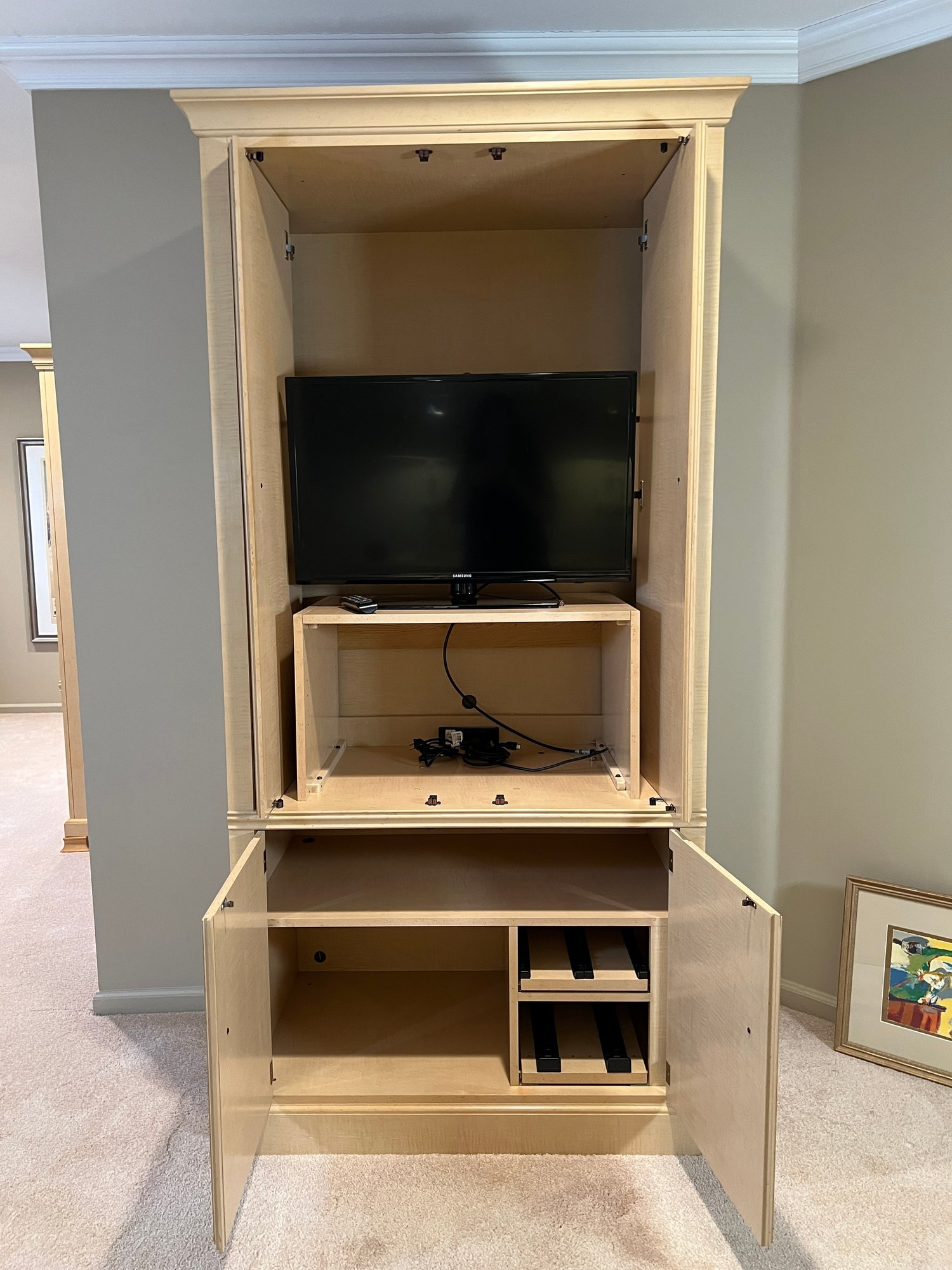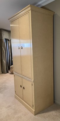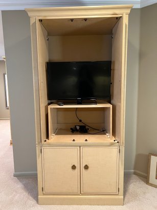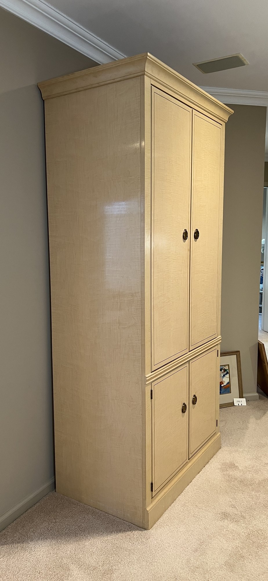 Drexel Heritage "Status Collection" Hollywood Regency Vintage Armoire/ tv cabinet with lower shelf and doors pulling in and out. Samsung TV with remote included (Model UN32EH4003F) . White-washed tiger-striped maple wood lacquer finish with inlay. Brass pulls, six drawers slide in and out nicely. Lovely condition. Professional mover required