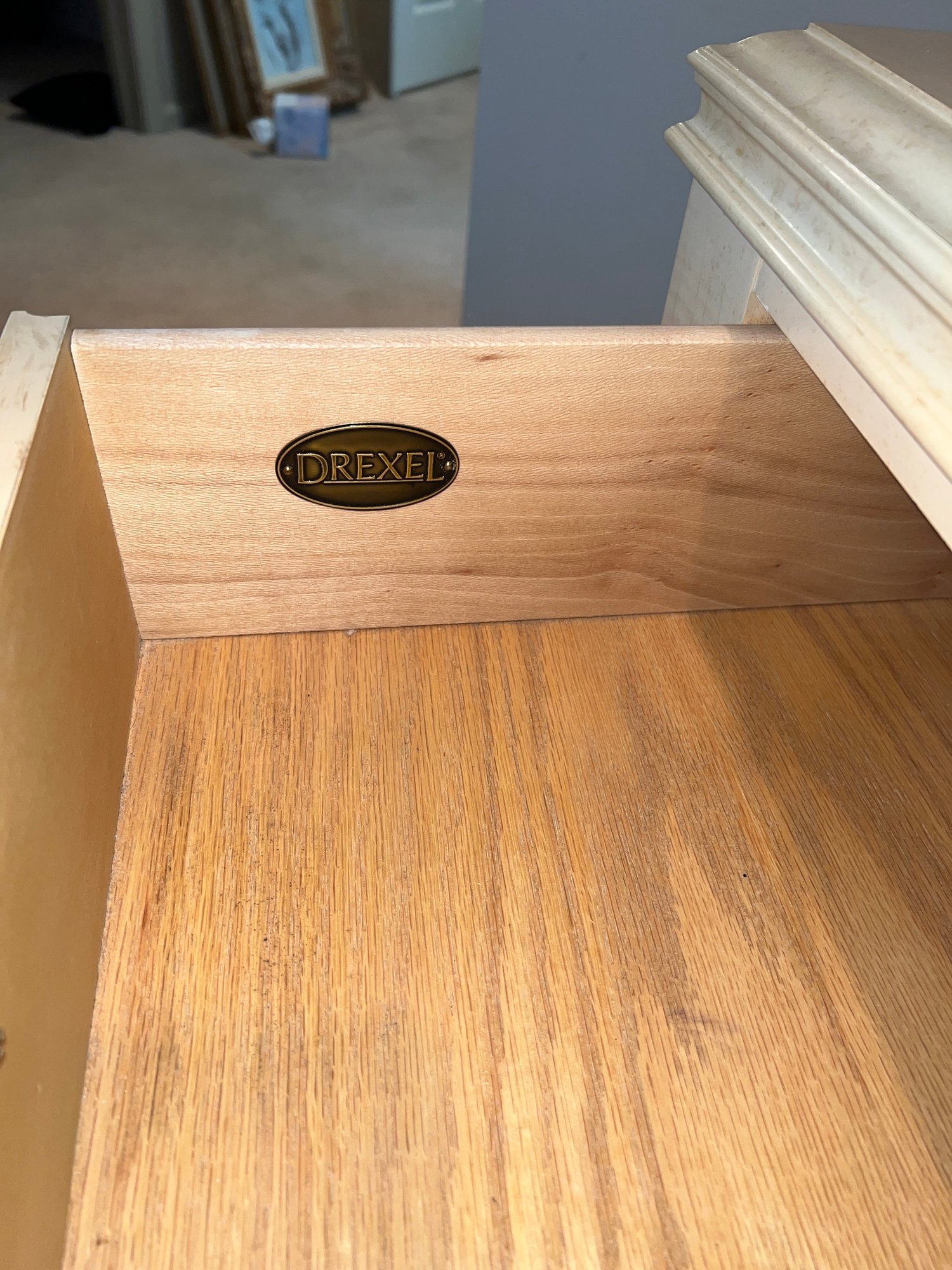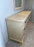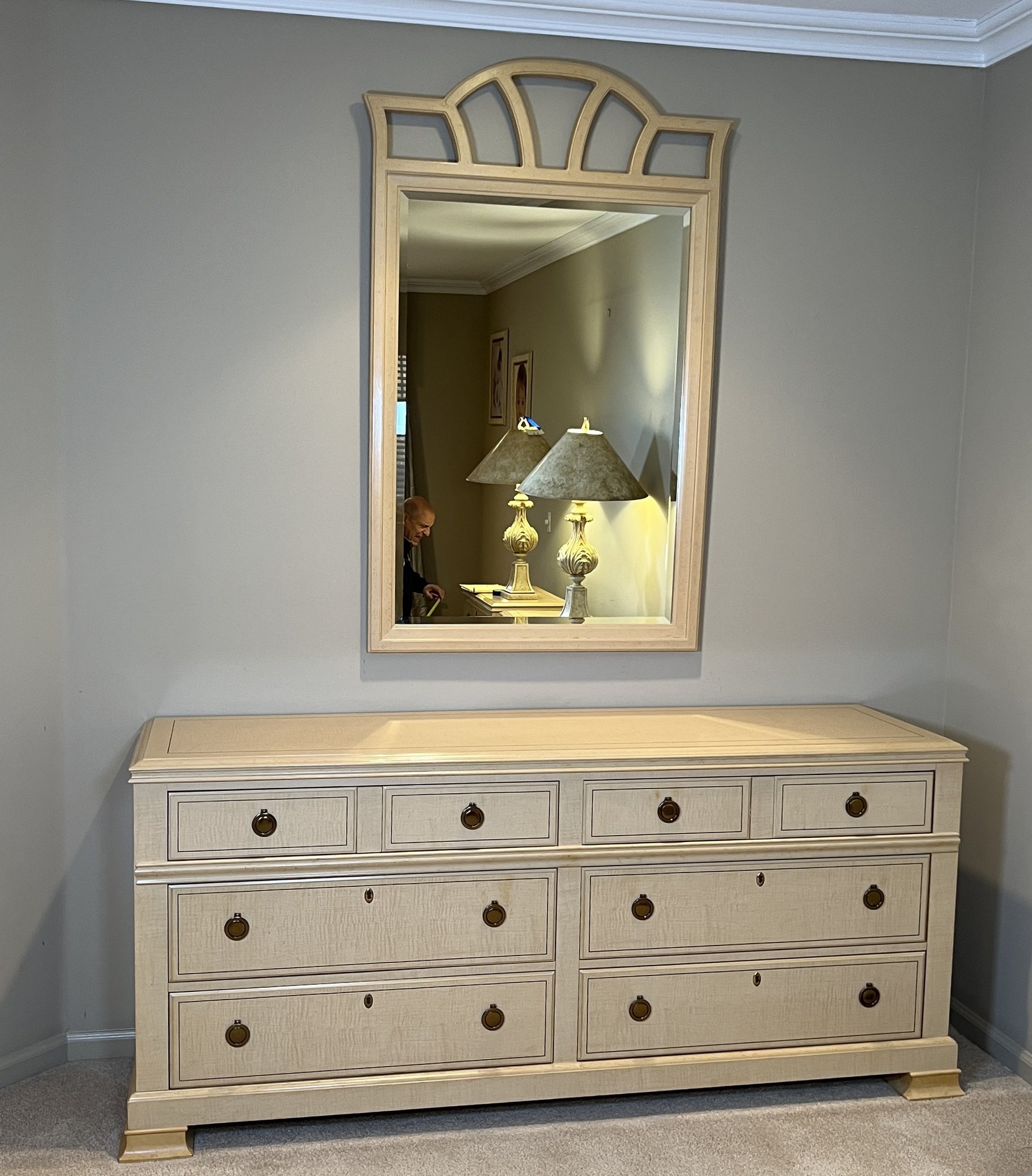Drexel Heritage "Status Collection" Hollywood Regency Vintage dresser with mirror. White-washed tiger-striped maple wood lacquer finish with inlay. Brass pulls, six drawers slide in and out nicely. Lovely condition. Professional mover required