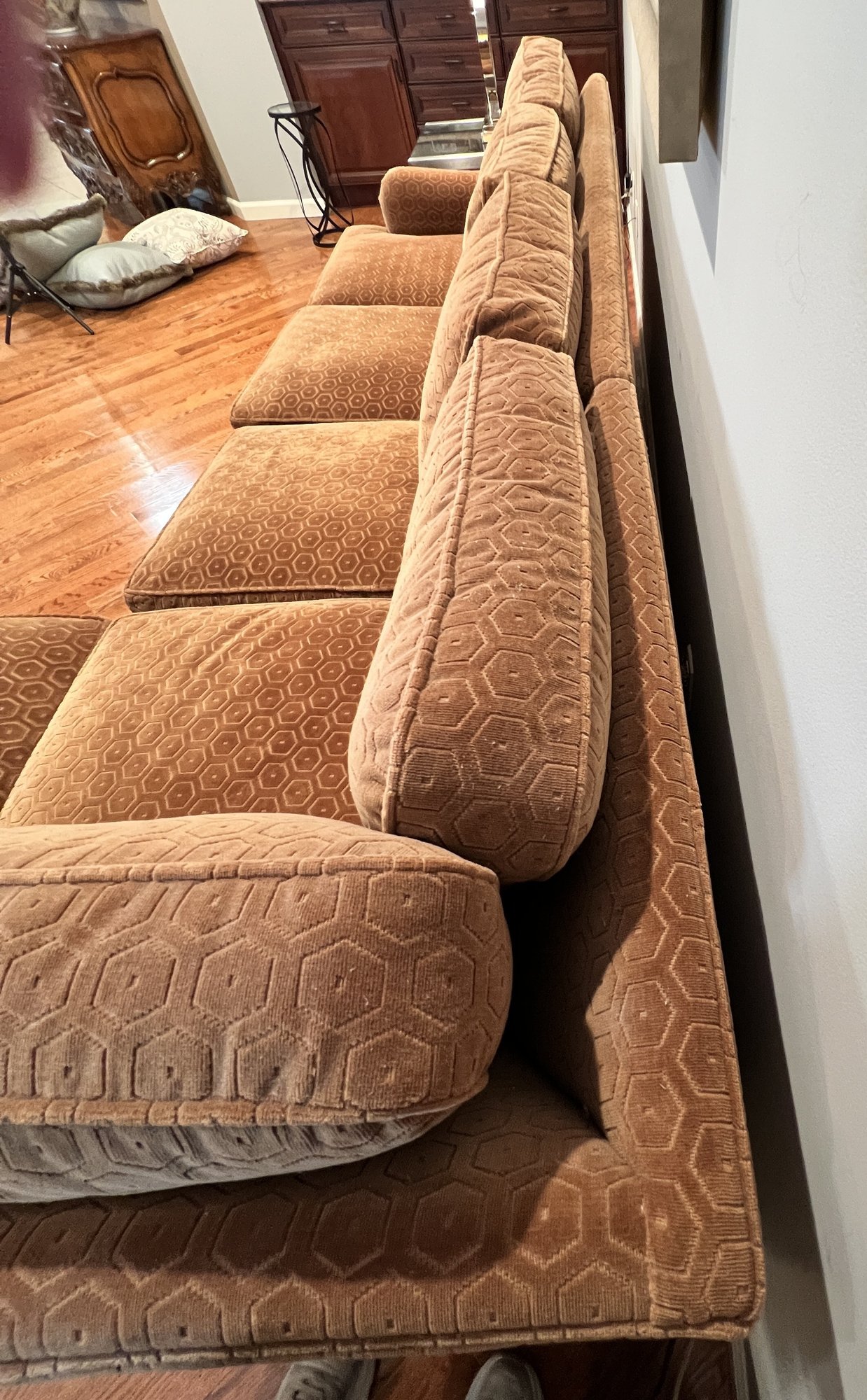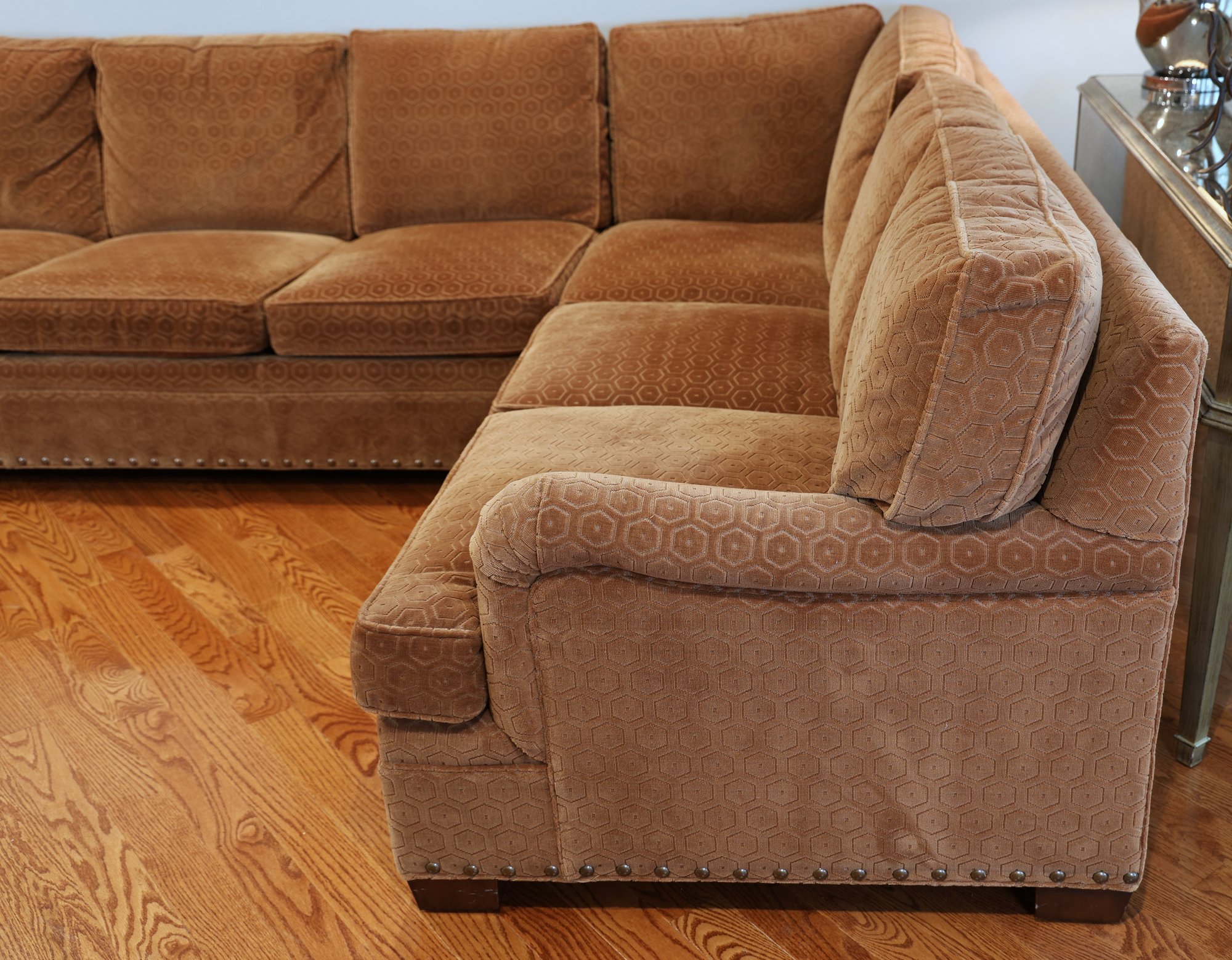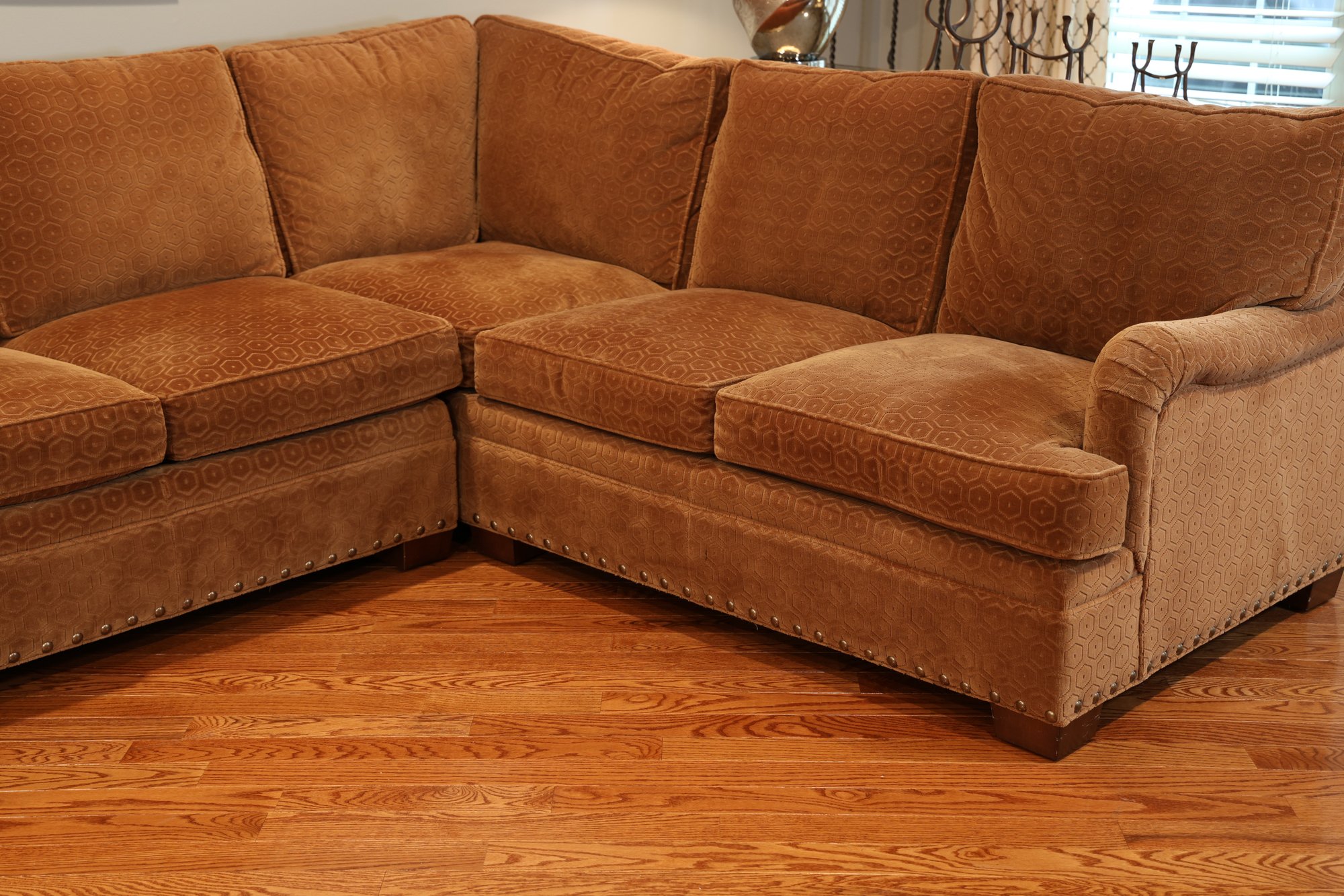 Duralee Fine Furniture Duck Down and Duck Feather Sofa, extremely comfortable. Very sturdy barely sat on with a lovely modern pattern and nail heads lining the base. Two pieces