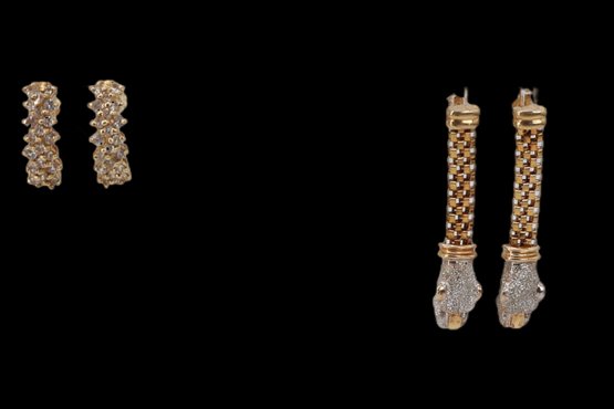 The pair on the right are drop earrings with a woven gold-mesh tube and a diamond-studded panther-head clasp. The pair on the left are shorter, broader stud earrings featuring an all-over diamond cluster set in gold.