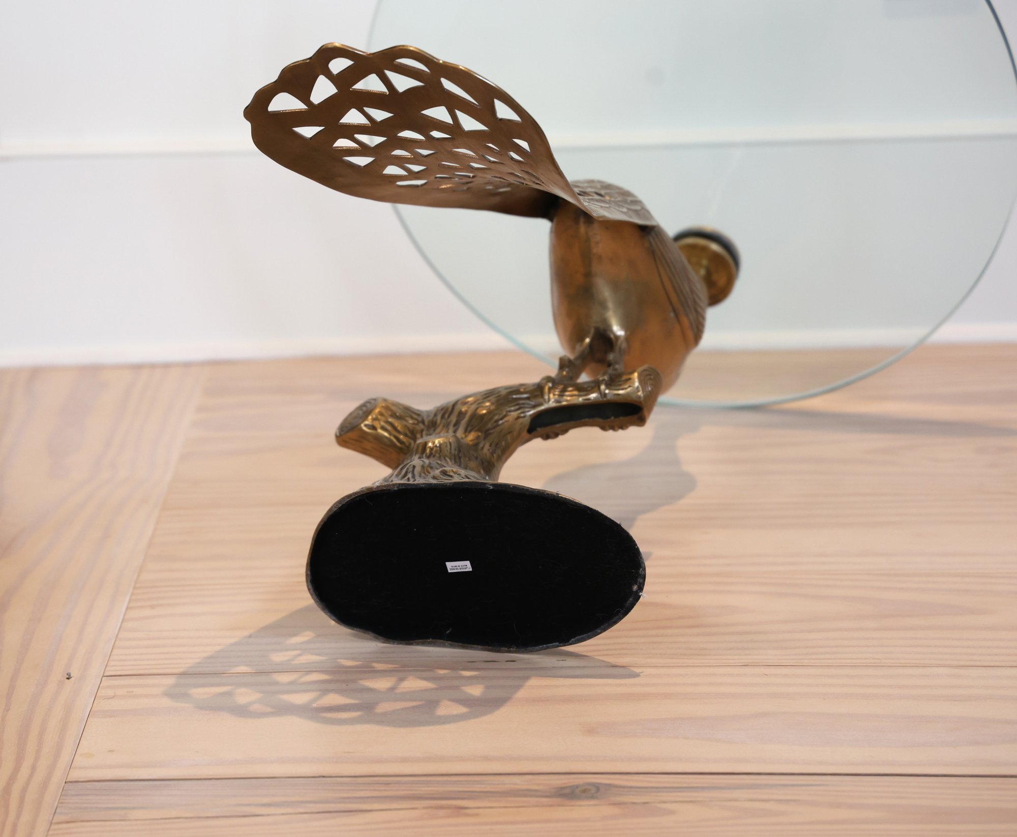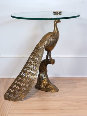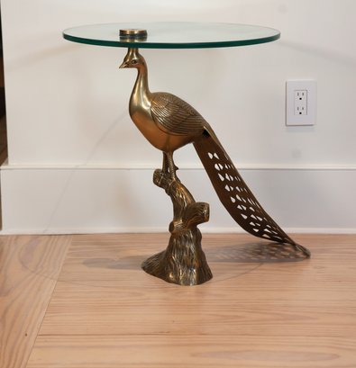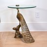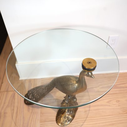 Brass peacock with glass tabletop. Perfect in any space!! Brass finished iron side table.