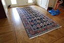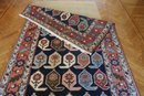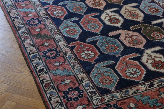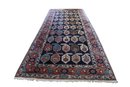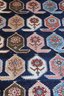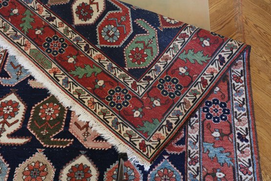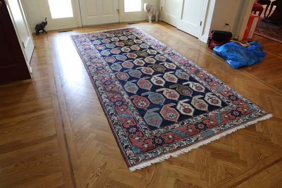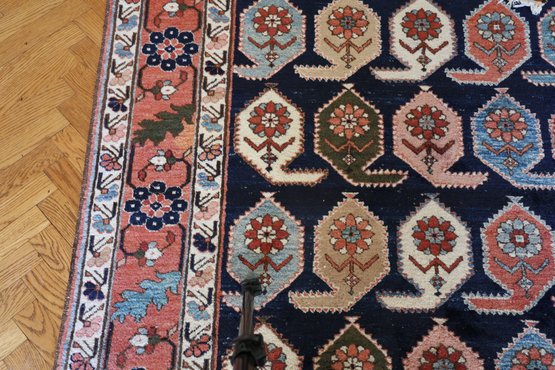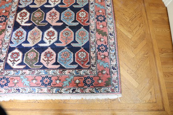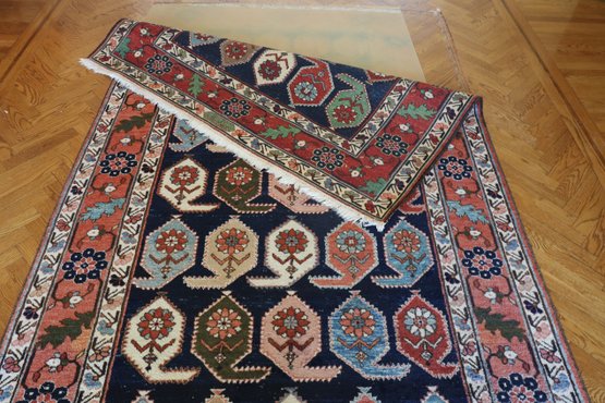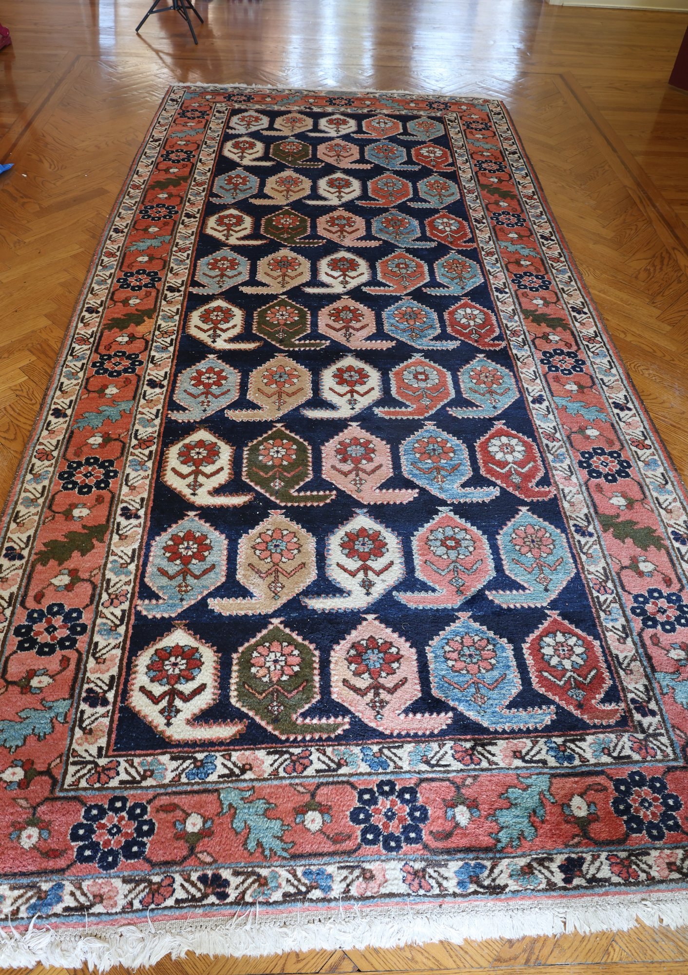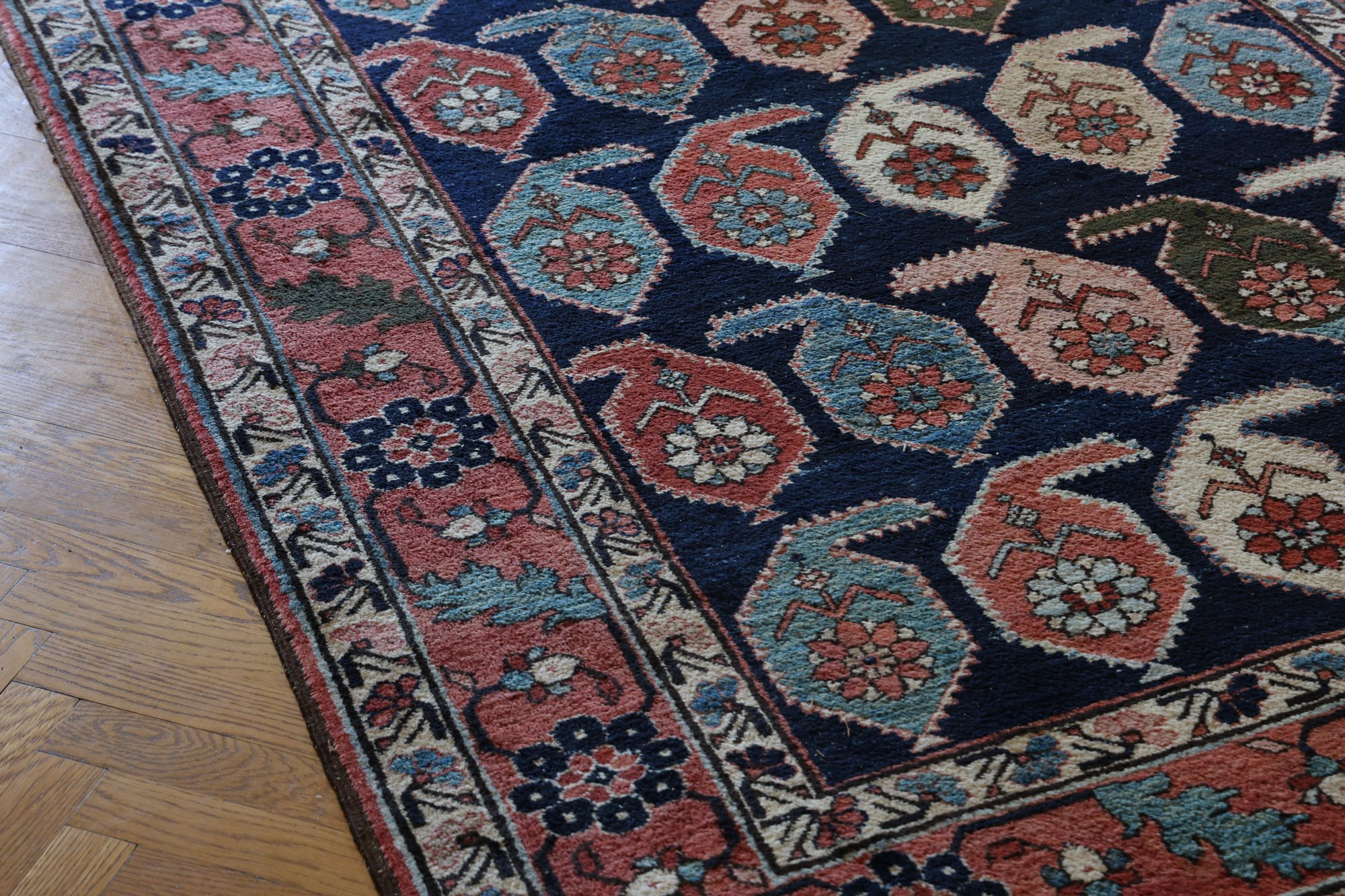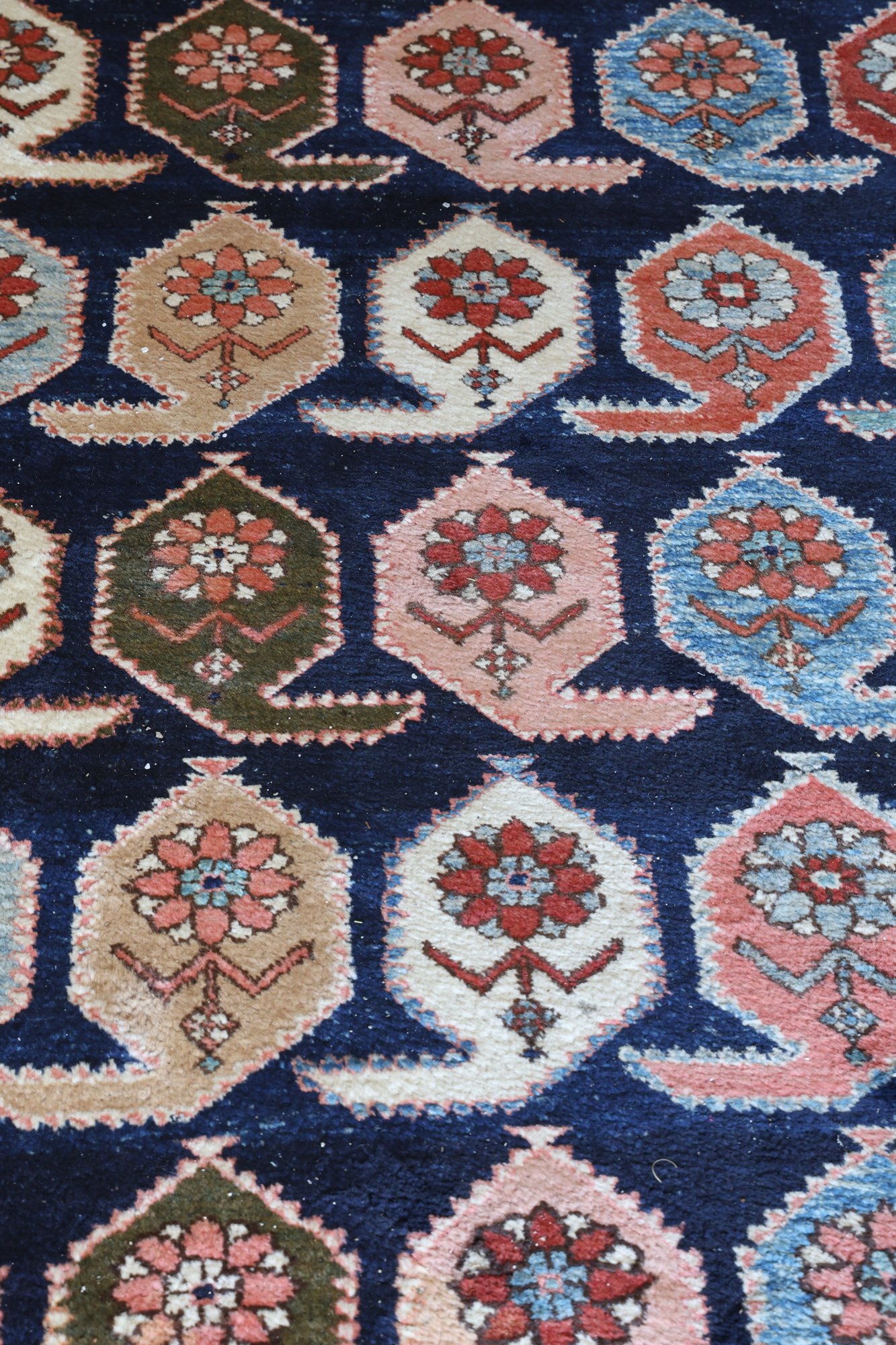 Vintage rug is hand knotted Persian featuring bold, geometric tribal patterns with a floral motif.