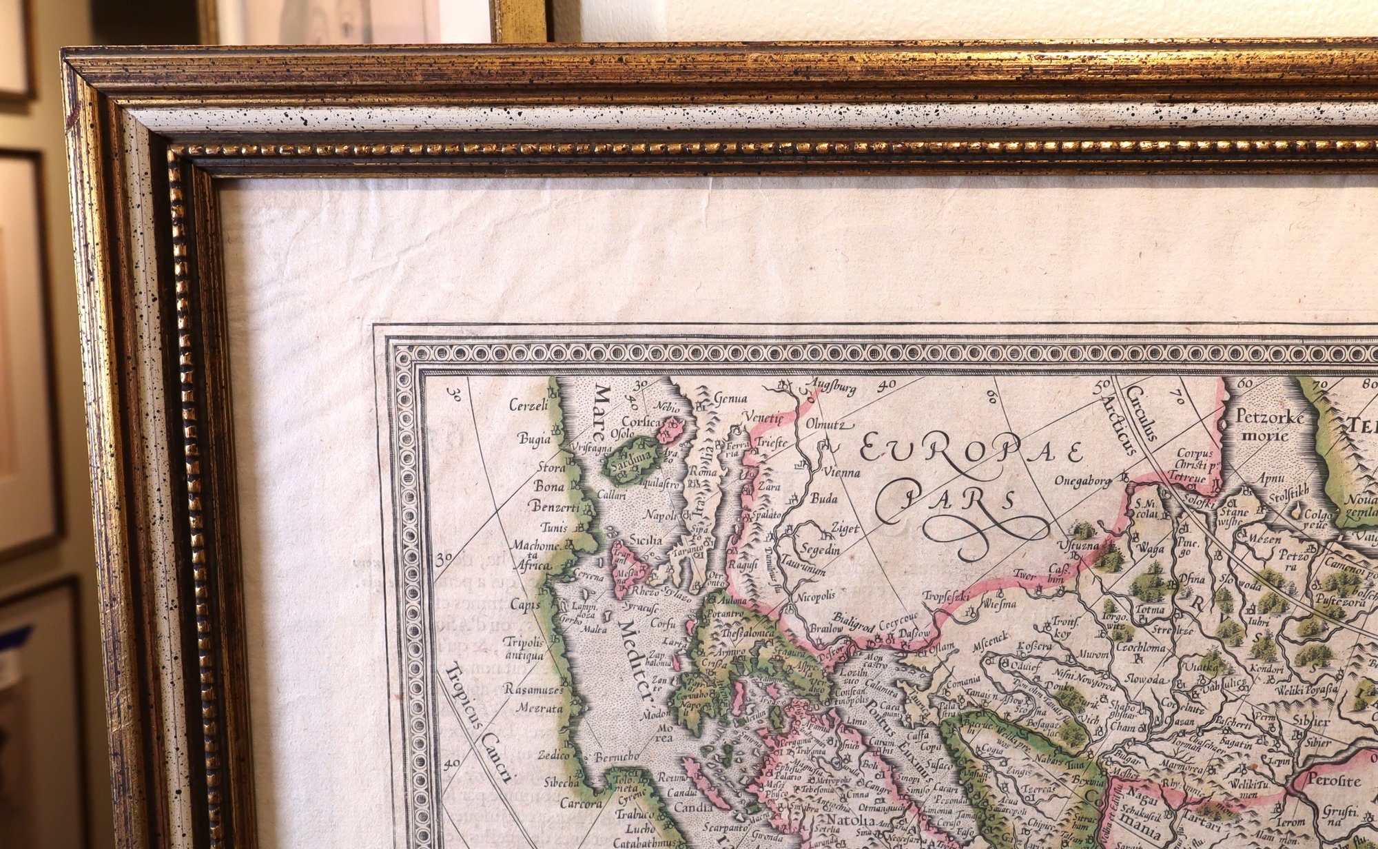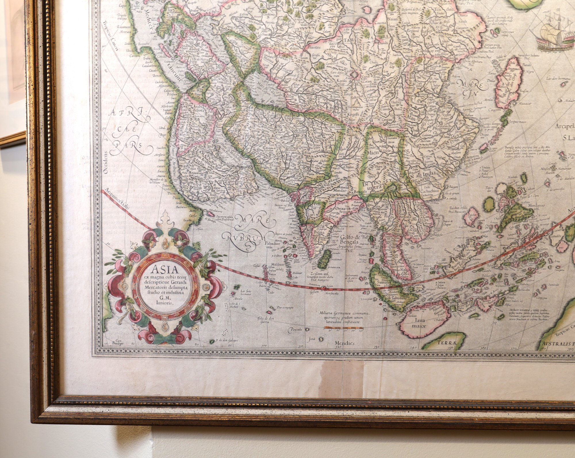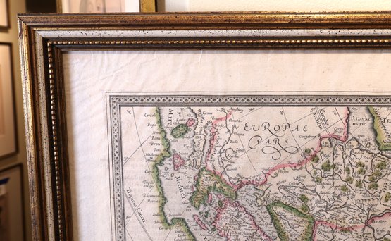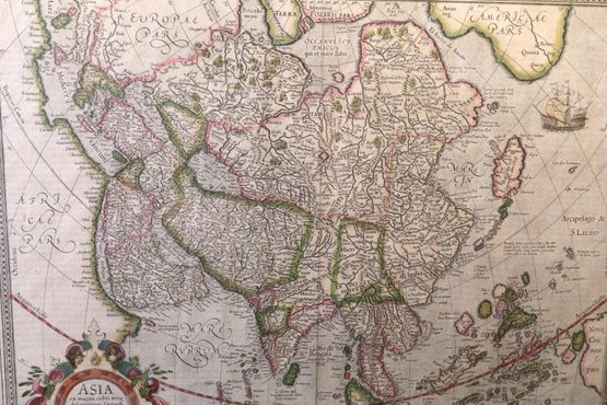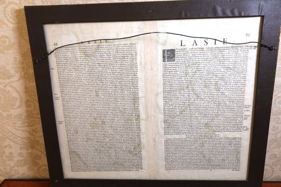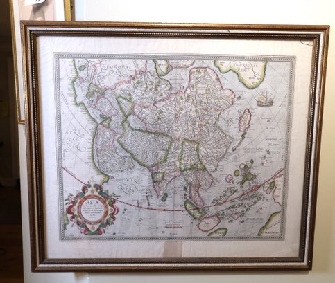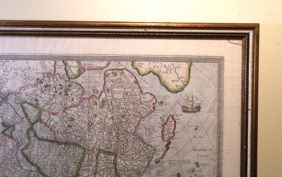 Original publication from 1595, reprinted in the 17th century with a decorative title cartouche featuring a map of a large sailing ship. The paper material measures 22.5" x 19.5", and it comes framed. However, there is a right corner tear. It is part of a private collection in NYC.