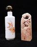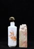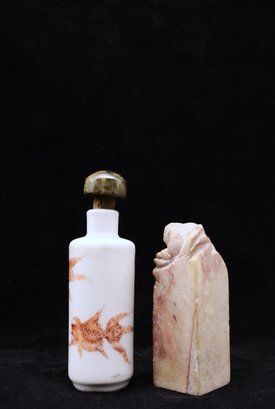 One porcelain snuff bottle with snuffer in wood. Koi on outside of bottle - OLDIE 3"H