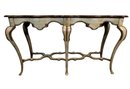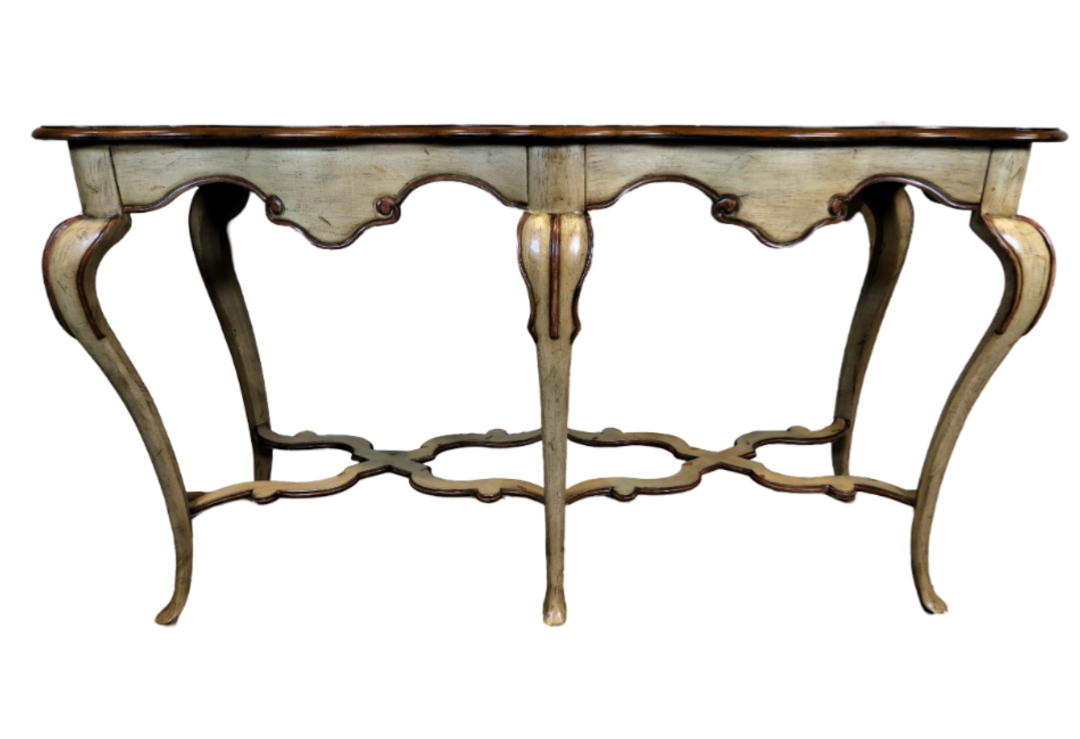 This curvaceous elegant console table is sleek with tapered cabriole legs. It has winding edges and curled apron. Two toned woods, poplar solids and birch veneer.