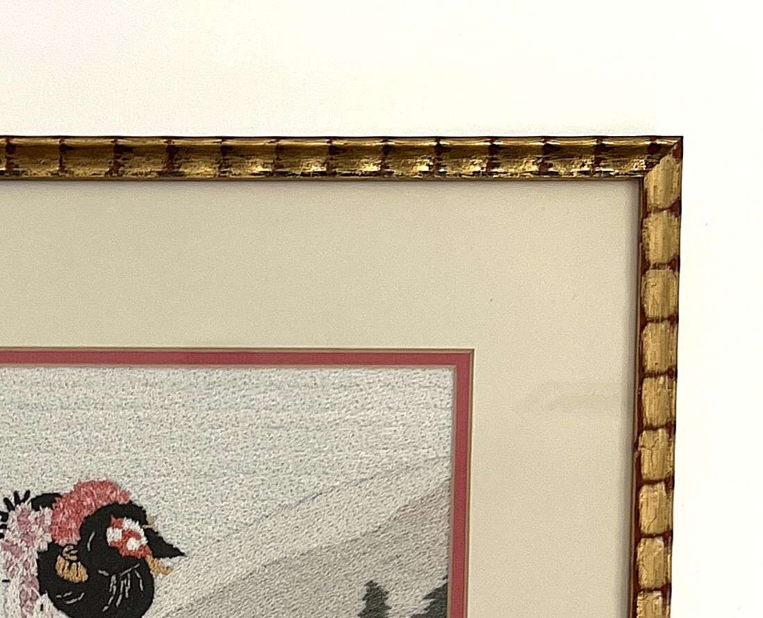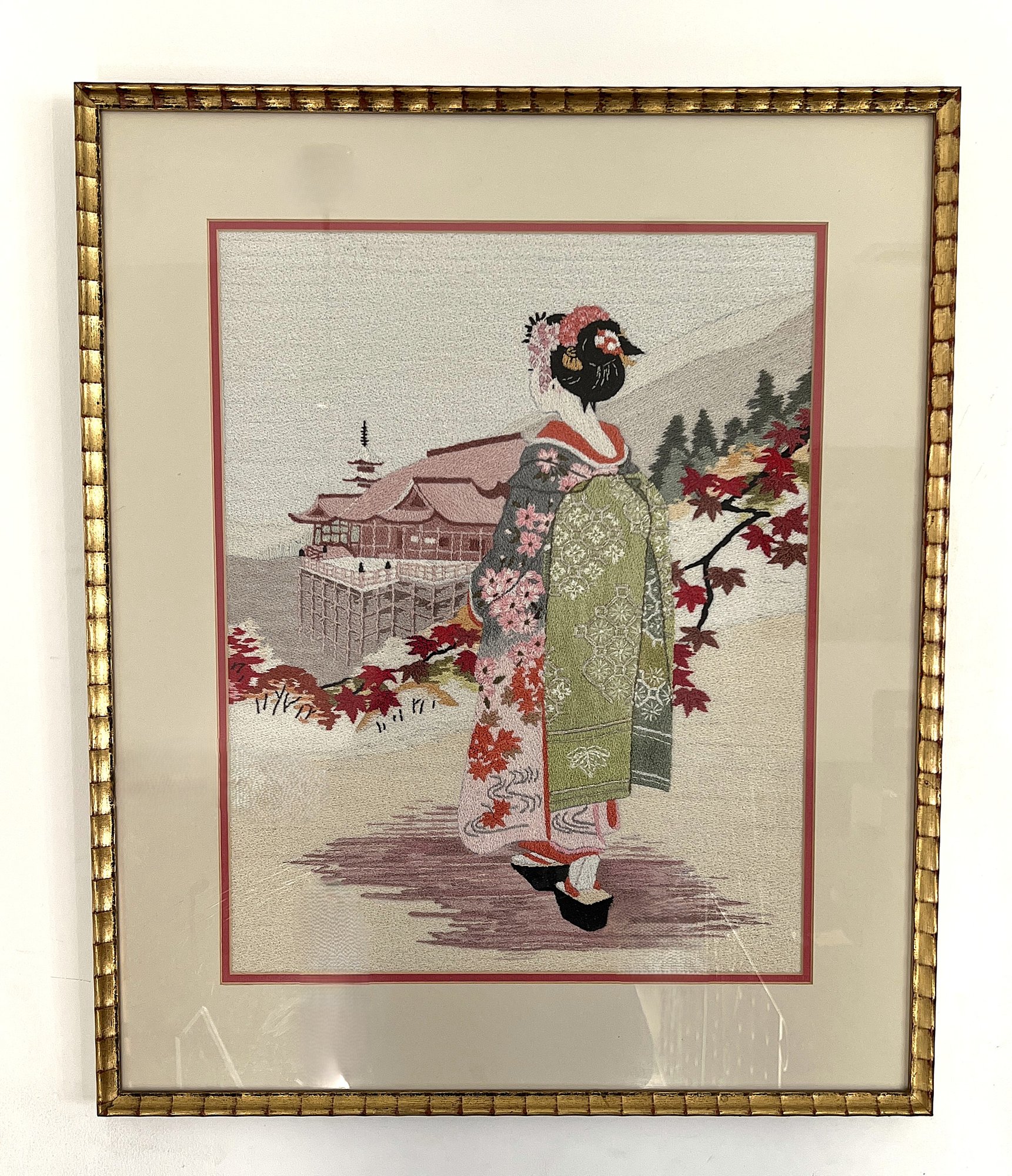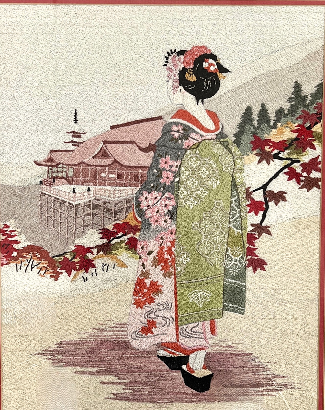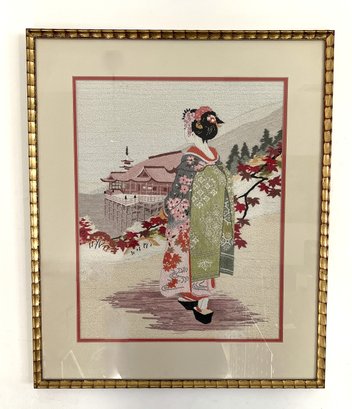 This embroidered artwork features a Japanese geisha in traditional attire, set against the backdrop of a Japanese temple and landscape. The intricate embroidery, coupled with the traditional Japanese subject matter, creates a visually captivating artwork.