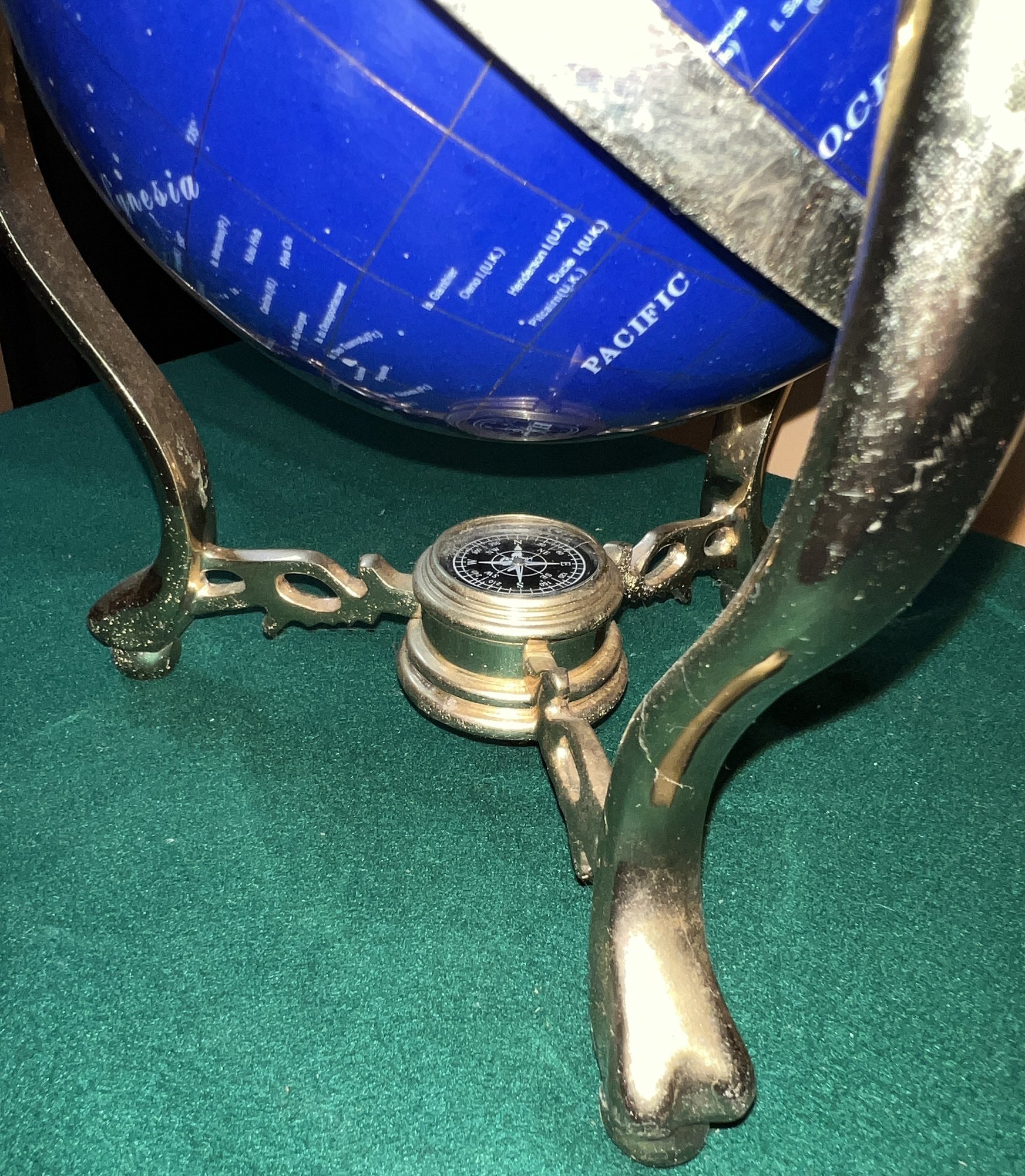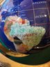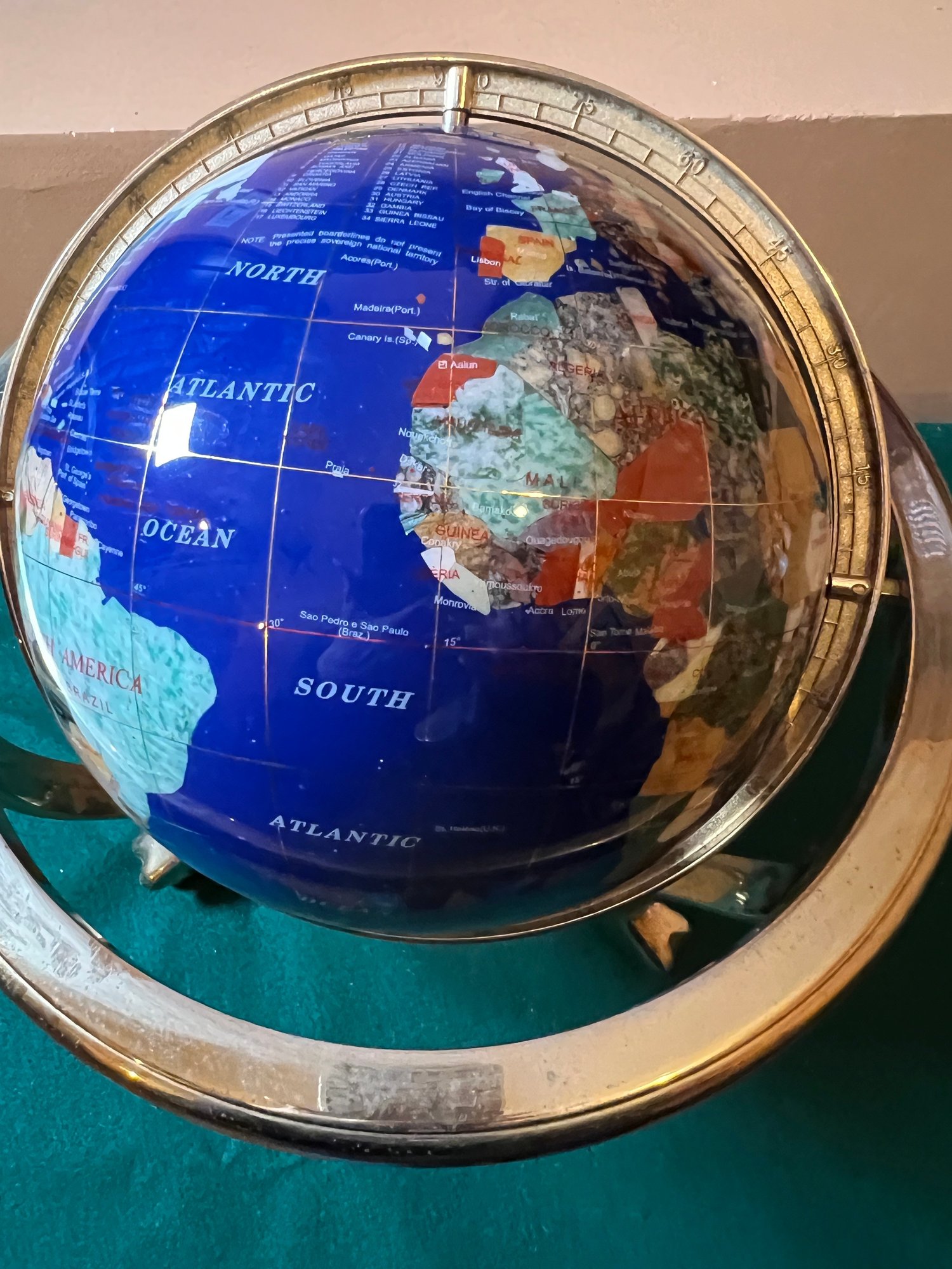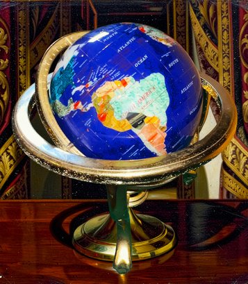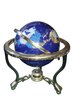 Gemstone inlaid world globe lapis lazuli stone with brass base (some pitting)