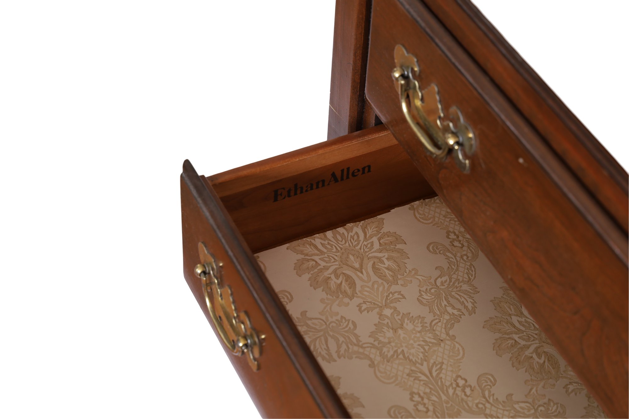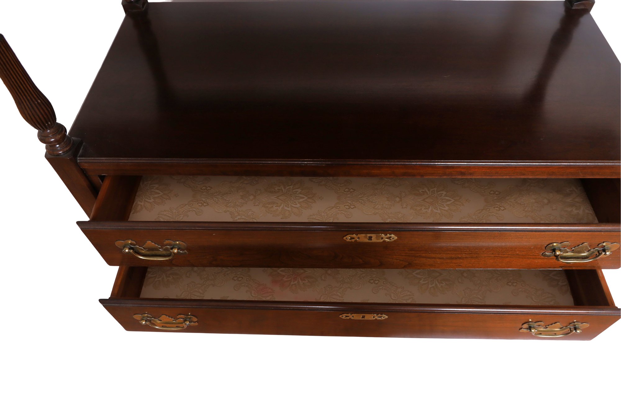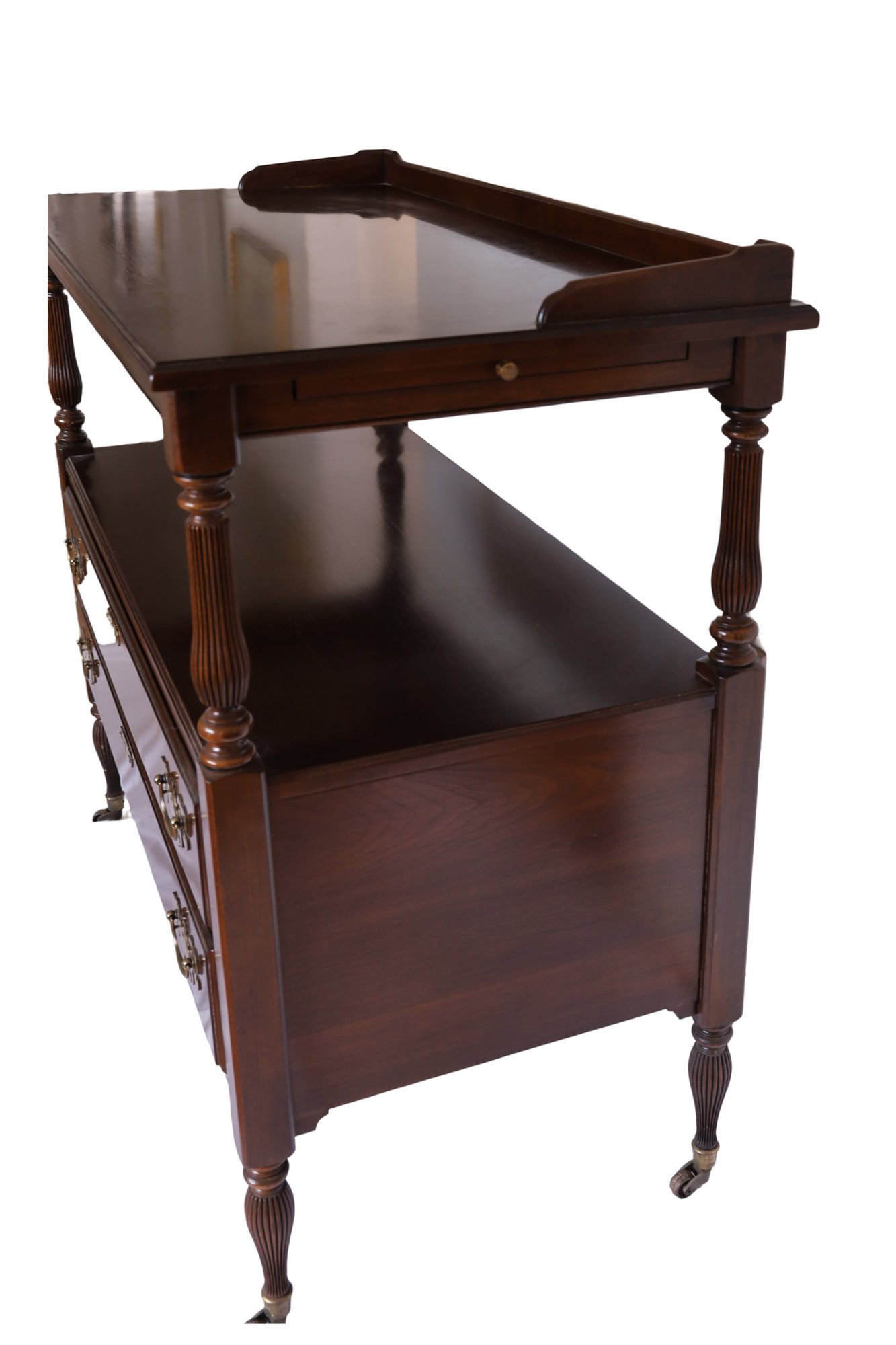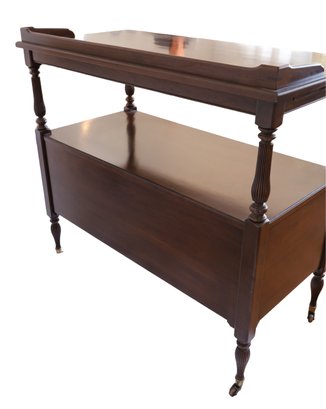 This mahogany vintage buffet features extensions on each side (12"), two attractive drawers, and brass feet. It is in good condition with normal signs of wear; see the photos. The dimensions are 40"W x 20"D x 35"H—a nice small size that fits anywhere!