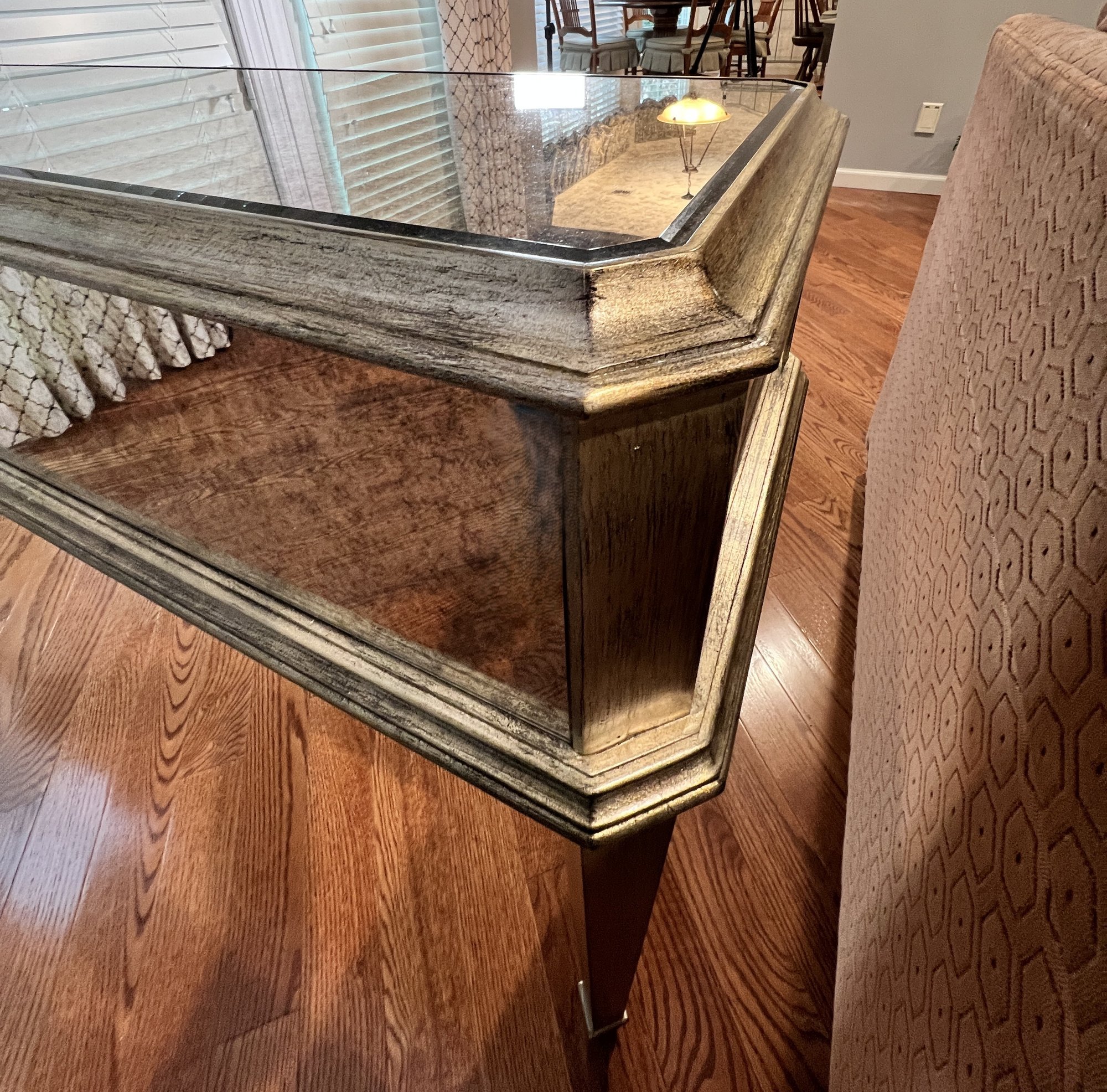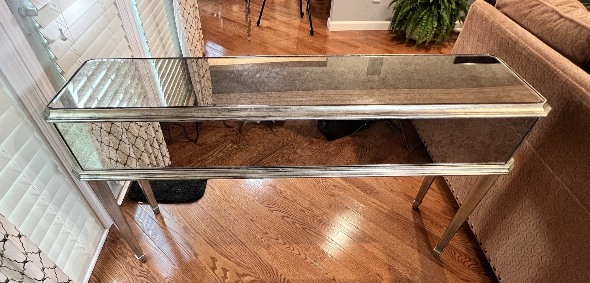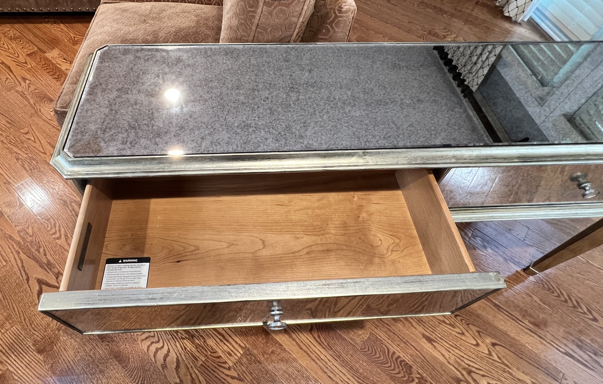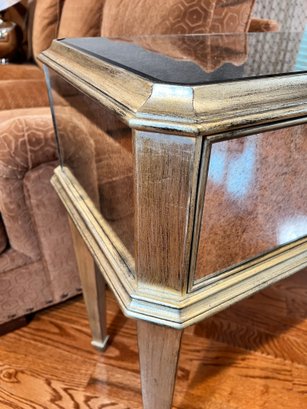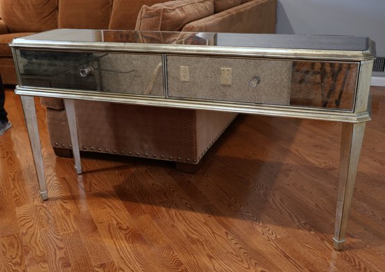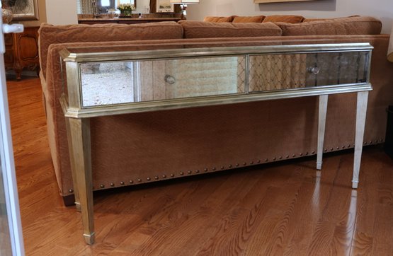 Two-drawer mirrored sofa table with soft black and gold trim and dovetailing.