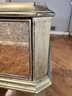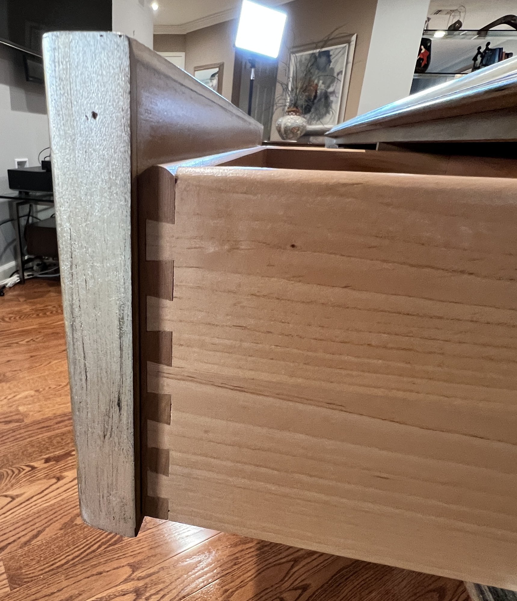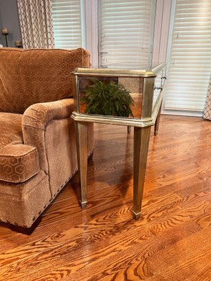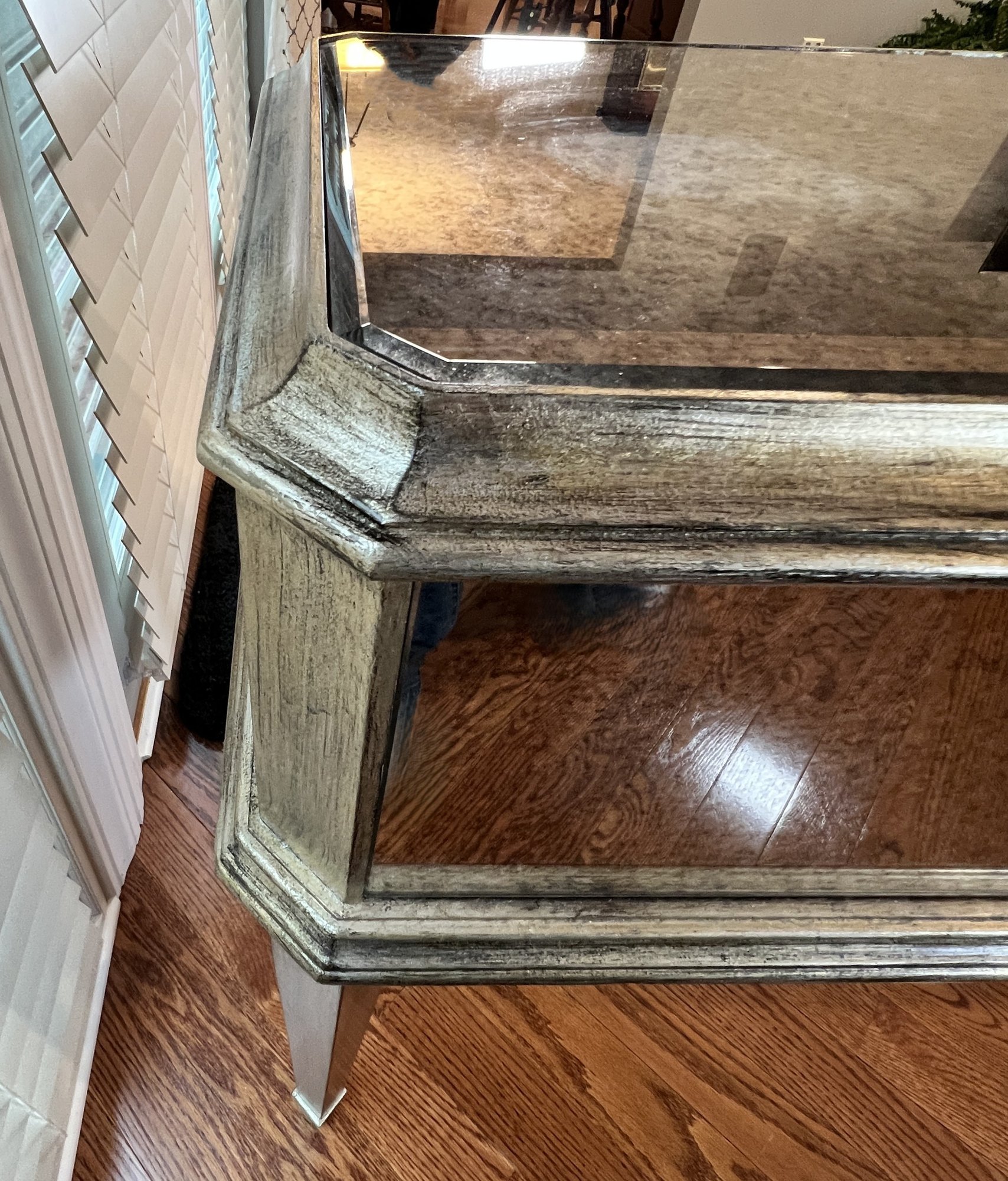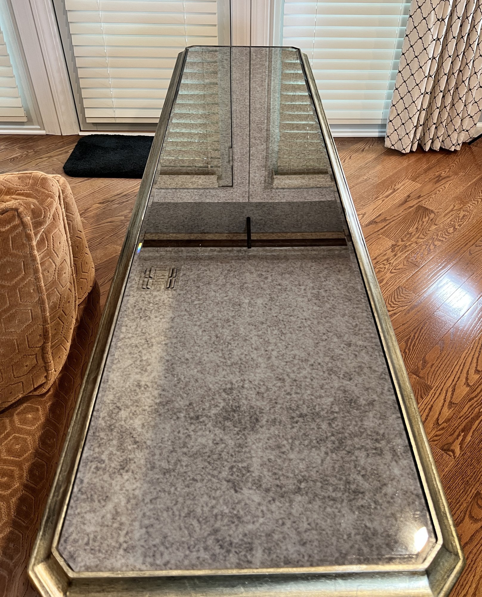Two-drawer mirrored sofa table with soft black and gold trim and dovetailing.