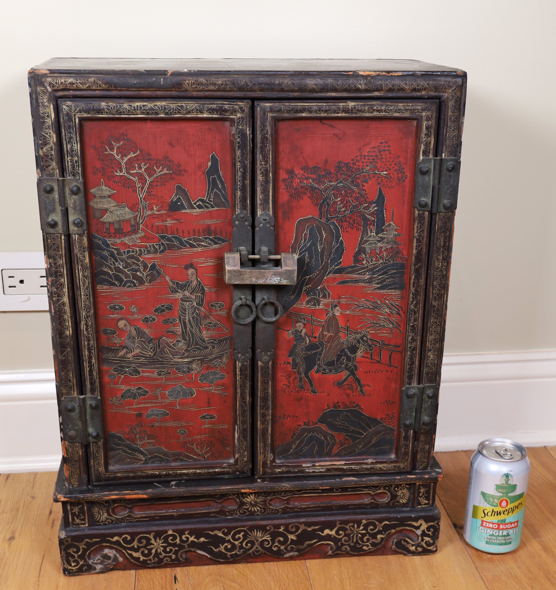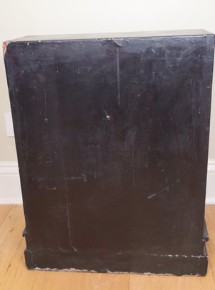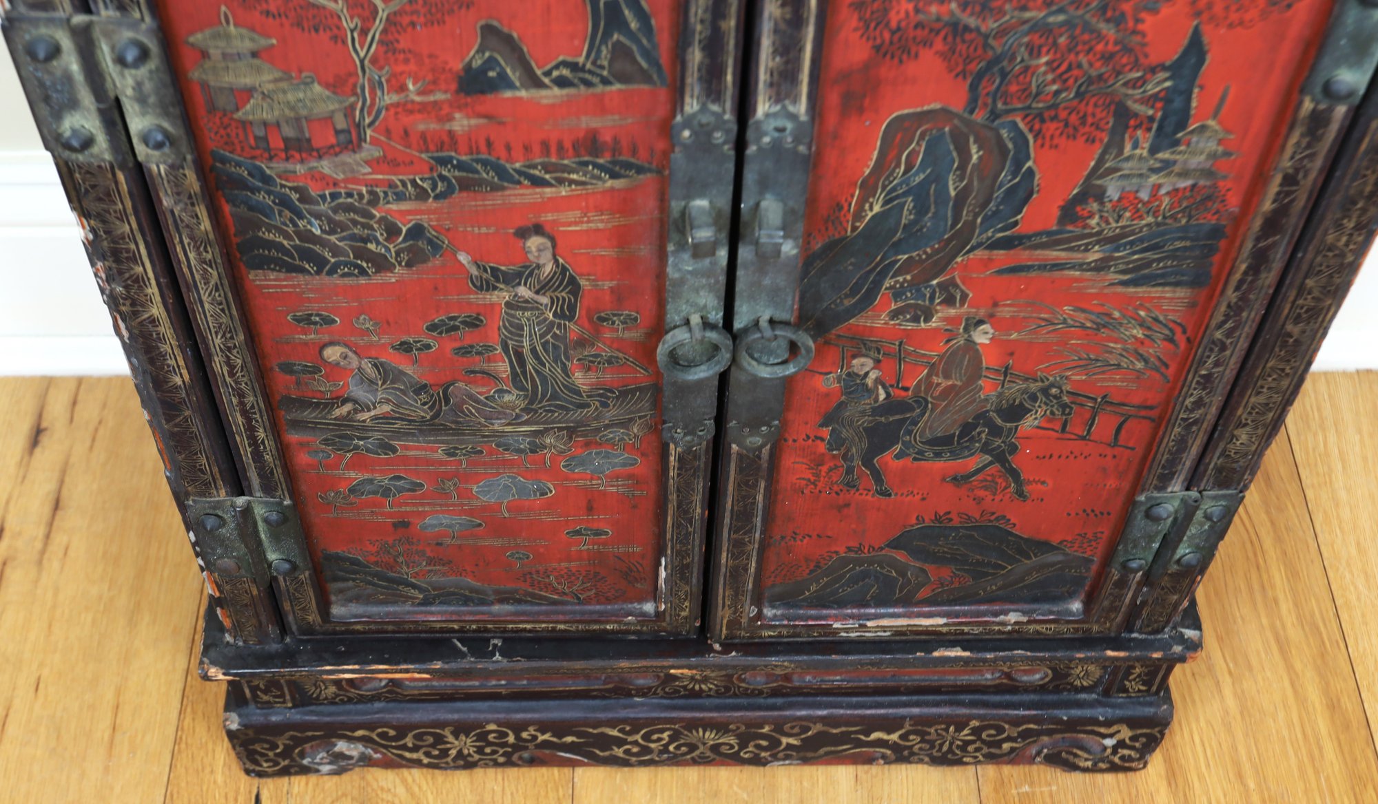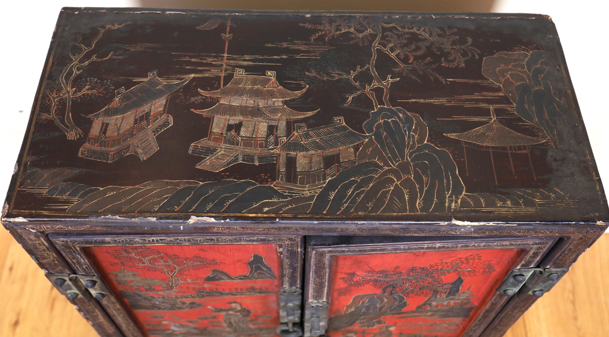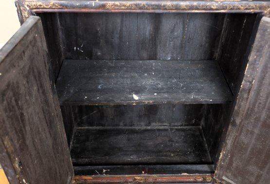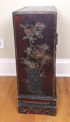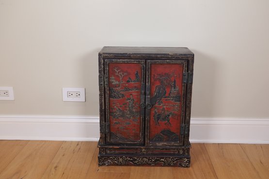 2 of 2 petite Early Chinese cabinet. Red and black with tons of detail. Red and black wooden cabinet with lovely figural scenes, Flowers, and landscape. It is an old brass lock with original hardware and one shelf inside.