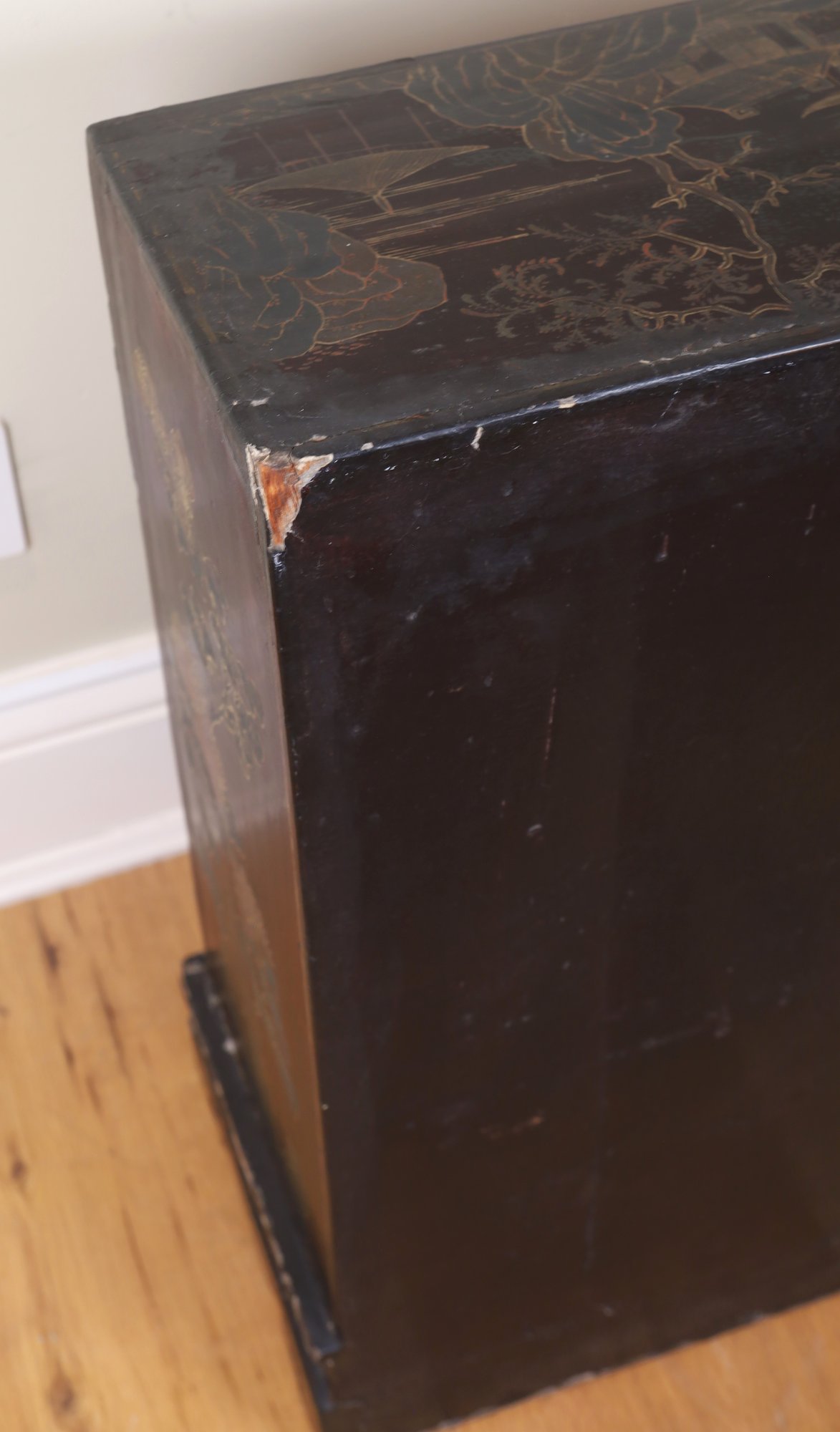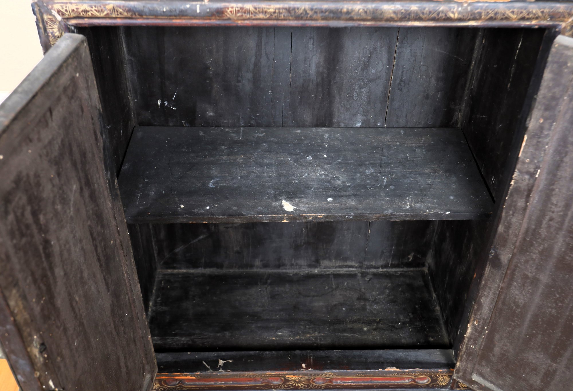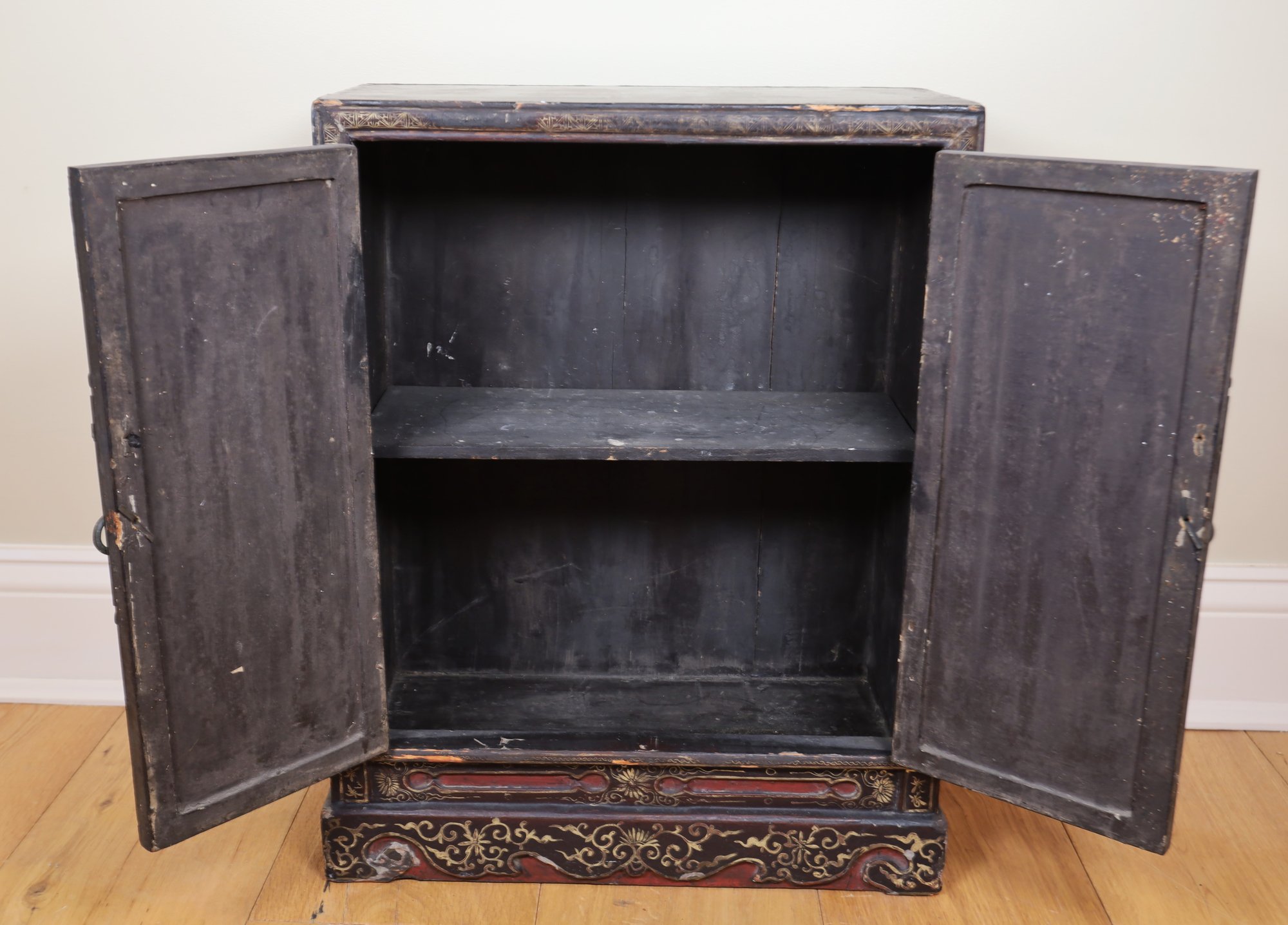 2 of 2 petite Early Chinese cabinet. Red and black with tons of detail. Red and black wooden cabinet with lovely figural scenes, Flowers, and landscape. It is an old brass lock with original hardware and one shelf inside.
