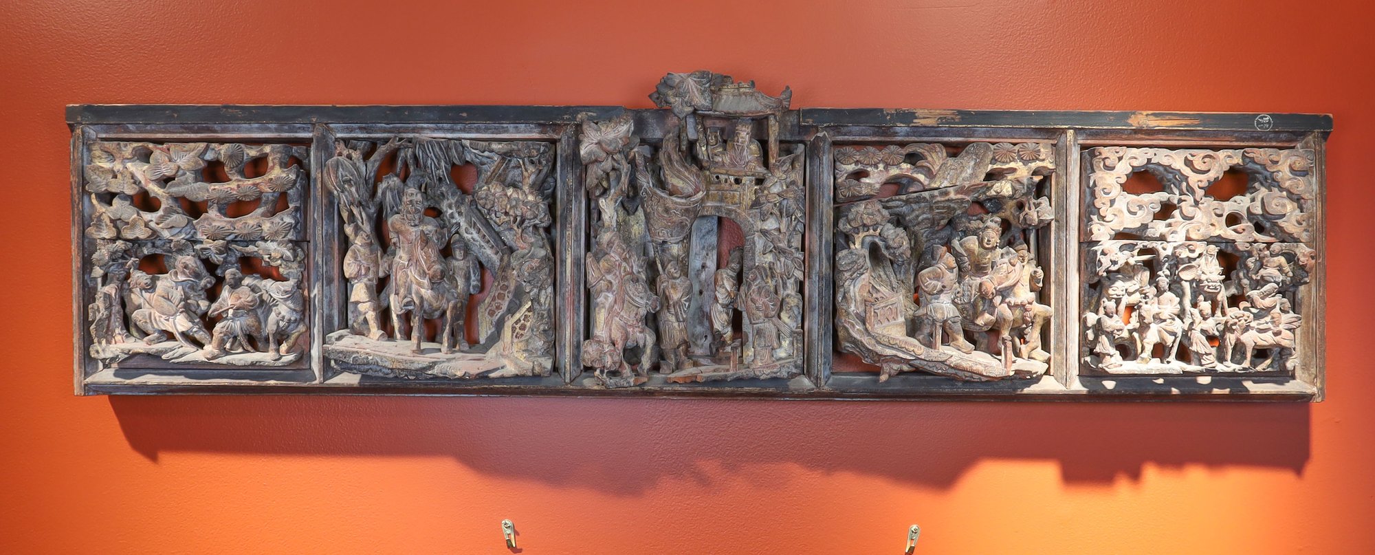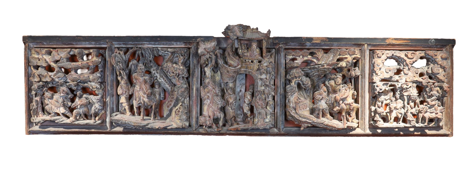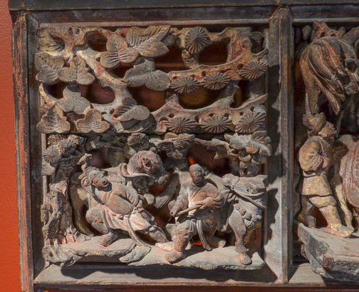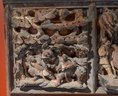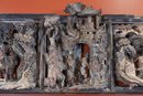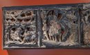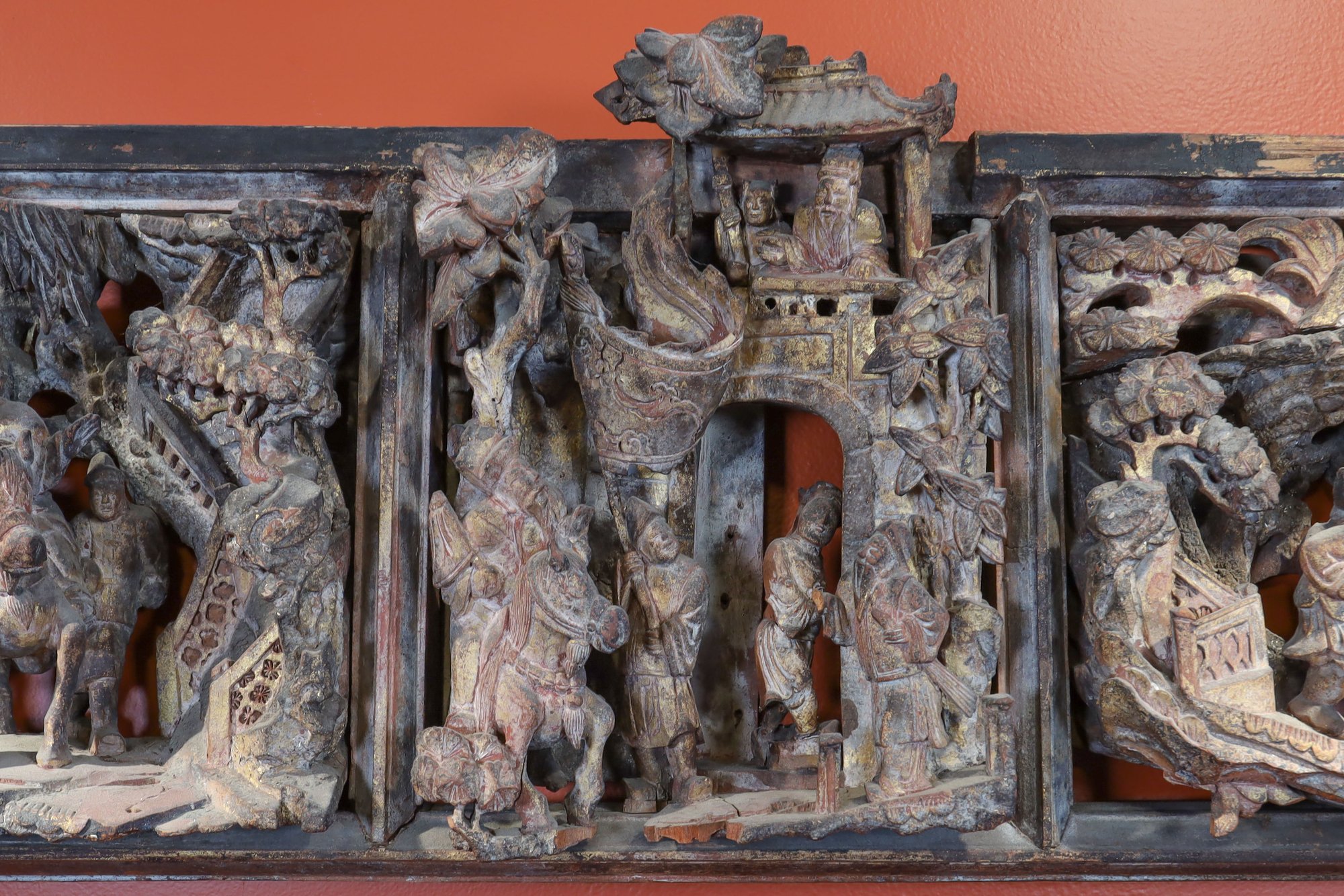This antique Chinese carving panels are intricately detailed with depictions of Chinese figures, warriors, animals, and more. Although the gilding has worn, the panels remain exceptionally well executed.