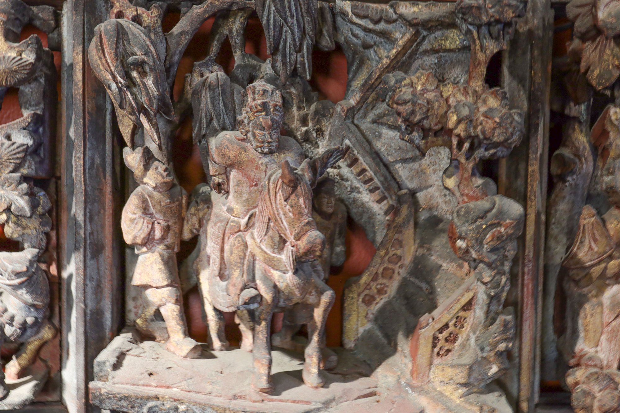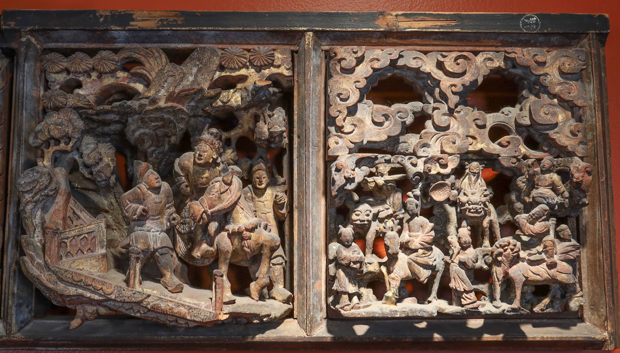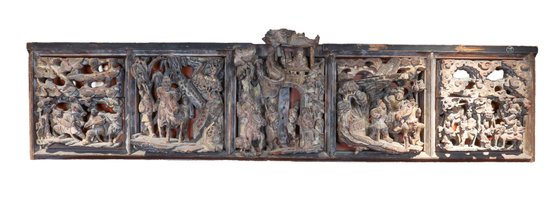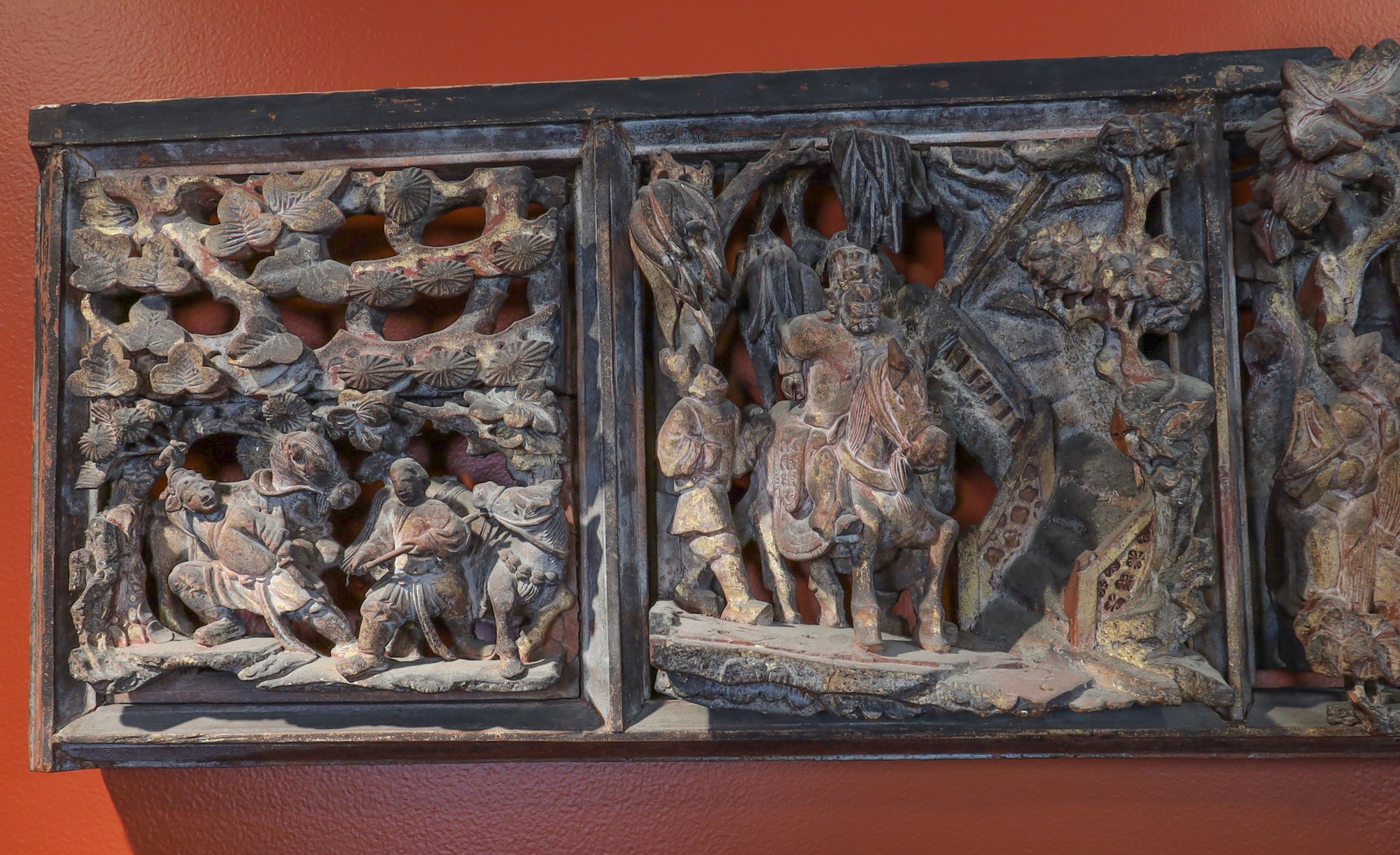 This antique Chinese carving panels are intricately detailed with depictions of Chinese figures, warriors, animals, and more. Although the gilding has worn, the panels remain exceptionally well executed.