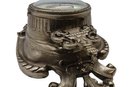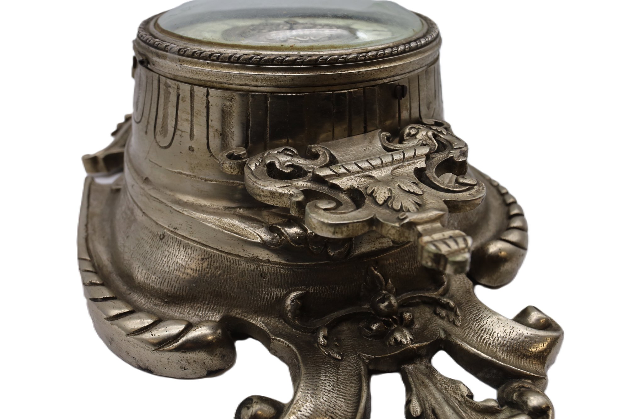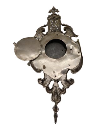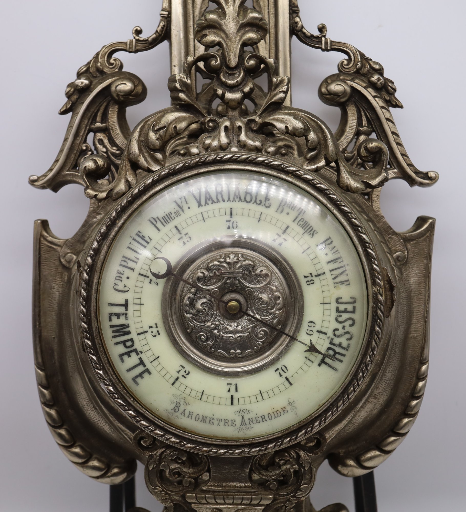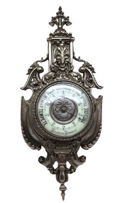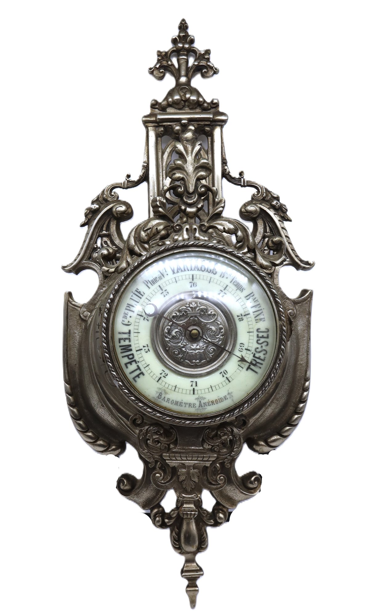 Antique French Barometer with porcelain face with a fantastic scrolled silvered metal case. The face is fitted with a pointer and marked with French readings. 21.5"H x 9"W