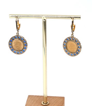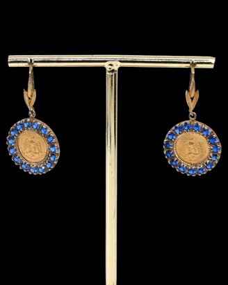Dangle earrings with a round gold 1945 coin bezel-set within a circle of blue gemstones.